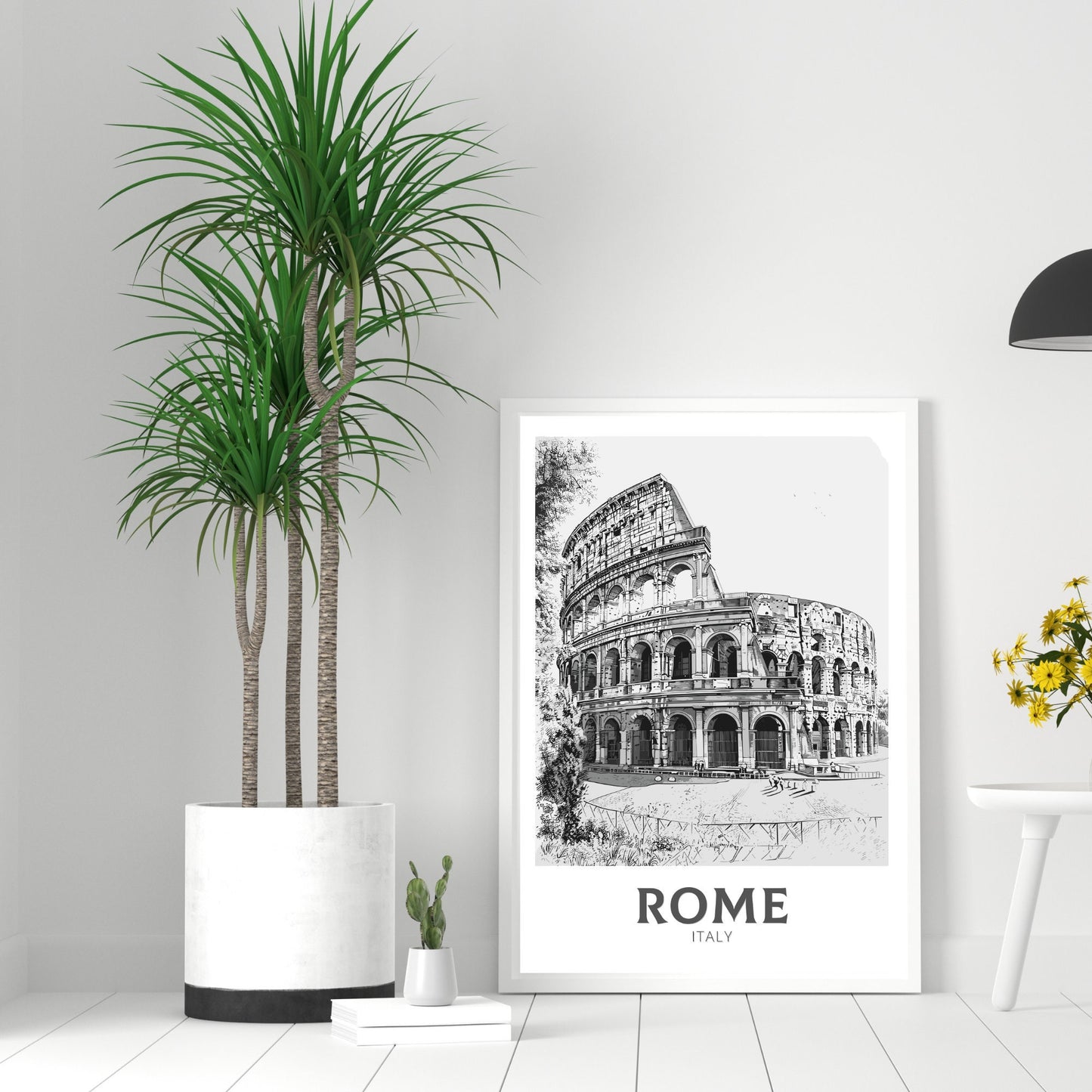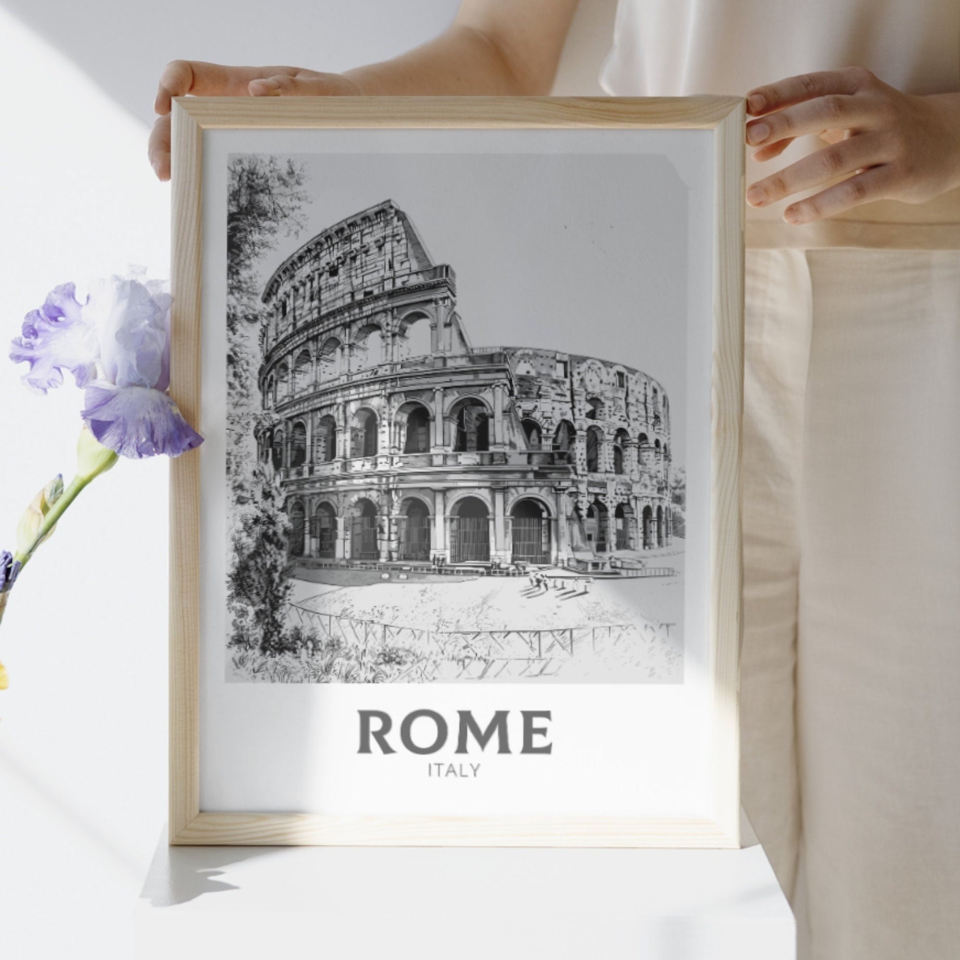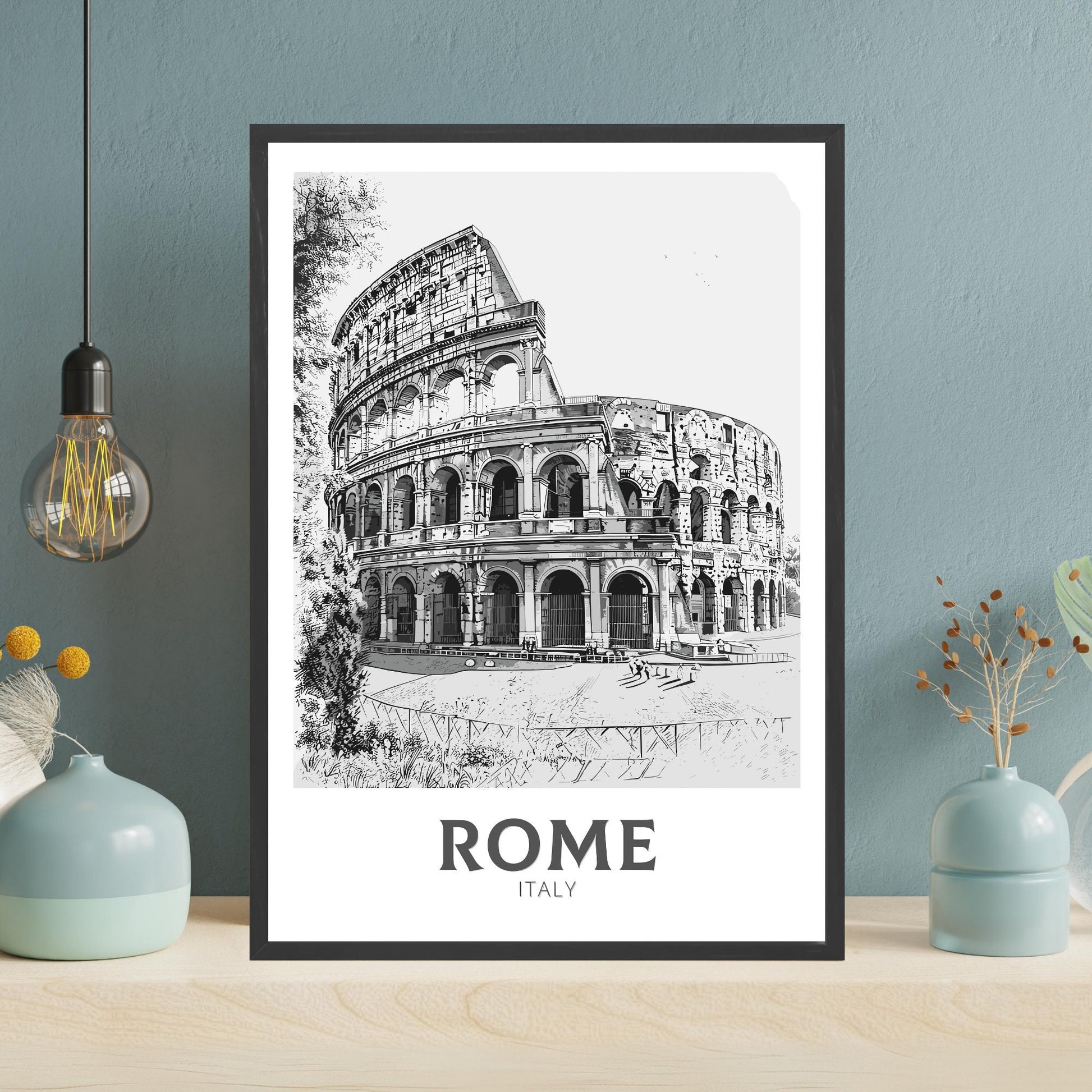 Faites entrer la Ville Éternelle chez vous avec cette affiche de voyage de Rome en noir et blanc . Mettant en vedette des monuments emblématiques comme le Colisée, le Forum romain et les rues intemporelles de la ville, cette œuvre minimaliste met en valeur l'élégance et l'histoire de la capitale italienne dans un style monochrome raffiné.