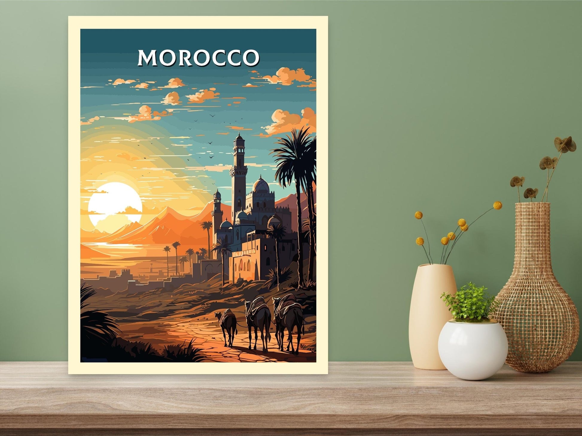 Notre affiche de voyage Sahara – Désert marocain rétro – plonge votre espace dans les vastes dunes du désert marocain avec son design nostalgique. Idéale pour les passionnés de voyages et d'art rétro, elle capture le sable doré et les nuits étoilées du Sahara dans un style intemporel. Que vous ayez campé sous son ciel ou rêvé de son immensité, cette affiche Sahara rétro sera un ajout magnifique à votre décoration.