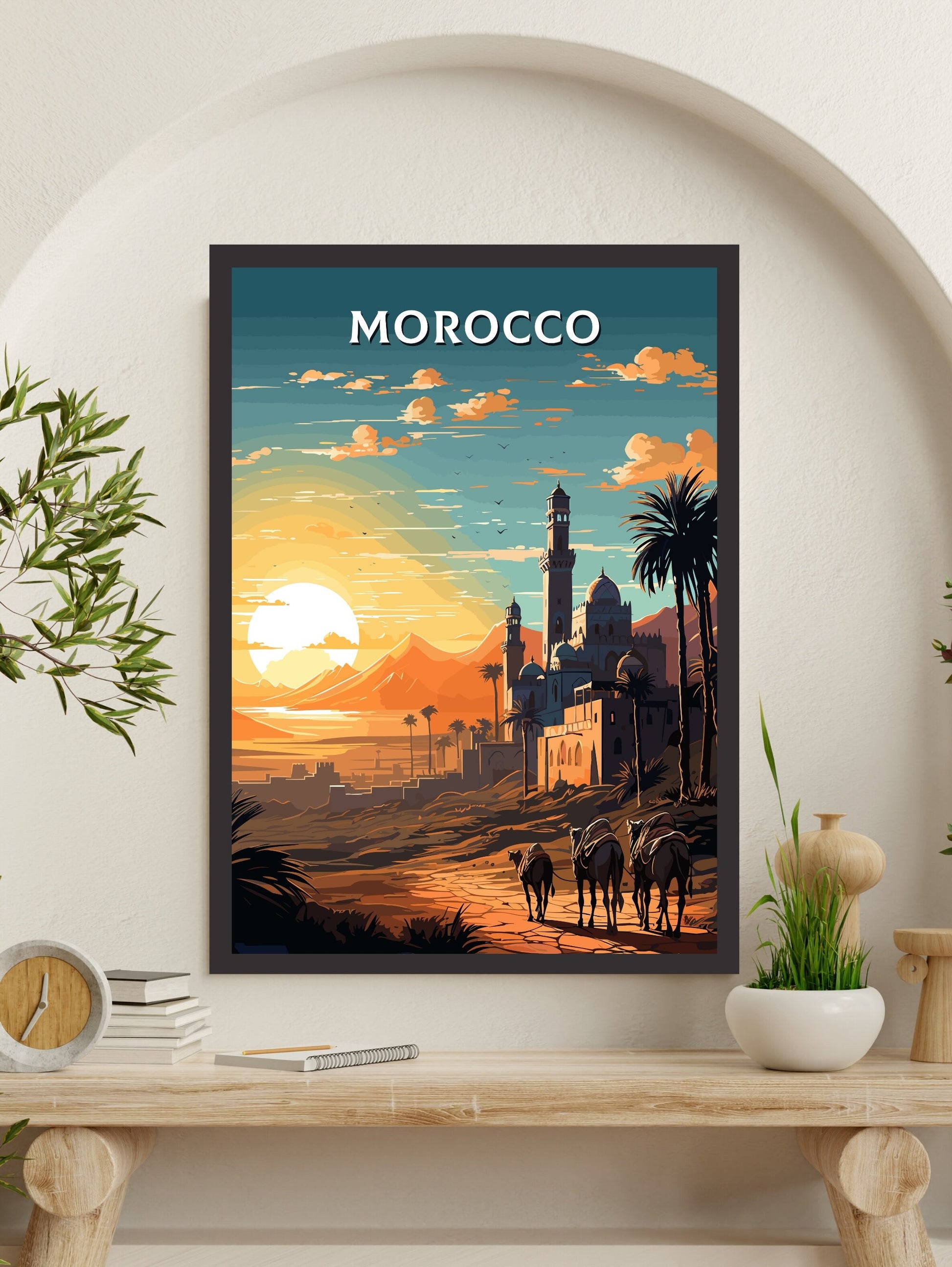 Cette œuvre mêle des ors chaleureux et des oranges profonds à l'essence infinie du désert, évoquant le charme d'un voyage vintage avec une touche de modernité. Imprimée sur un papier de qualité supérieure, elle offre un éclat durable et un fini lisse, ce qui en fait un cadeau idéal pour les aventuriers ou les collectionneurs d'art. Cette affiche du Maroc apporte une touche de nostalgie du désert à tous vos murs.