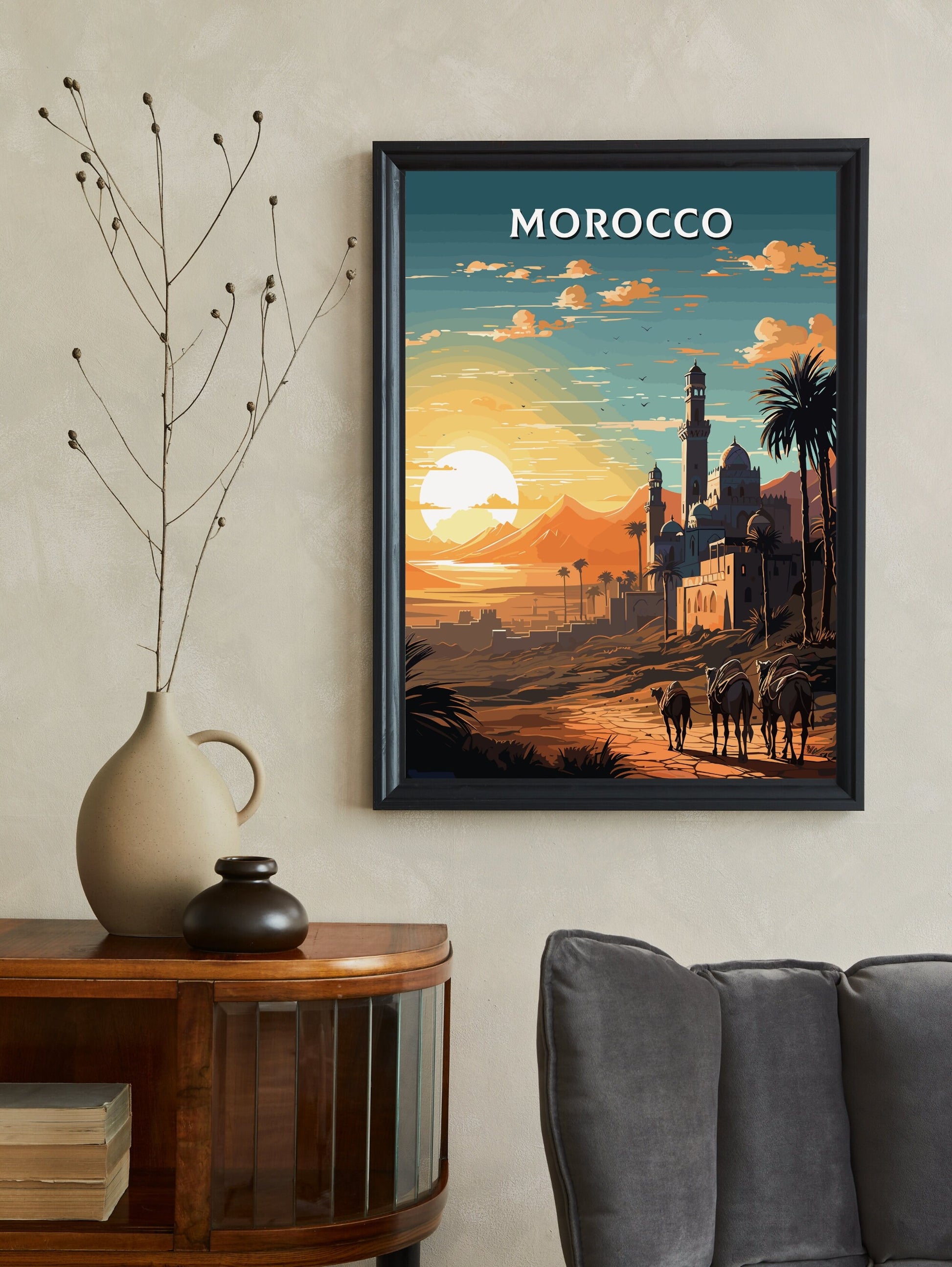 Transformez votre intérieur en un havre de paix et de sérénité grâce à cette œuvre captivante. Idéale pour un salon, un bureau ou un espace inspiré du voyage, elle s'associe parfaitement à d'autres œuvres d'art rétro. Plus qu'un simple objet décoratif, cette œuvre « Désert marocain rétro » est un voyage au cœur des étendues sablonneuses du Maroc.