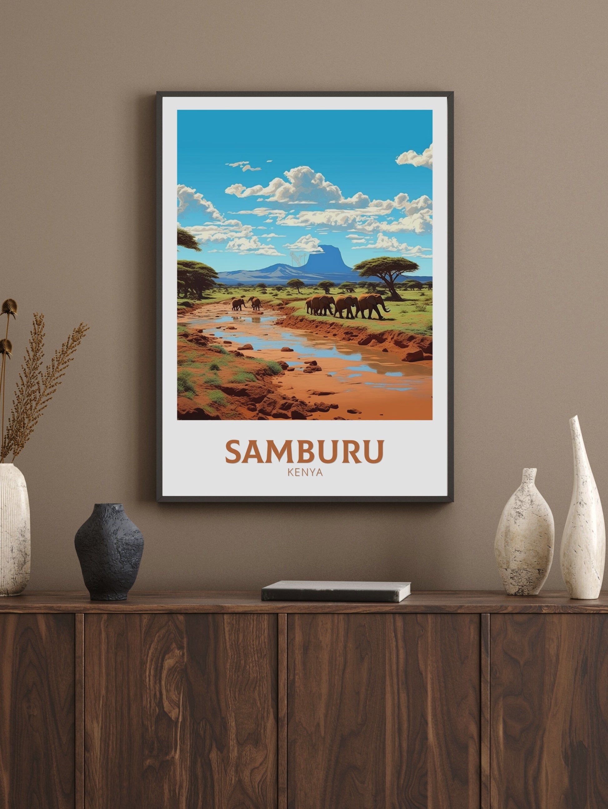 Transformez votre intérieur en un havre de paix grâce à cette œuvre captivante. Idéale pour un salon, un bureau ou un espace inspiré du voyage, elle s'harmonise parfaitement avec d'autres œuvres d'art animalier. Cette affiche Parc National est bien plus qu'un simple objet décoratif : c'est un voyage dans la nature sauvage unique de Samburu.