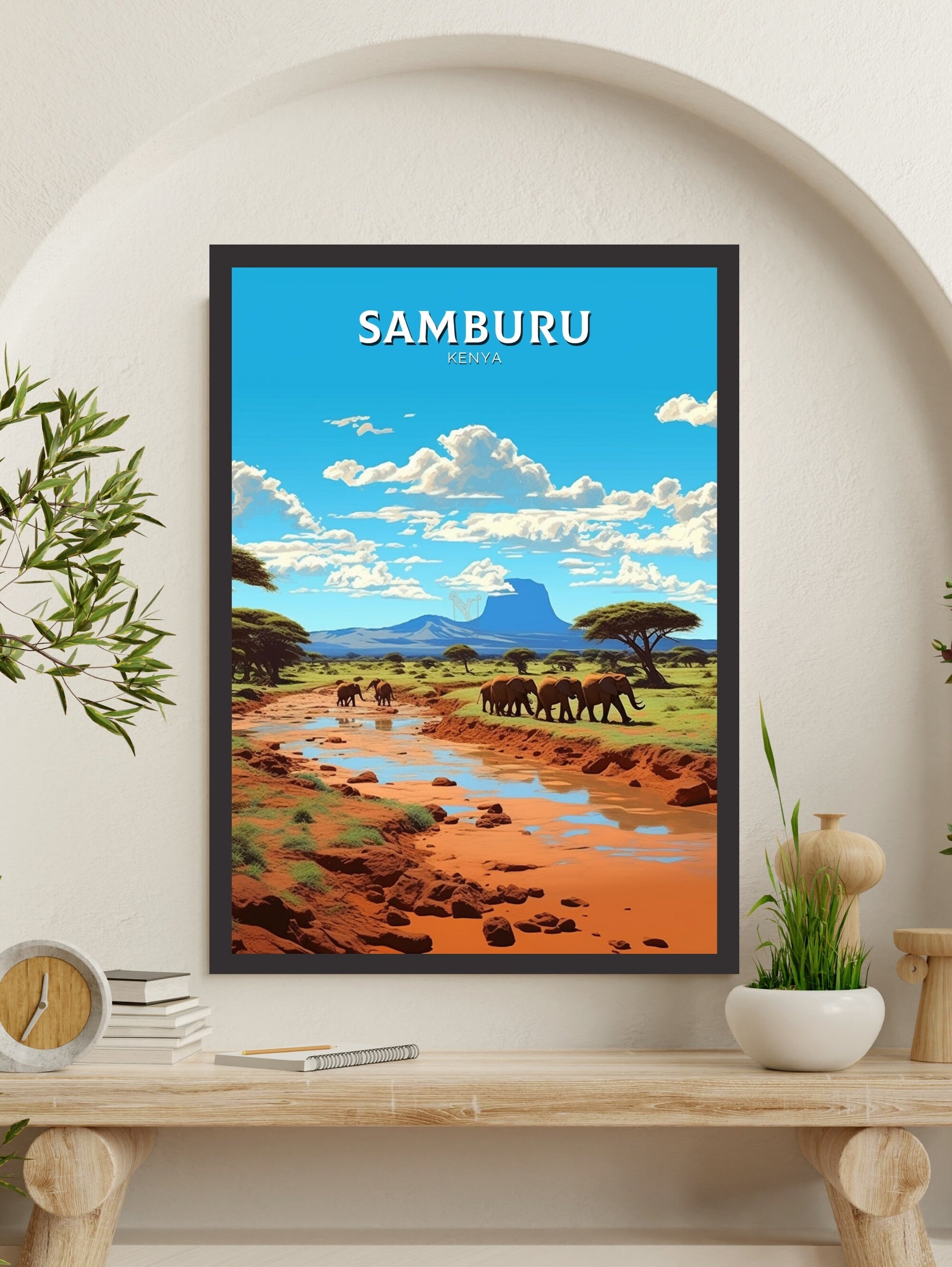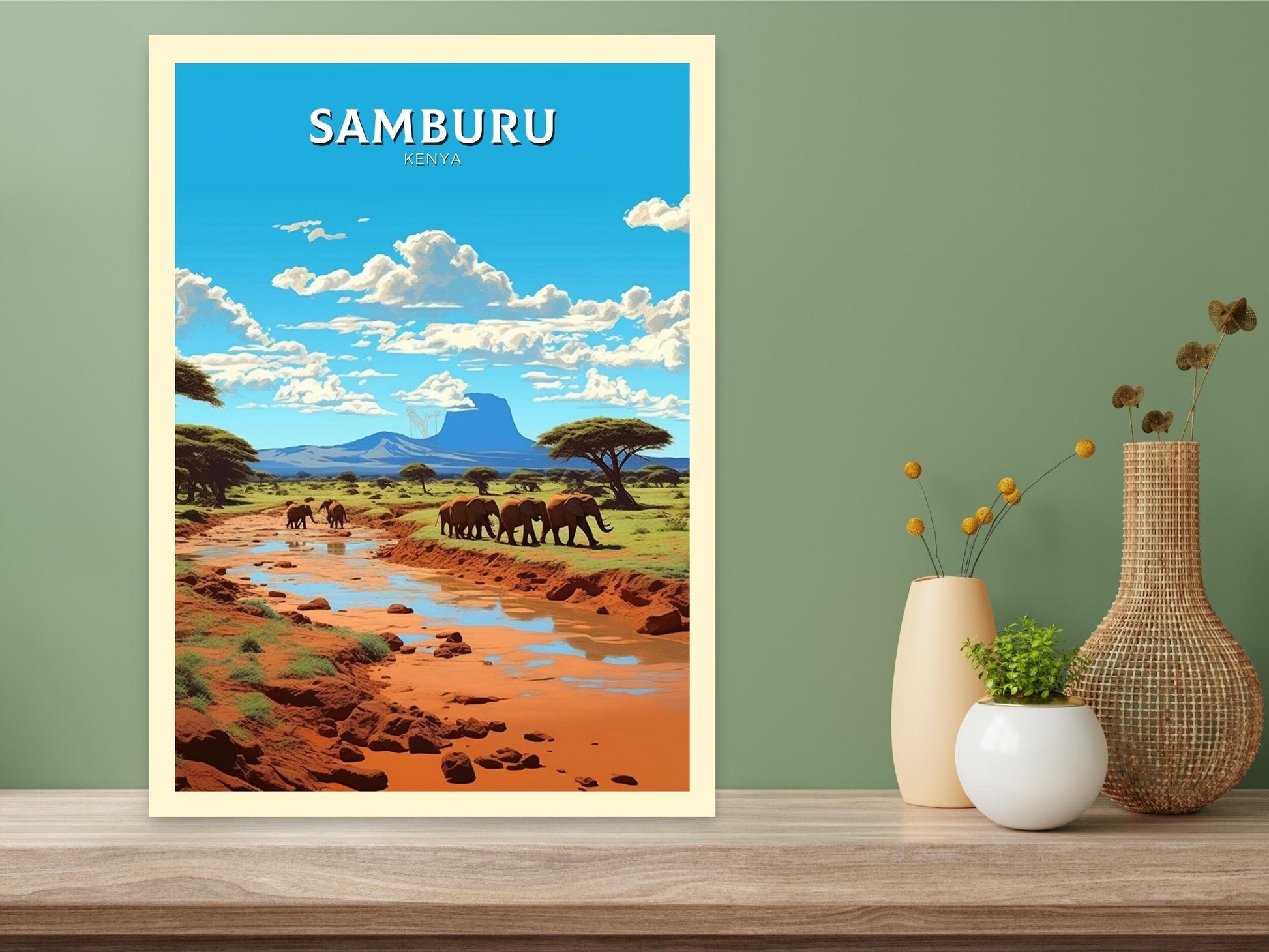 Cette œuvre mêle des rouges poudrés et des teintes dorées à l'essence sauvage de Samburu, évoquant le charme d'un voyage vintage avec une touche de modernité. Imprimée sur un papier de qualité supérieure, elle offre un éclat durable et une finition lisse, ce qui en fait un cadeau idéal pour les aventuriers ou les collectionneurs d'art. Cette affiche Kenya Art apporte une touche de nostalgie safari à tous vos murs.