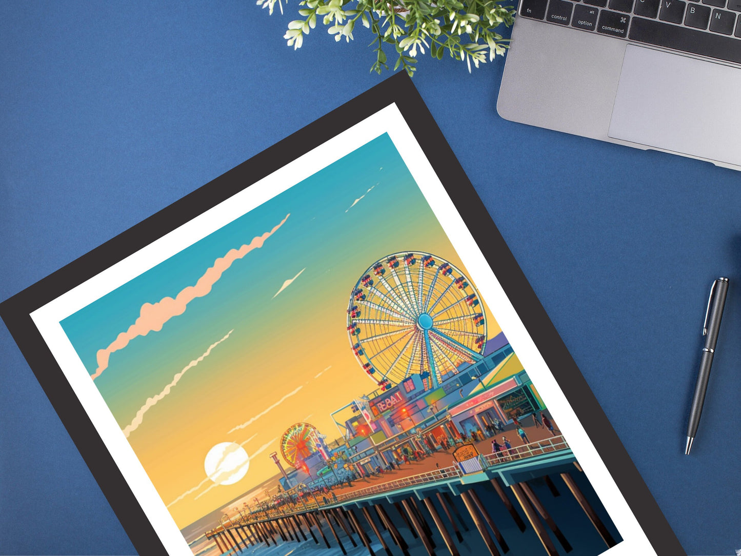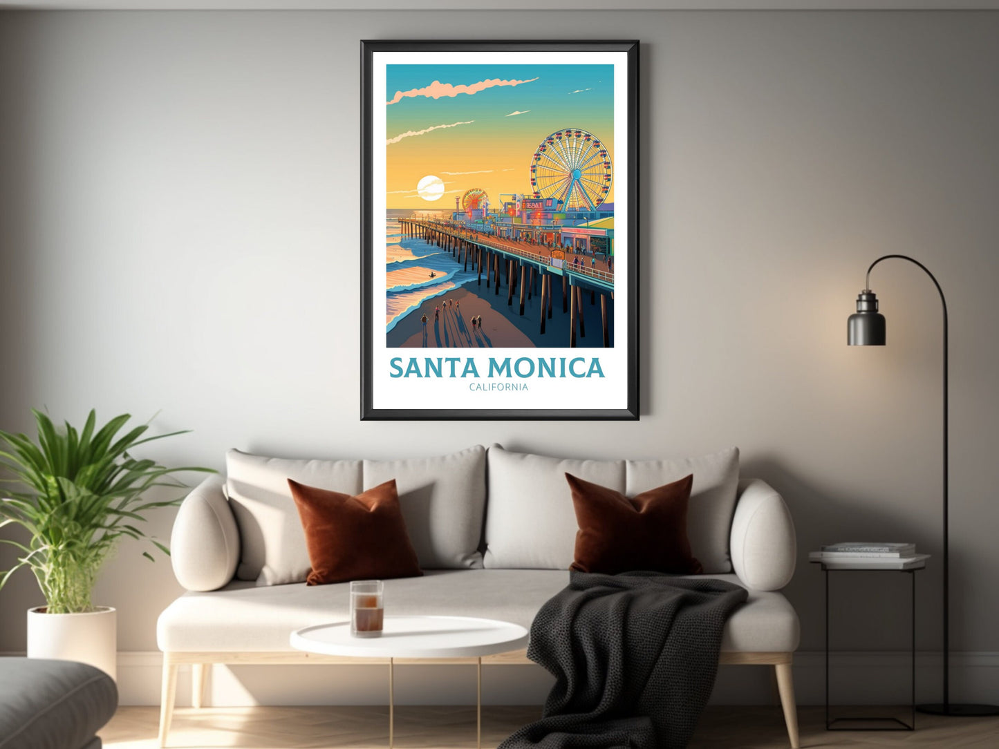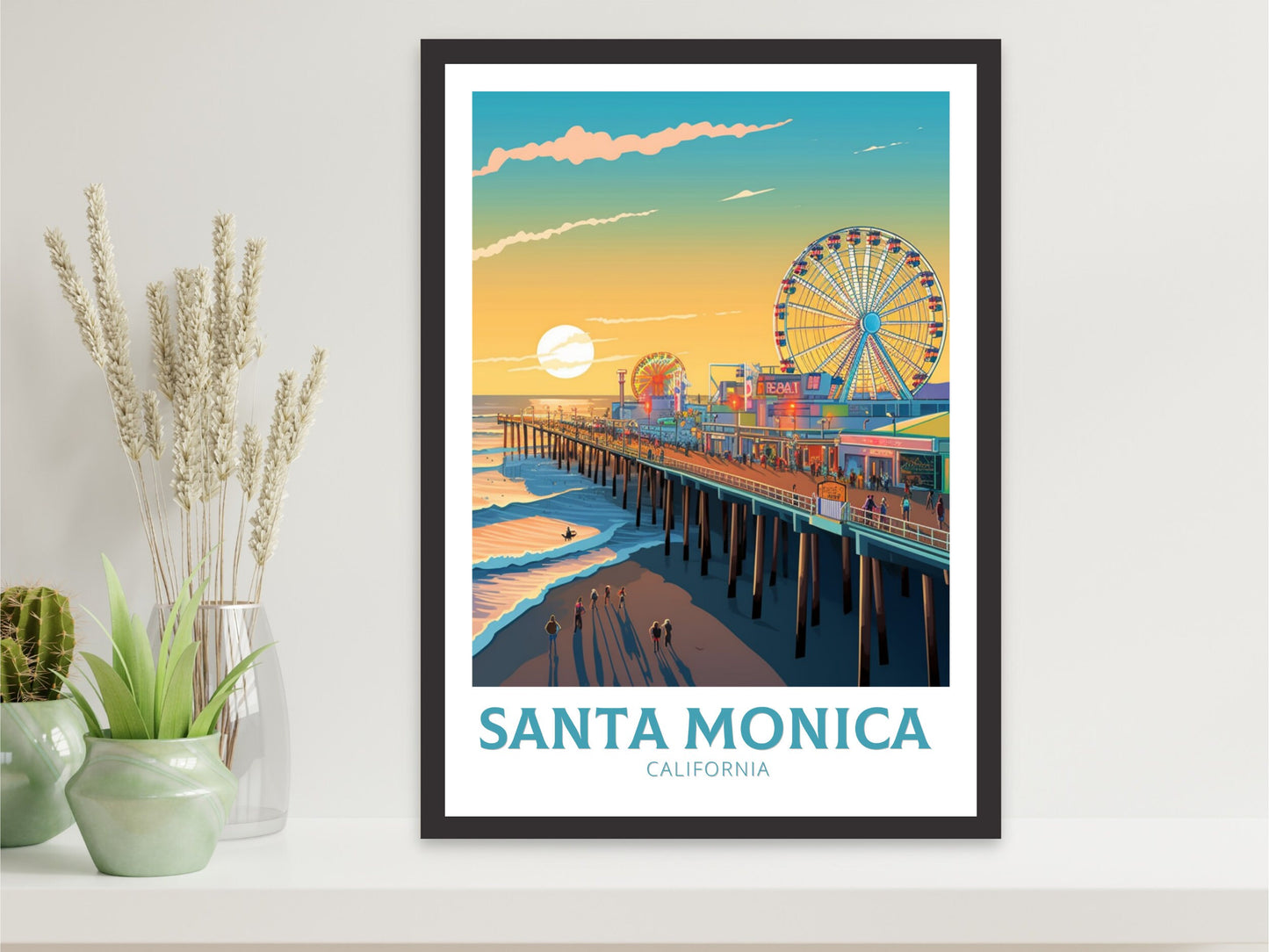 Disponible en téléchargement numérique ou en tirage physique premium , cette affiche de voyage de Santa Monica est disponible en plusieurs formats, du format A au format 30 x 40 pouces. Idéale pour la décoration intérieure, les bureaux ou comme cadeau original pour les amoureux de la beauté côtière californienne.