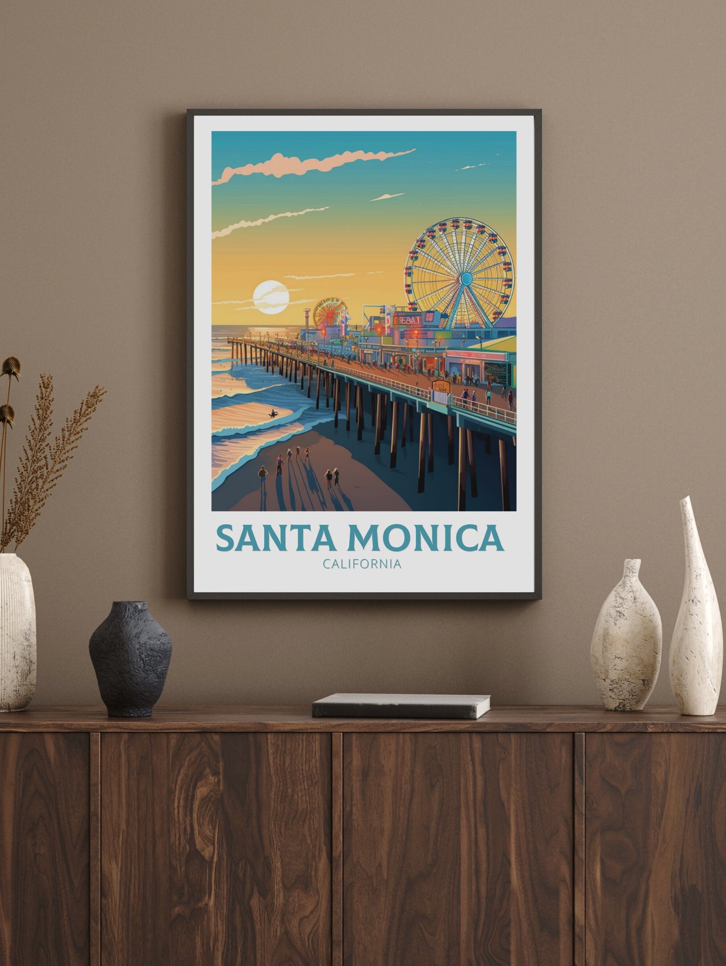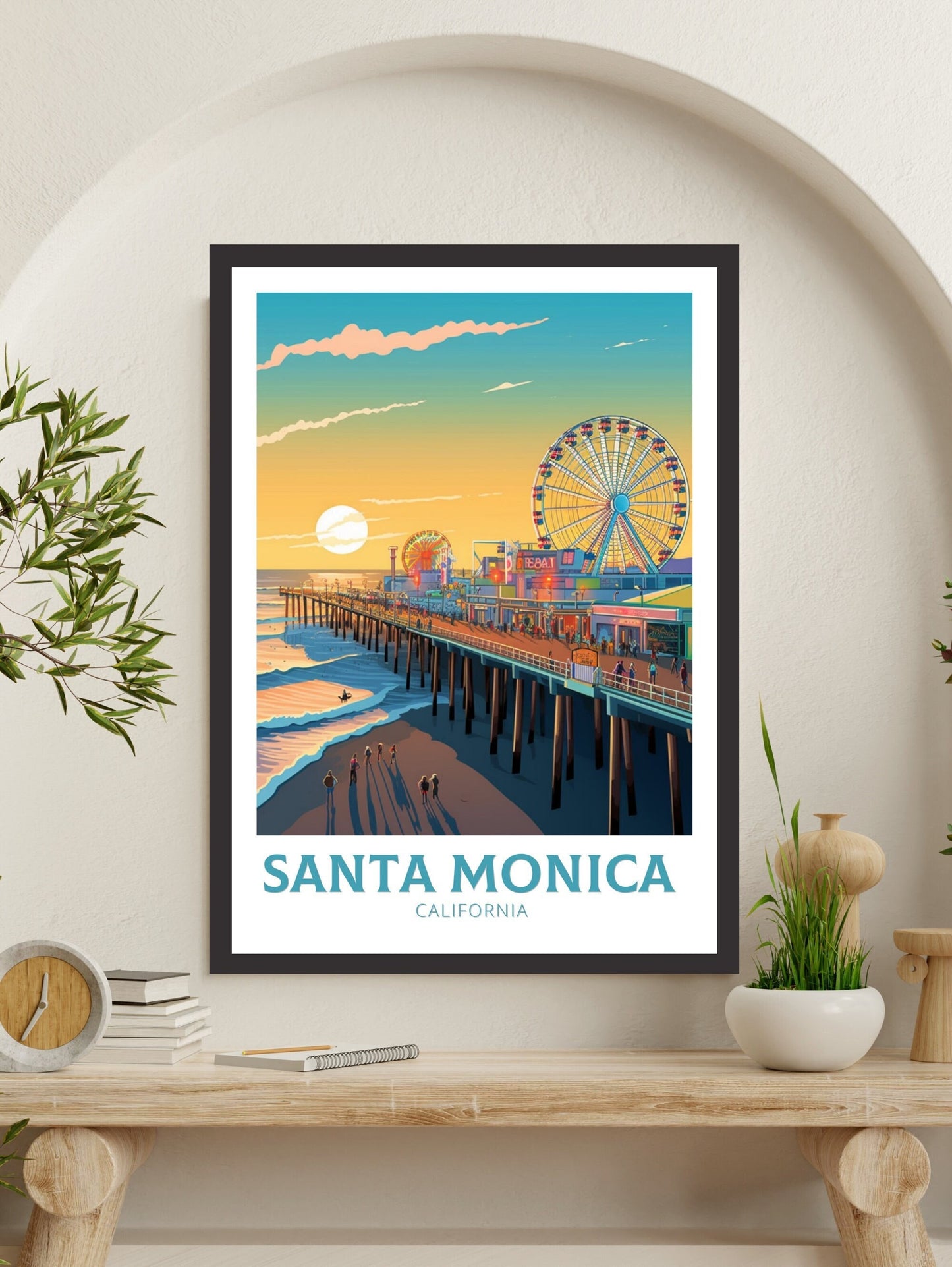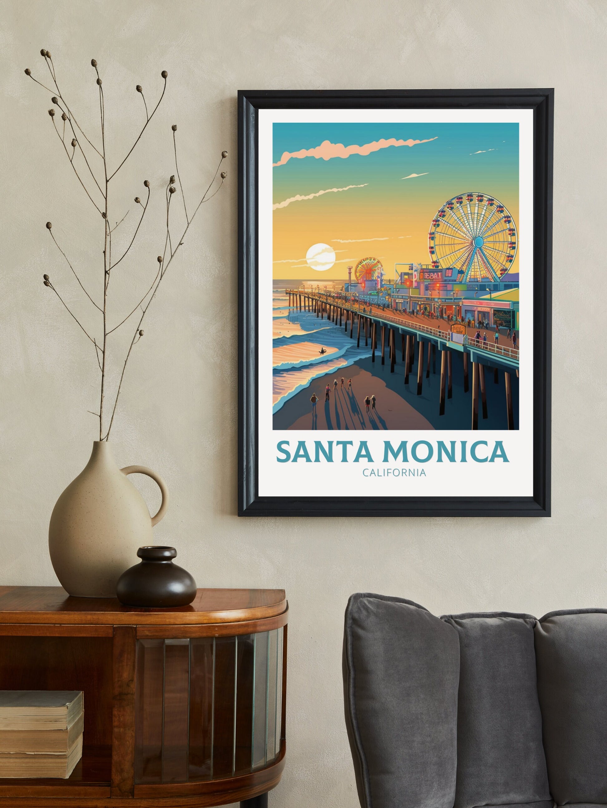 Faisant partie de notre collection d'impressions de voyage en Amérique du Nord , cette affiche de voyage de Santa Monica se marie à merveille avec d'autres œuvres d'art de la ville et des parcs nationaux, vous permettant de créer un mur de galerie organisé qui célèbre votre amour du voyage et des destinations emblématiques.