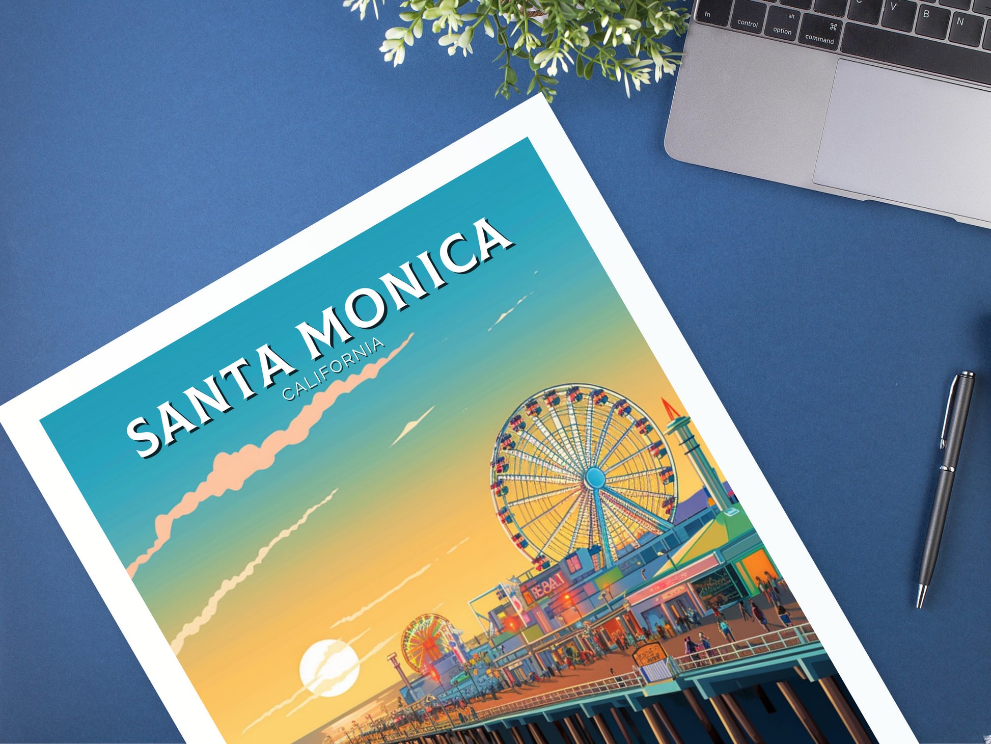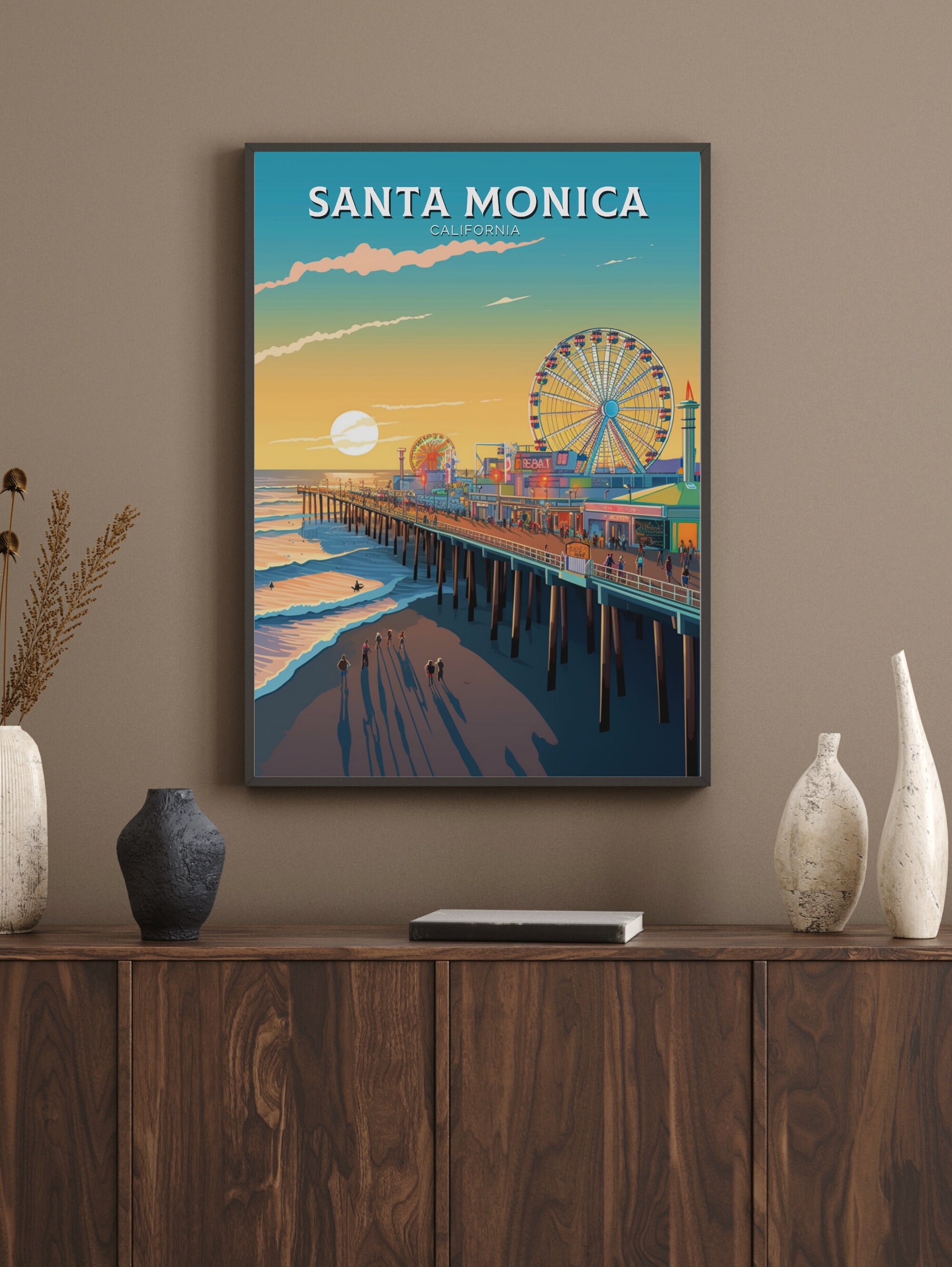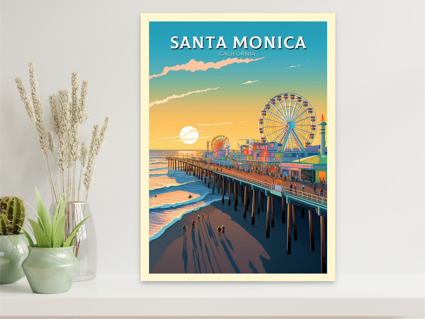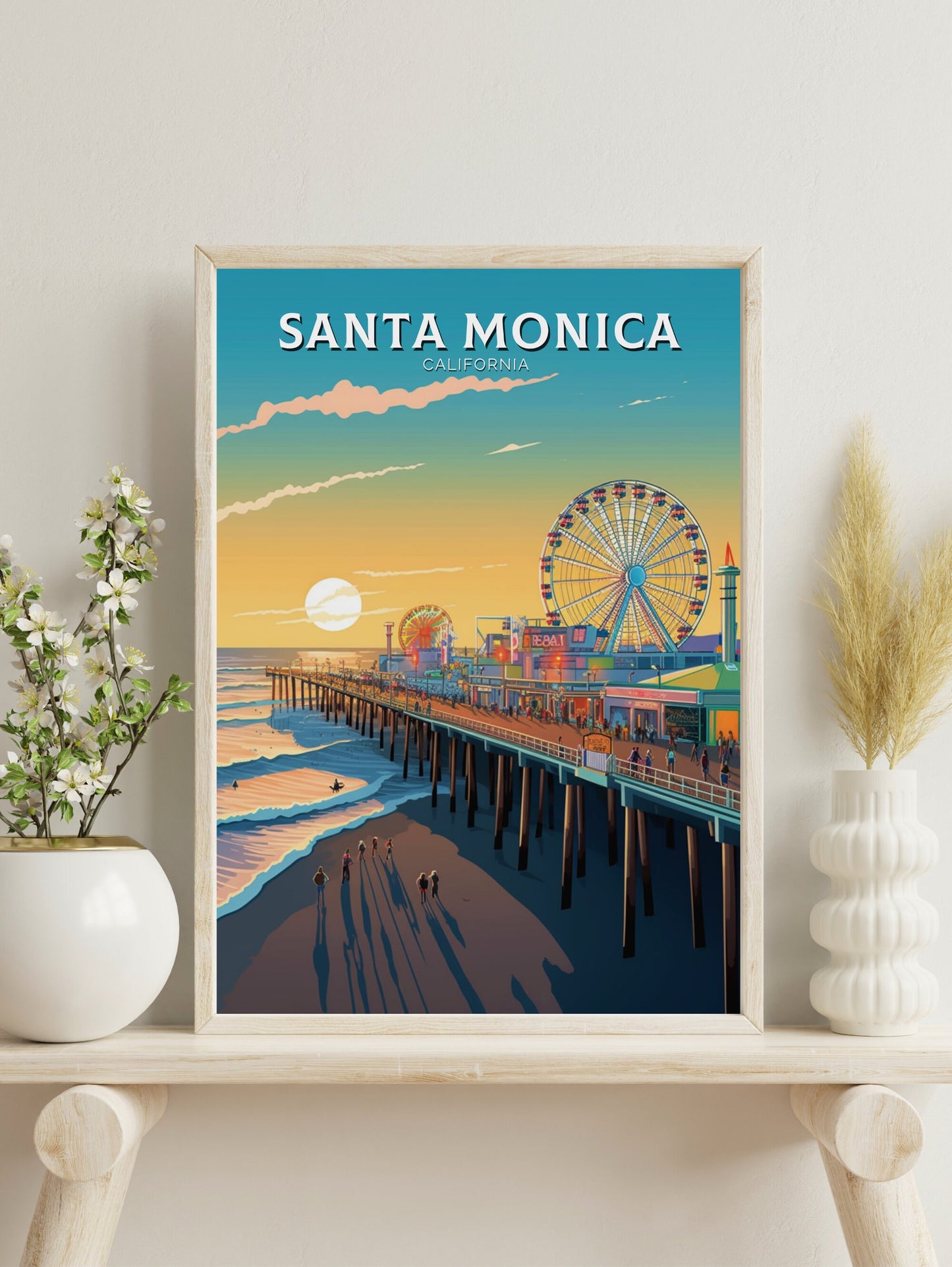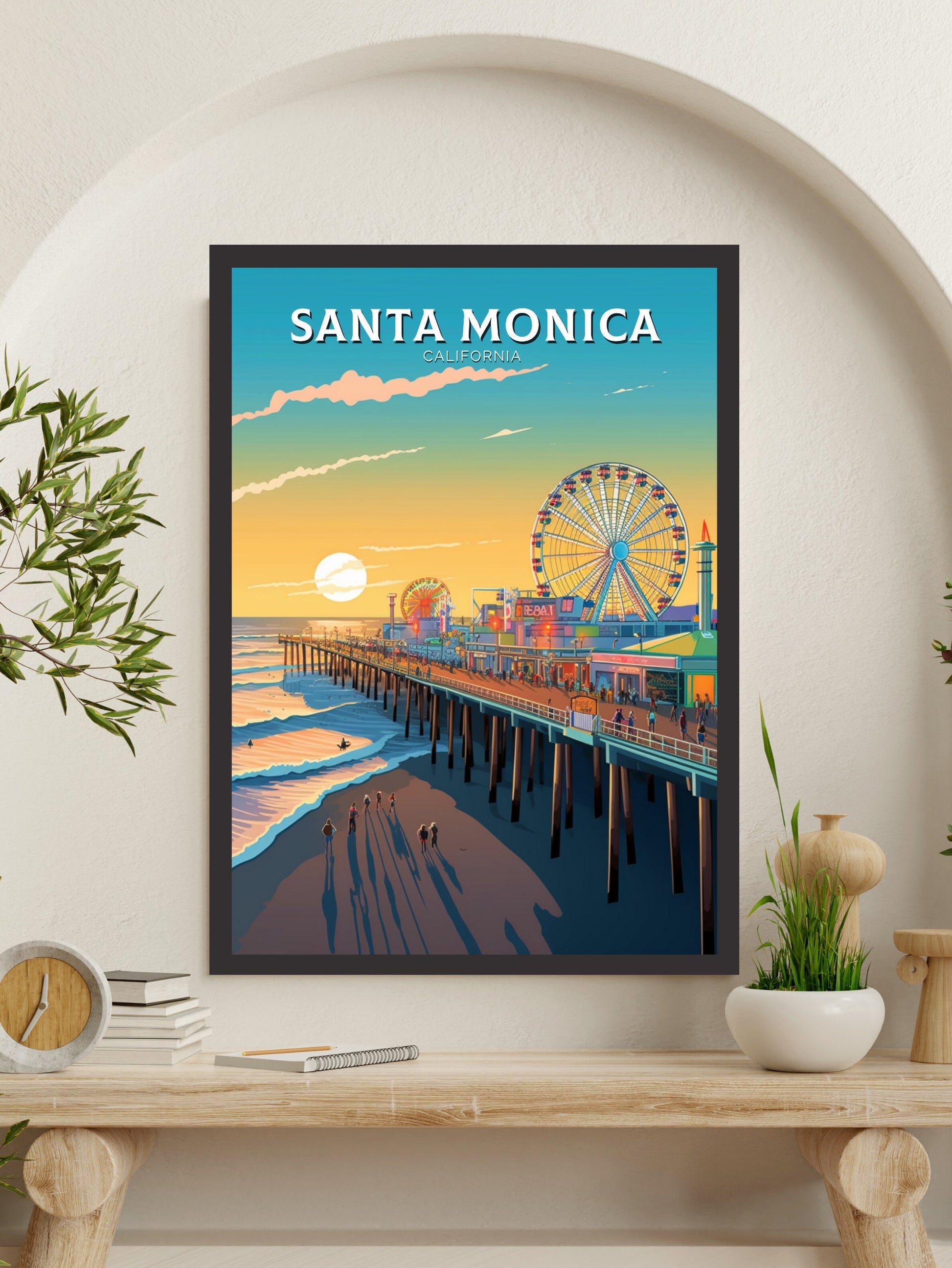 Faisant partie de notre collection d'impressions de voyage en Amérique du Nord , cette impression de voyage de Santa Monica se marie à merveille avec d'autres œuvres d'art de la ville, de la côte et des parcs nationaux, vous permettant de créer un superbe mur de galerie inspiré du voyage.