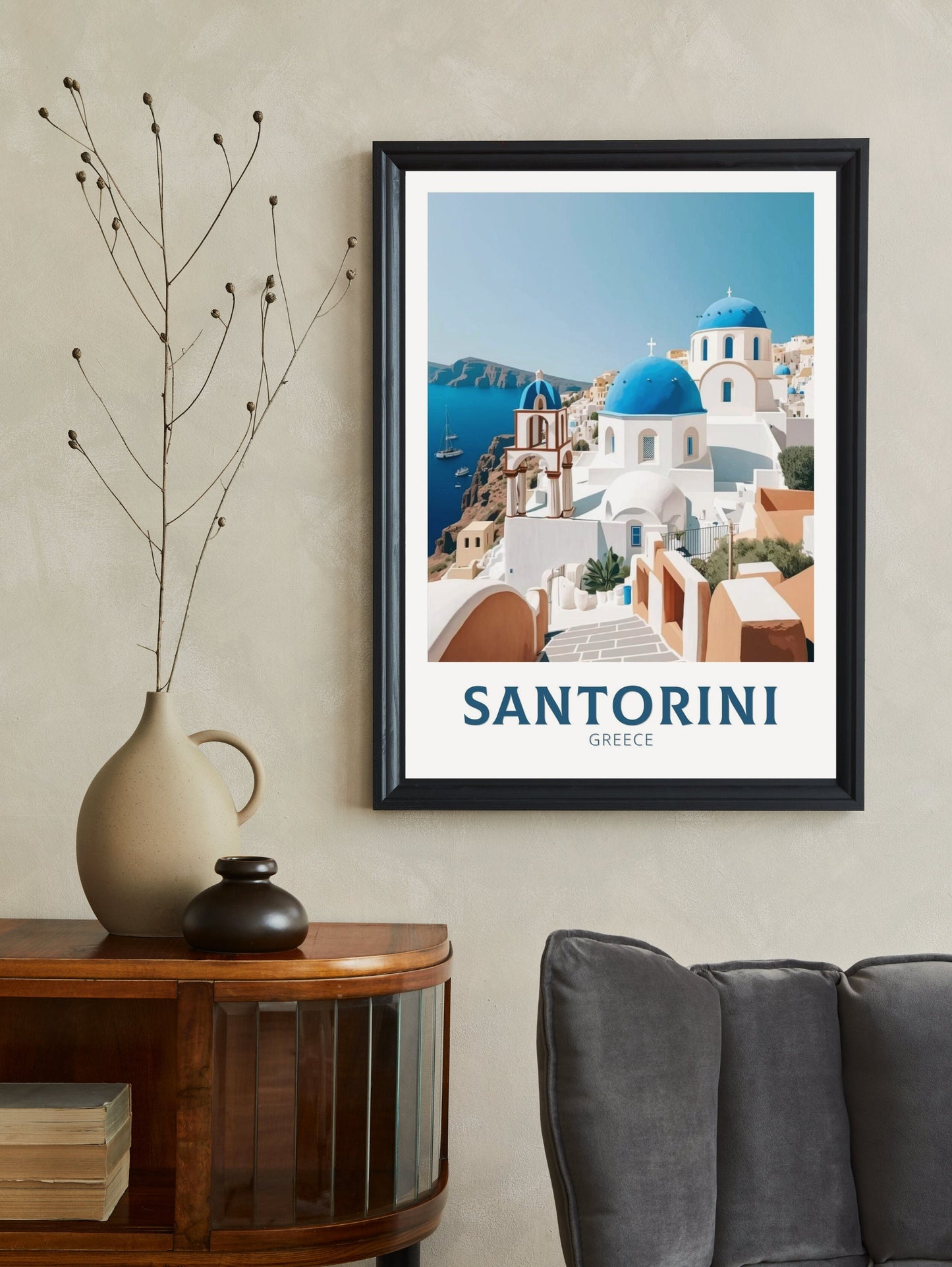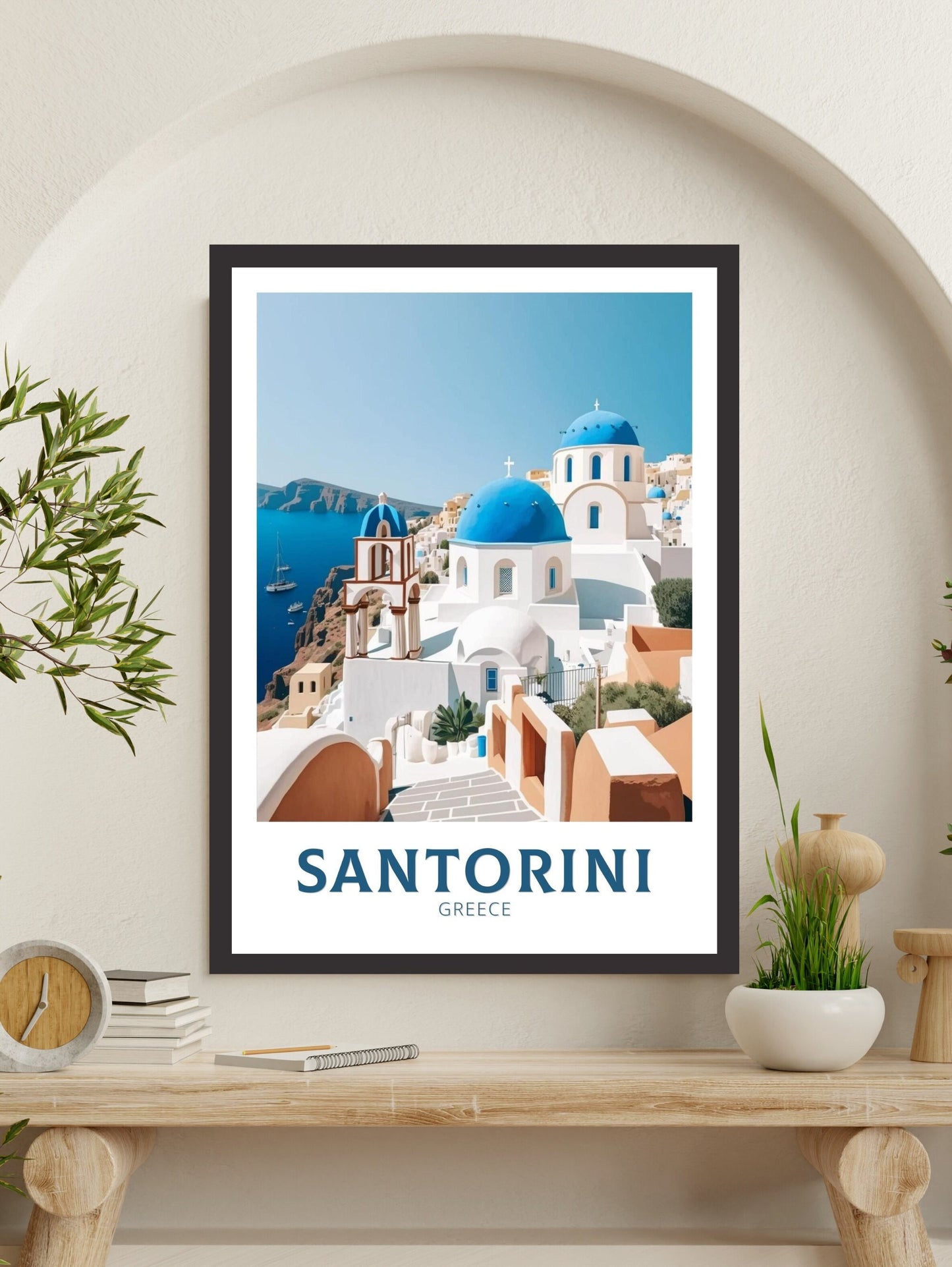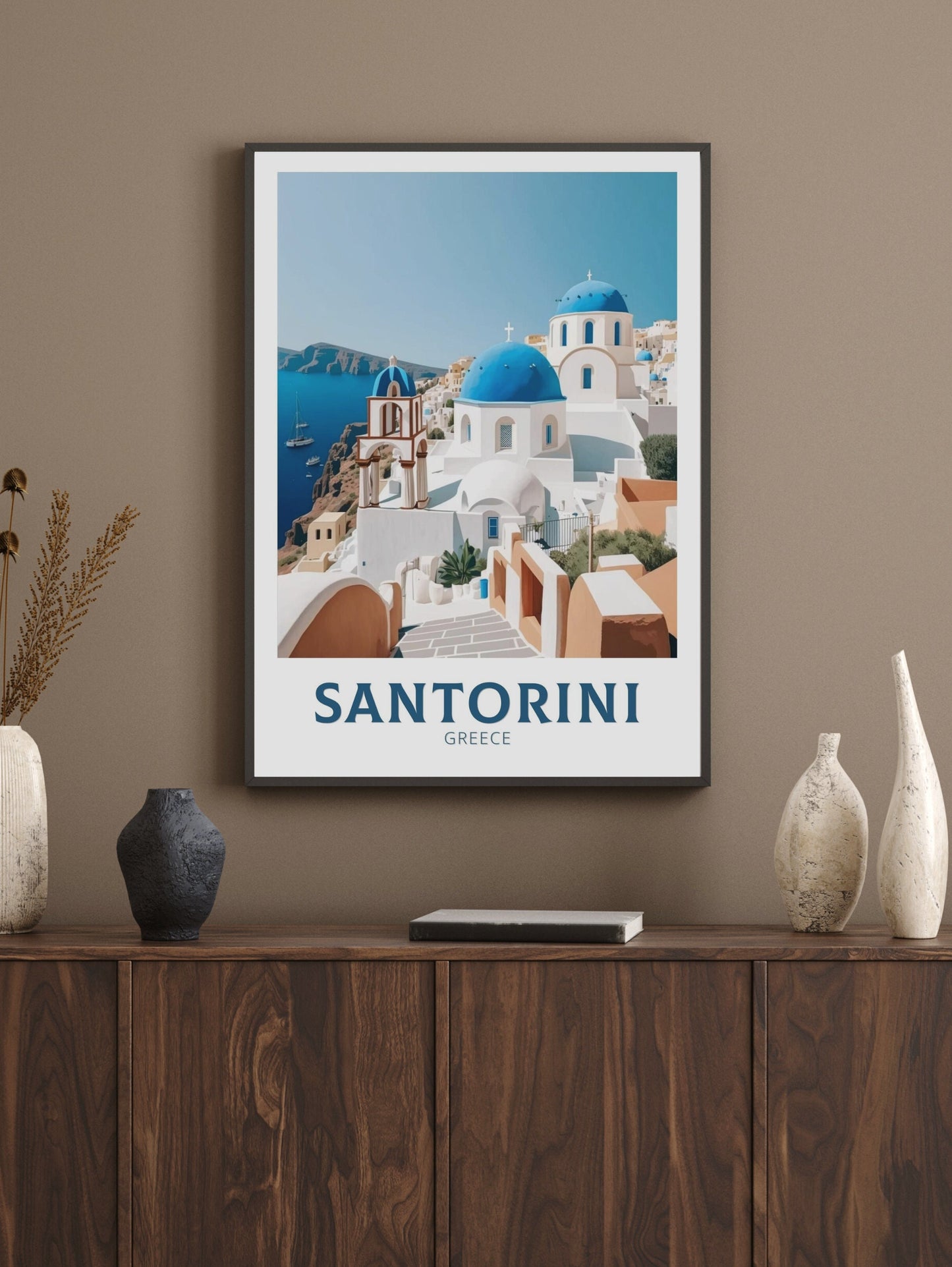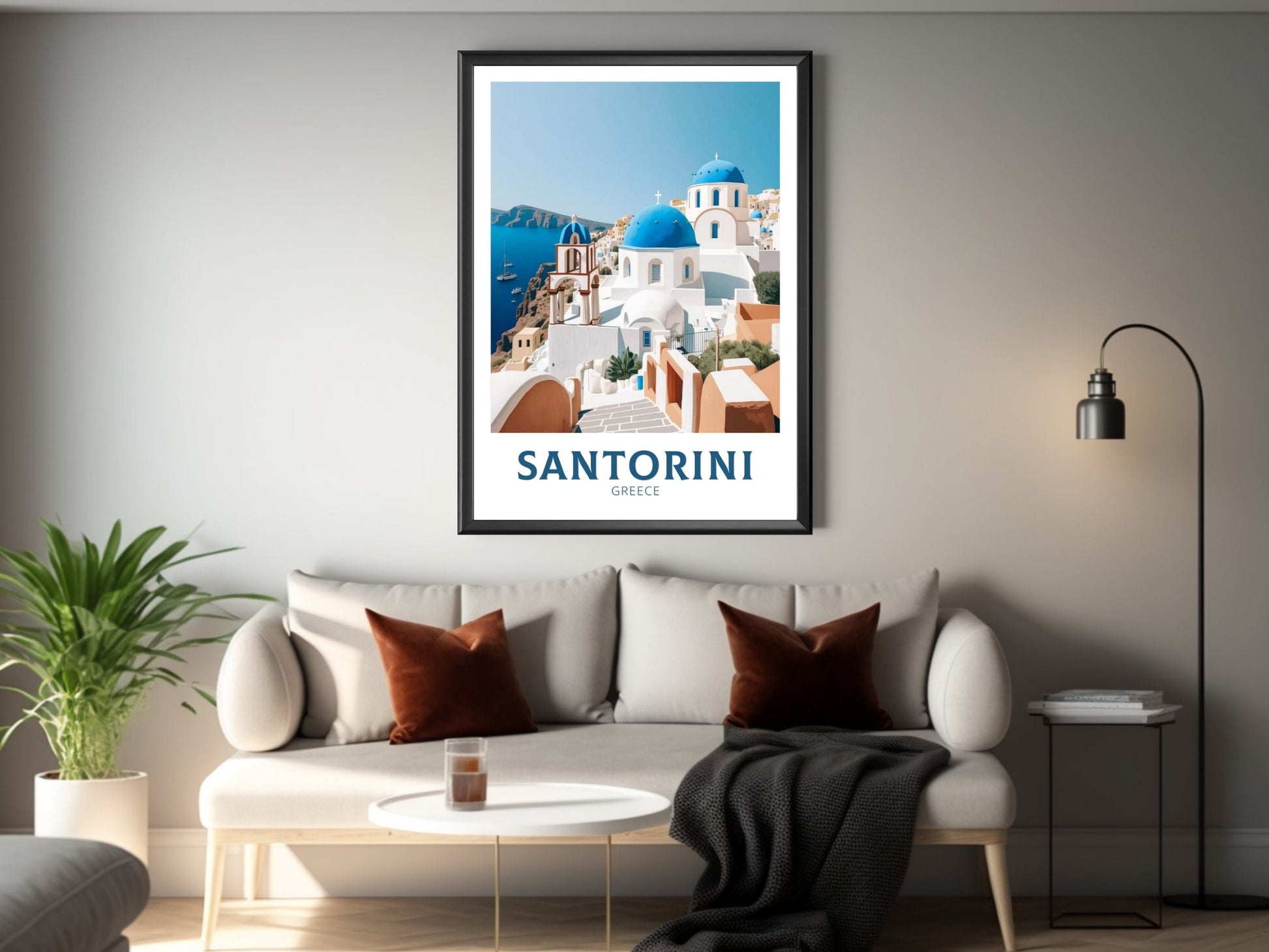 Découvrez la beauté enchanteresse des îles grecques avec cette magnifique affiche de voyage de Santorin . Cette affiche grecque met en valeur les églises emblématiques aux dômes bleus et l'éblouissante architecture blanche surplombant la mer Égée scintillante, apportant un peu de magie de Santorin à votre maison ou votre bureau. Idéale pour les passionnés de voyages et les amoureux de la décoration méditerranéenne, cette affiche murale capture parfaitement l'essence sereine et pittoresque de Santorin.