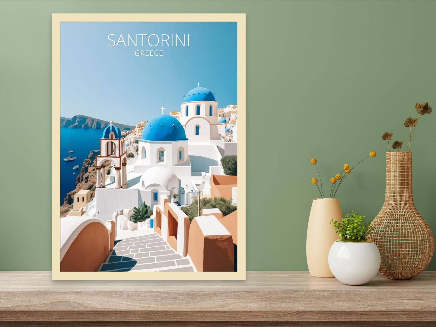 Ajoutez une touche de charme méditerranéen à votre intérieur avec cette magnifique décoration murale voyage à Santorin . Cette affiche de Grèce capture l'emblématique skyline de Santorin, avec ses bâtiments blancs classiques et ses dômes bleus se détachant sur l'éblouissante mer Égée. Idéale pour les amoureux de voyages et les amateurs d'esthétique des îles grecques, cette décoration murale apporte l'esprit de Santorin à n'importe quelle pièce.