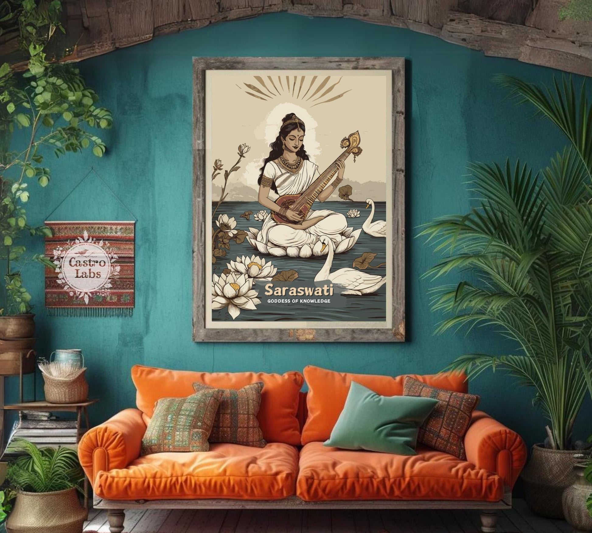 Notre affiche Saraswati, œuvre d'art mythologique hindoue, s'intègre harmonieusement à votre intérieur grâce à son design lumineux. Parfaite pour les passionnés de mythologie et les chercheurs de savoir, elle représente Saraswati, déesse hindoue de la sagesse et des arts, jouant de la veena sur un fond de lotus serein. Que vous vénériez son intellect ou que vous aimiez l'art sacré, cette affiche mythologique Saraswati apportera une touche d'élégance à votre décoration.