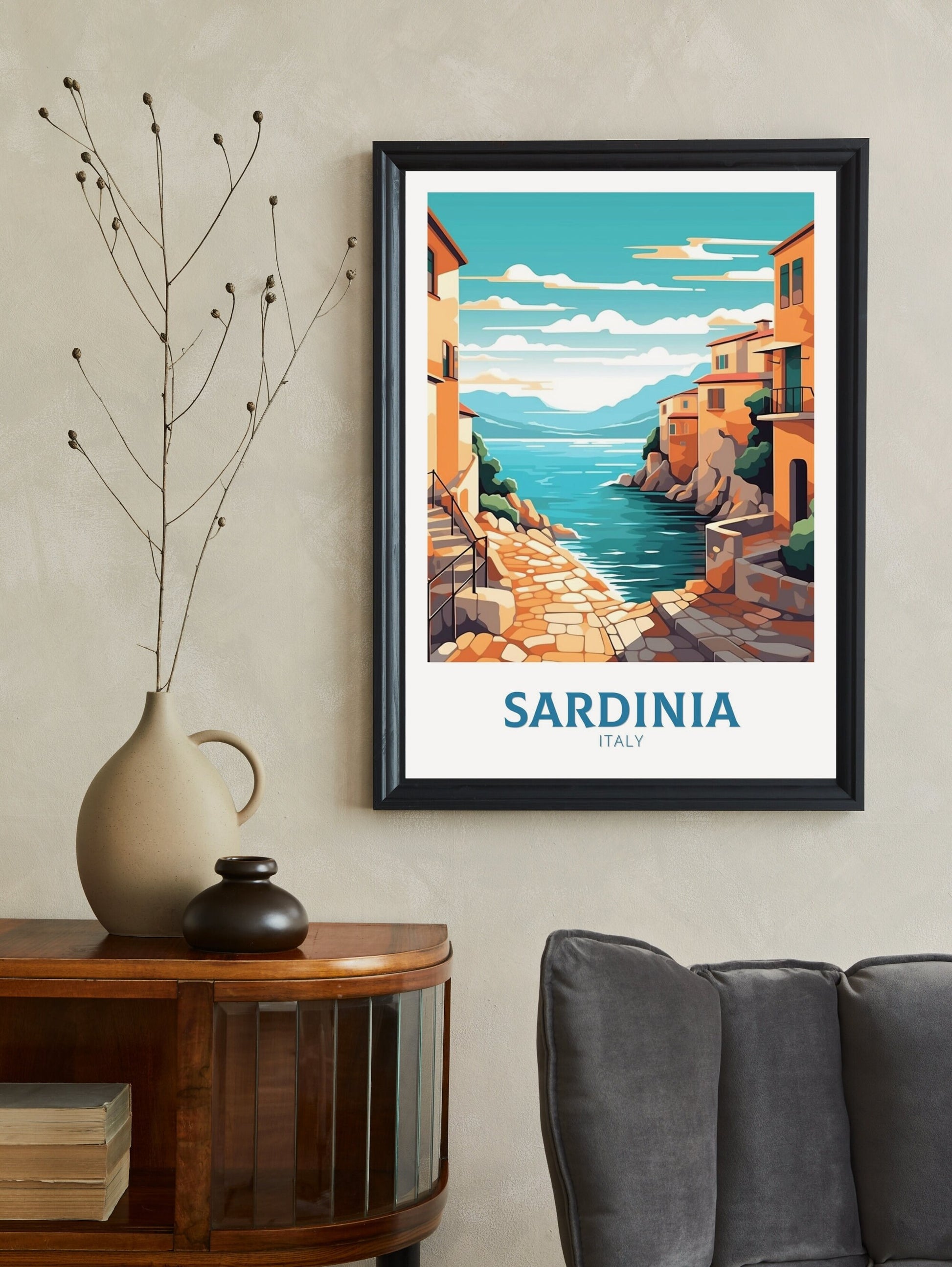 Apportez le charme envoûtant de la Méditerranée à vos murs avec cette magnifique affiche de voyage Sardaigne . Cette affiche représentant l'Italie met en valeur les paysages époustouflants de la Sardaigne, de ses eaux turquoise cristallines à son littoral escarpé et ses villages pittoresques. Idéale pour les passionnés de voyages et les amoureux de la culture italienne, cette affiche murale apporte une touche méditerranéenne vibrante et intemporelle à n'importe quelle pièce.