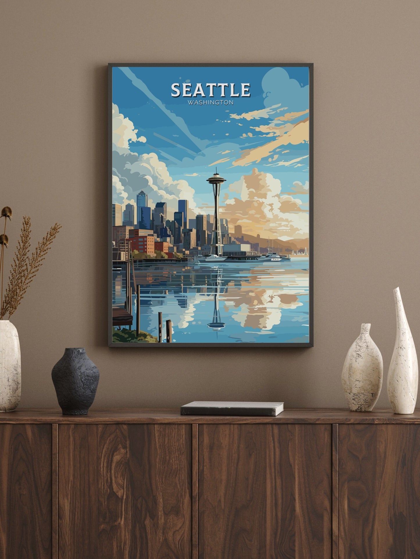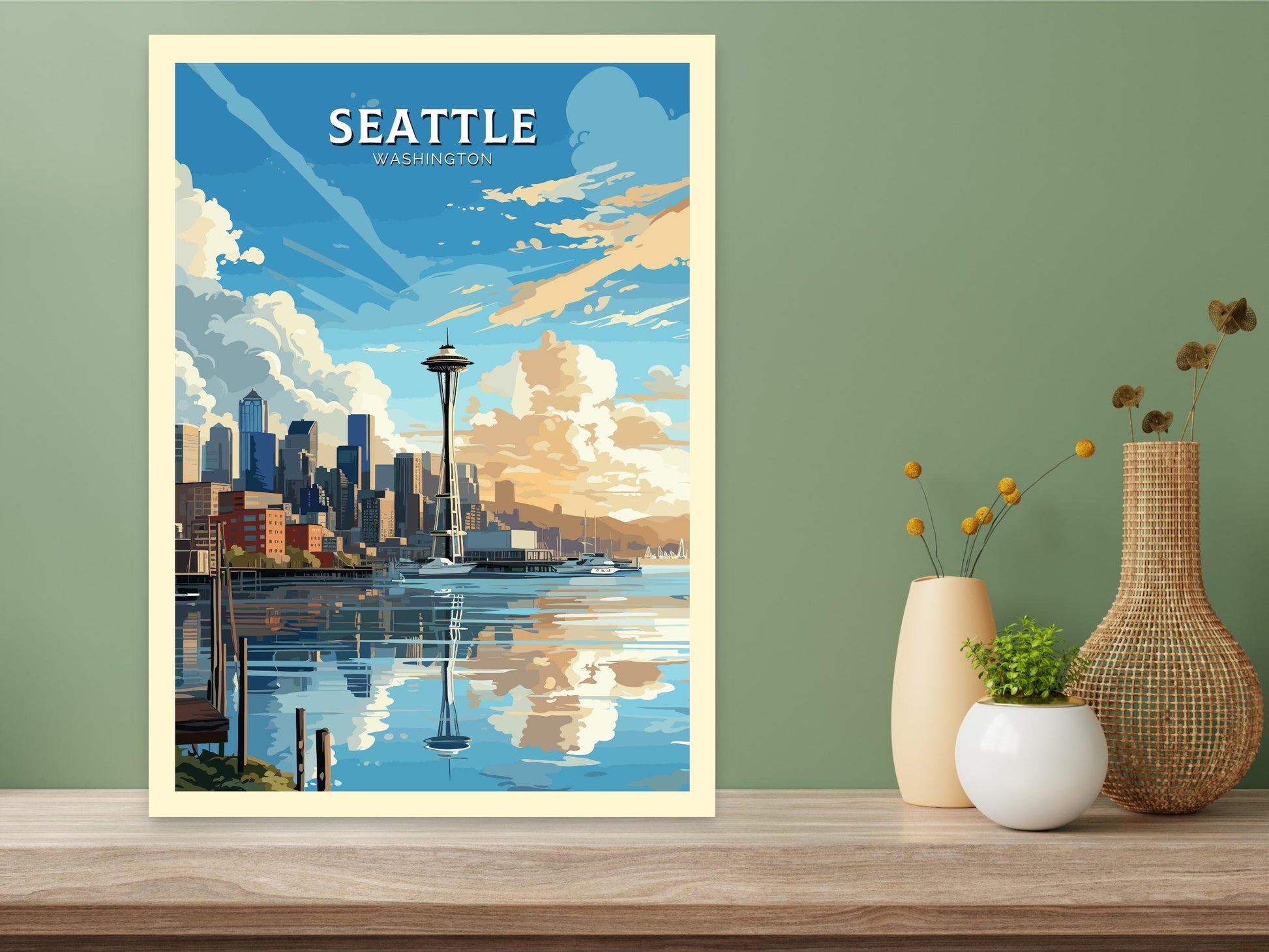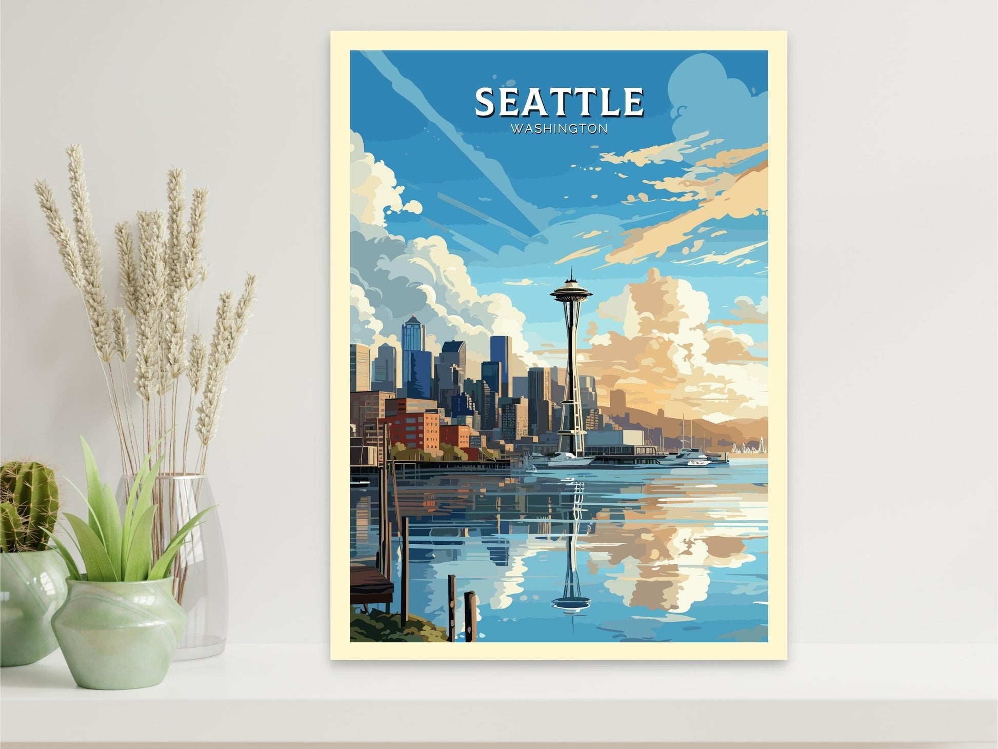 Disponible en téléchargement numérique ou en impression physique de haute qualité , cette affiche de voyage Seattle Skyline est disponible dans une variété de tailles, des formats standard de la série A à 30x40 pouces, parfaite pour n'importe quel mur ou espace de bureau.