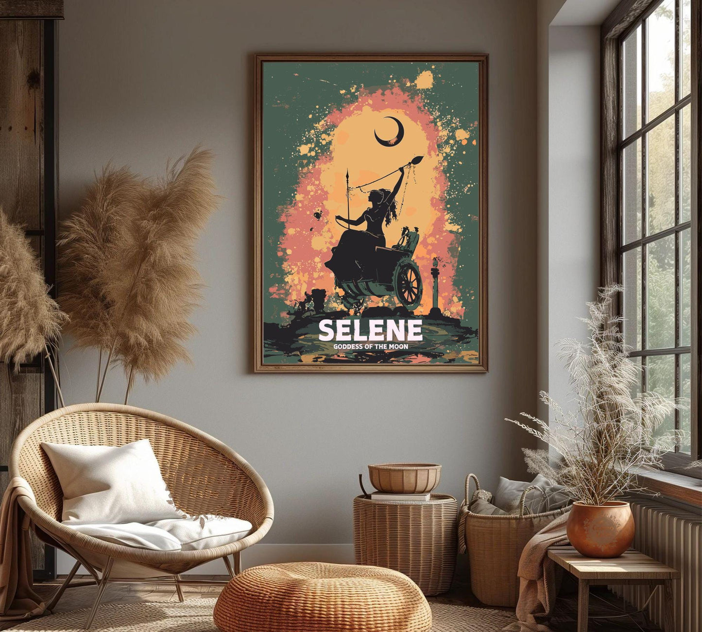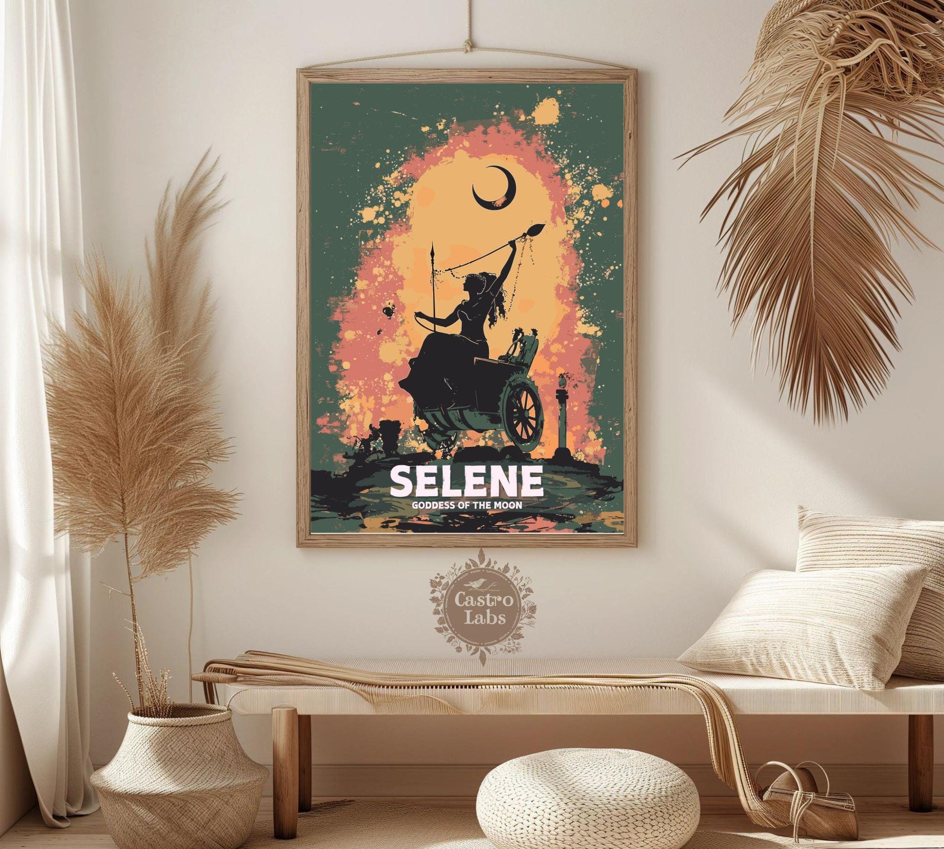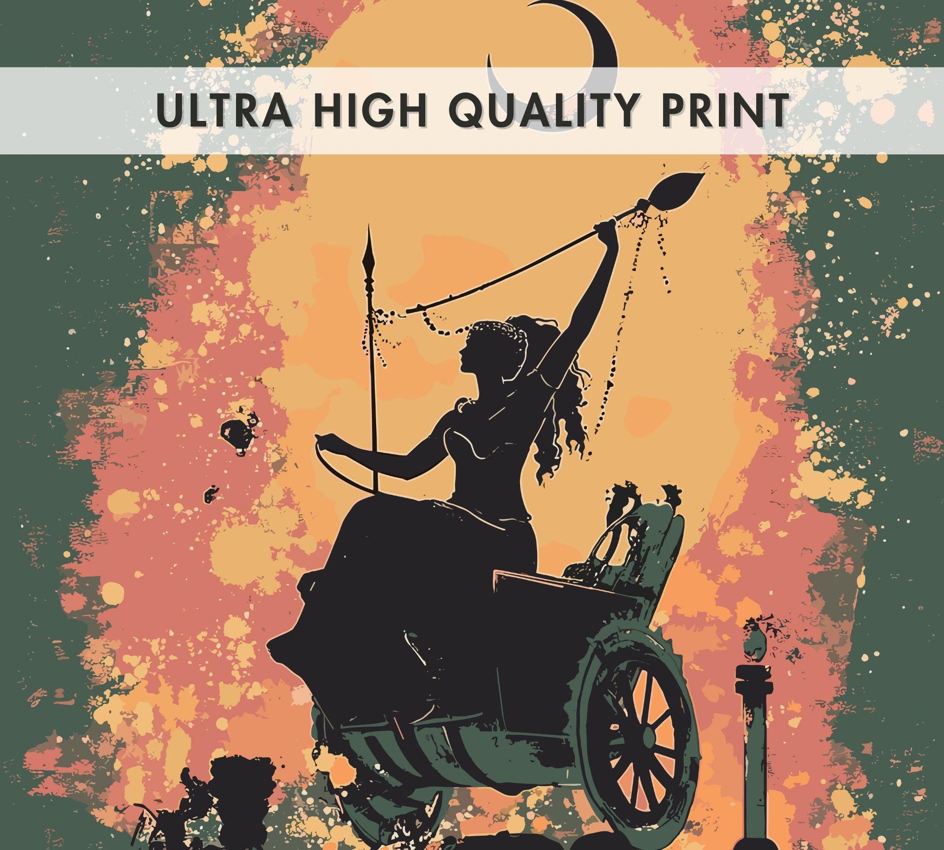 Notre affiche Séléné, déesse grecque de la Lune, baigne votre espace d'une lueur lunaire grâce à son design éthéré. Parfaite pour les passionnés de mythologie et les admirateurs du ciel nocturne, elle représente Séléné, la déesse grecque de la Lune, chevauchant son char à travers une étendue étoilée. Que vous vénériez sa mystique ou que vous aimiez l'art céleste, cette affiche Séléné Lune est un ajout fascinant à votre décoration.