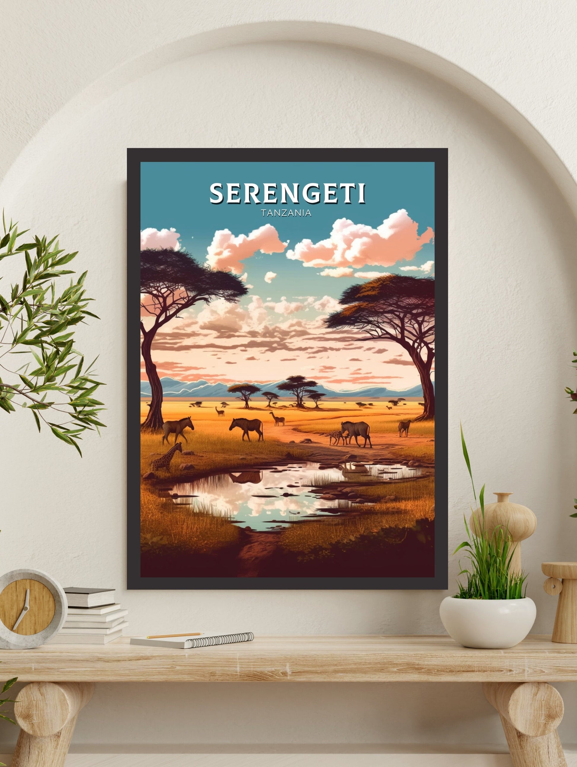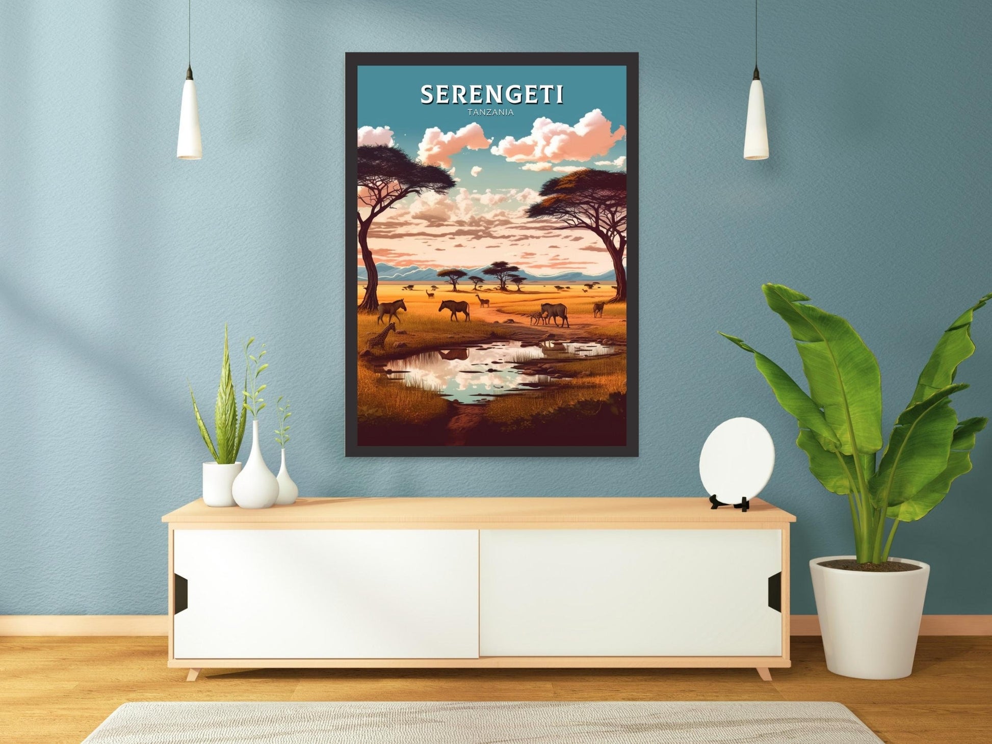 Notre affiche Serengeti - Parc national plonge votre espace dans l'immensité emblématique du parc national du Serengeti en Tanzanie grâce à son design vibrant. Idéale pour les passionnés de voyages et les amateurs d'art, elle capture les plaines infinies et la Grande Migration avec des détails saisissants. Que vous ayez contemplé ses merveilles ou rêvé de sa nature sauvage, cette affiche Serengeti sera un ajout magnifique à votre décoration.