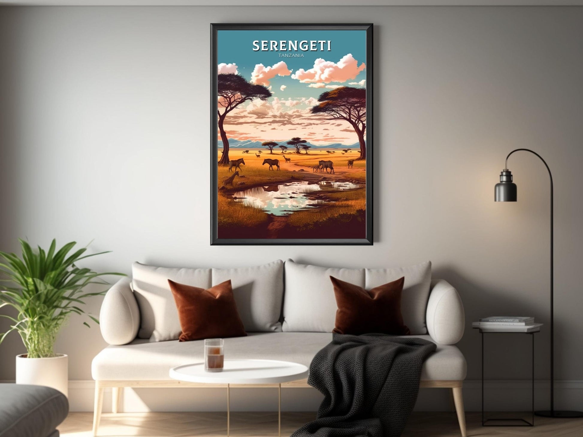 Transformez votre intérieur en un havre de paix grâce à cette œuvre captivante. Idéale pour un salon, un bureau ou un espace inspiré du voyage, elle s'harmonise parfaitement avec d'autres œuvres d'art animalier. Plus qu'un simple objet de décoration, cette œuvre d'art représentant un parc national est un voyage dans les paysages légendaires du Serengeti.
