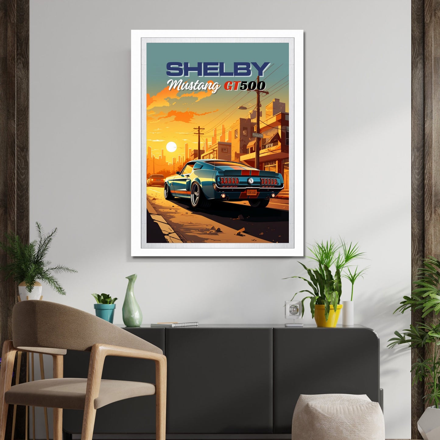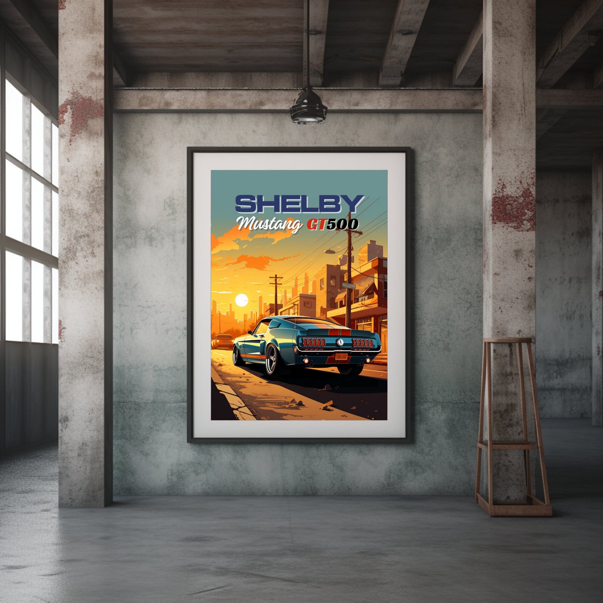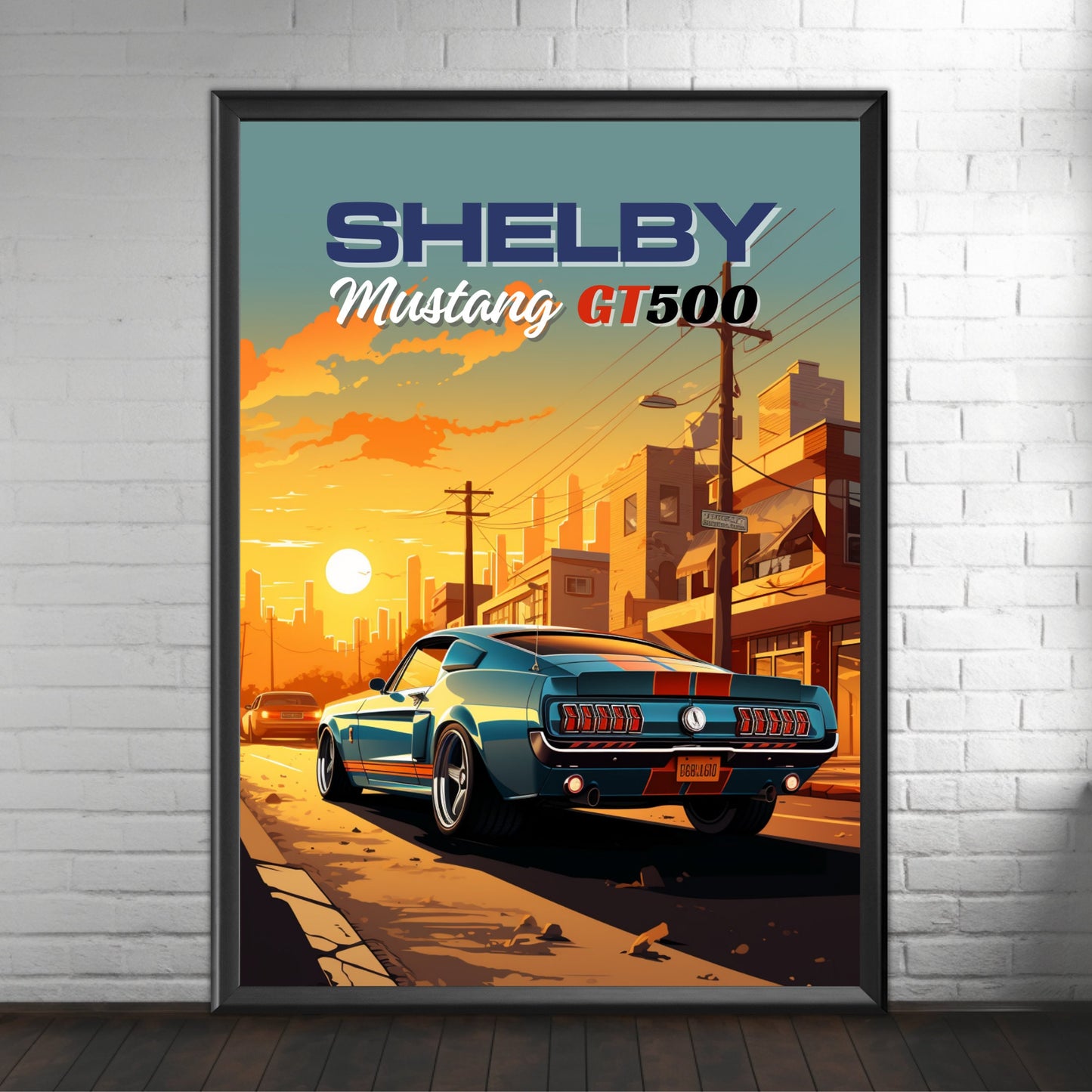 Cette affiche Shelby Mustang GT500 rugit avec une muscle car féroce, accroupie, calandre rugissante. Elle illustre les courbes élancées et la puissance brute de la GT500, garée sous une lumière rétro audacieuse.