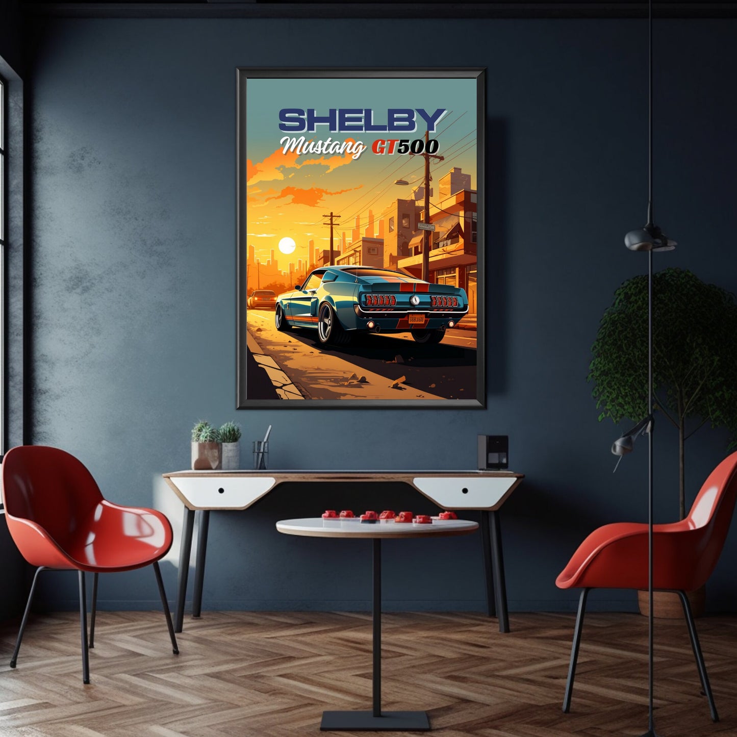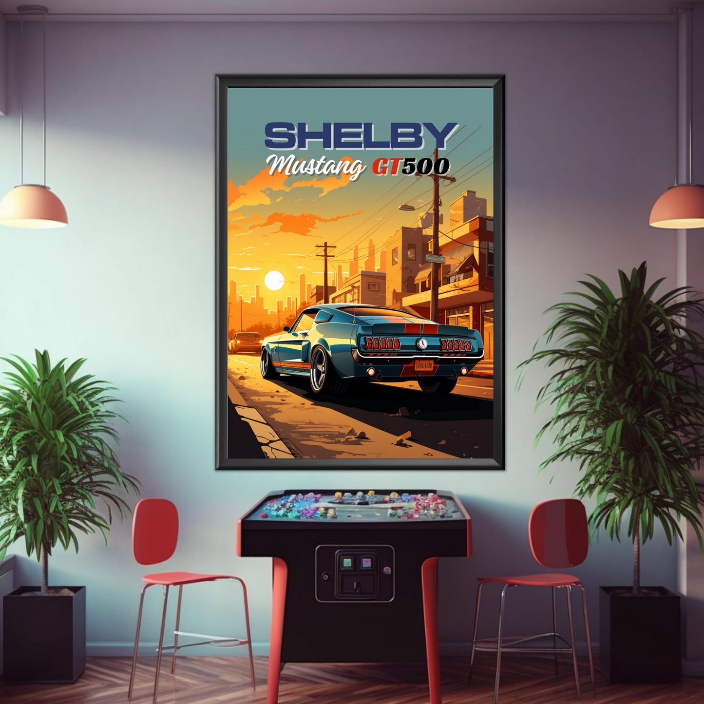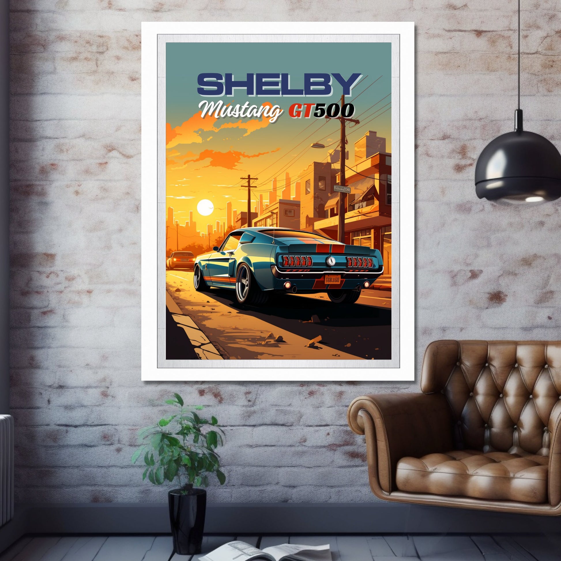 Cette affiche Shelby Mustang GT500 rugit avec une muscle car féroce, accroupie, calandre rugissante. Elle illustre les courbes élancées et la puissance brute de la GT500, garée sous une lumière rétro audacieuse.