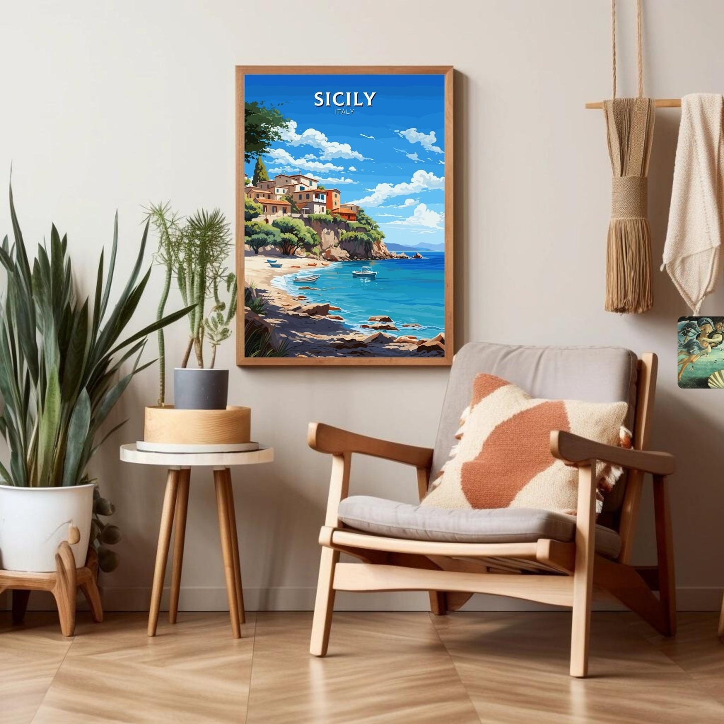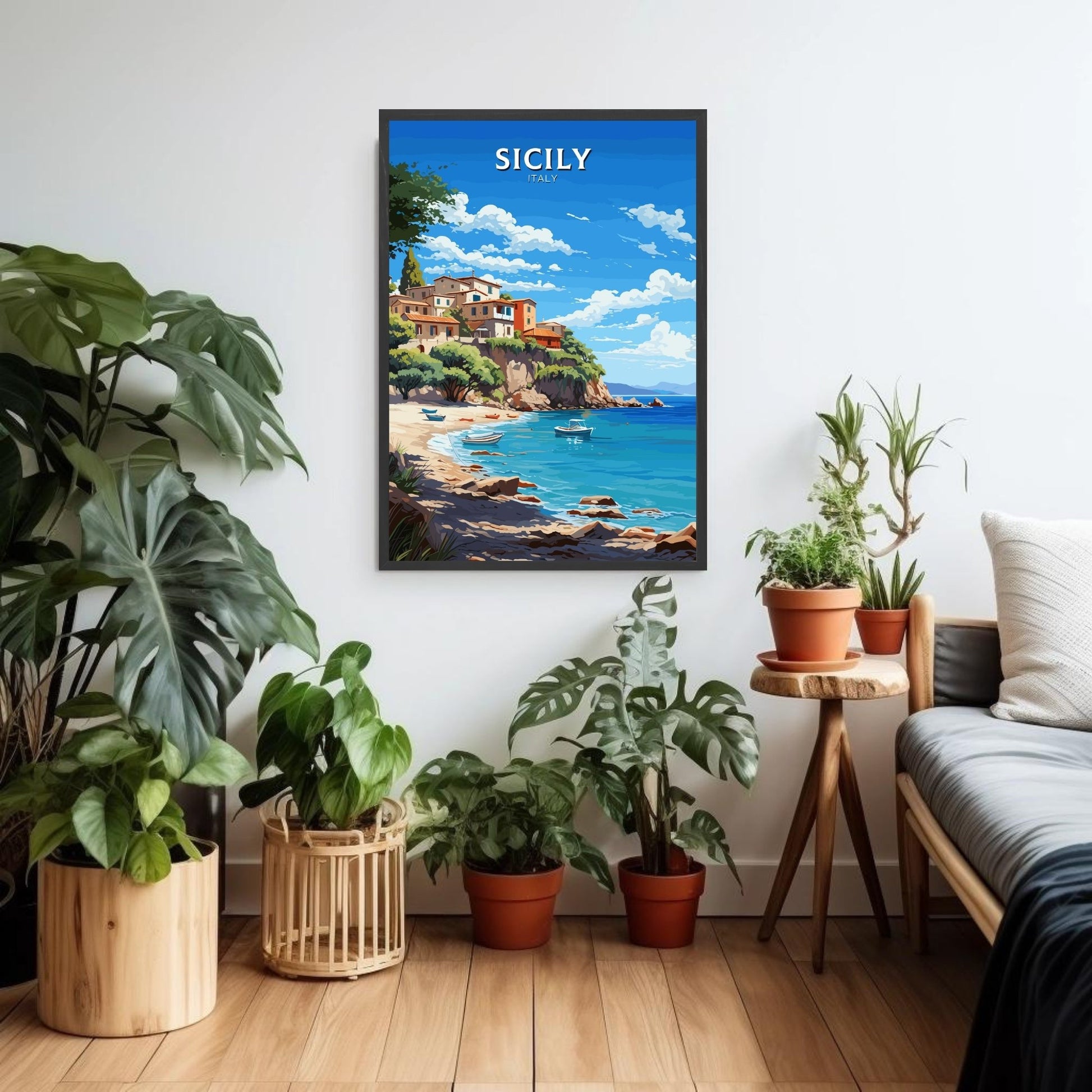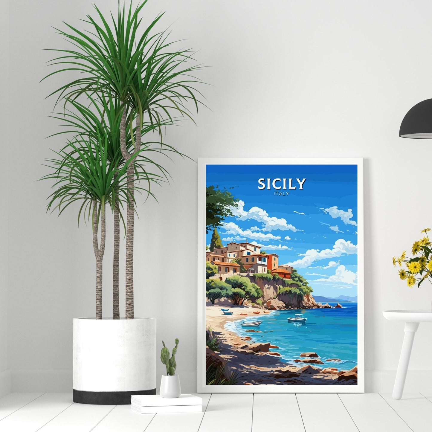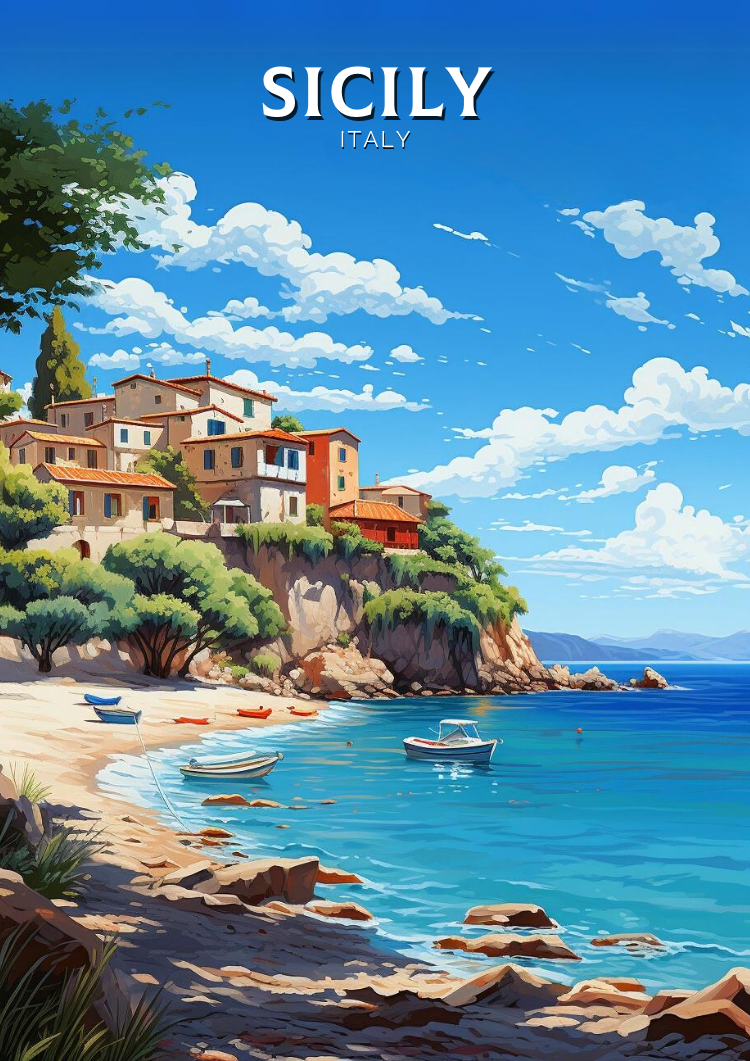 Imprimé sur des matériaux de première qualité, ce tableau de voyage Sicile aux couleurs vives et aux détails précis est un ajout remarquable à votre décoration. Que vous vous remémoriez vos aventures siciliennes ou rêviez de votre prochaine escapade, cette œuvre d'art italienne capture à merveille le charme intemporel de la Sicile.