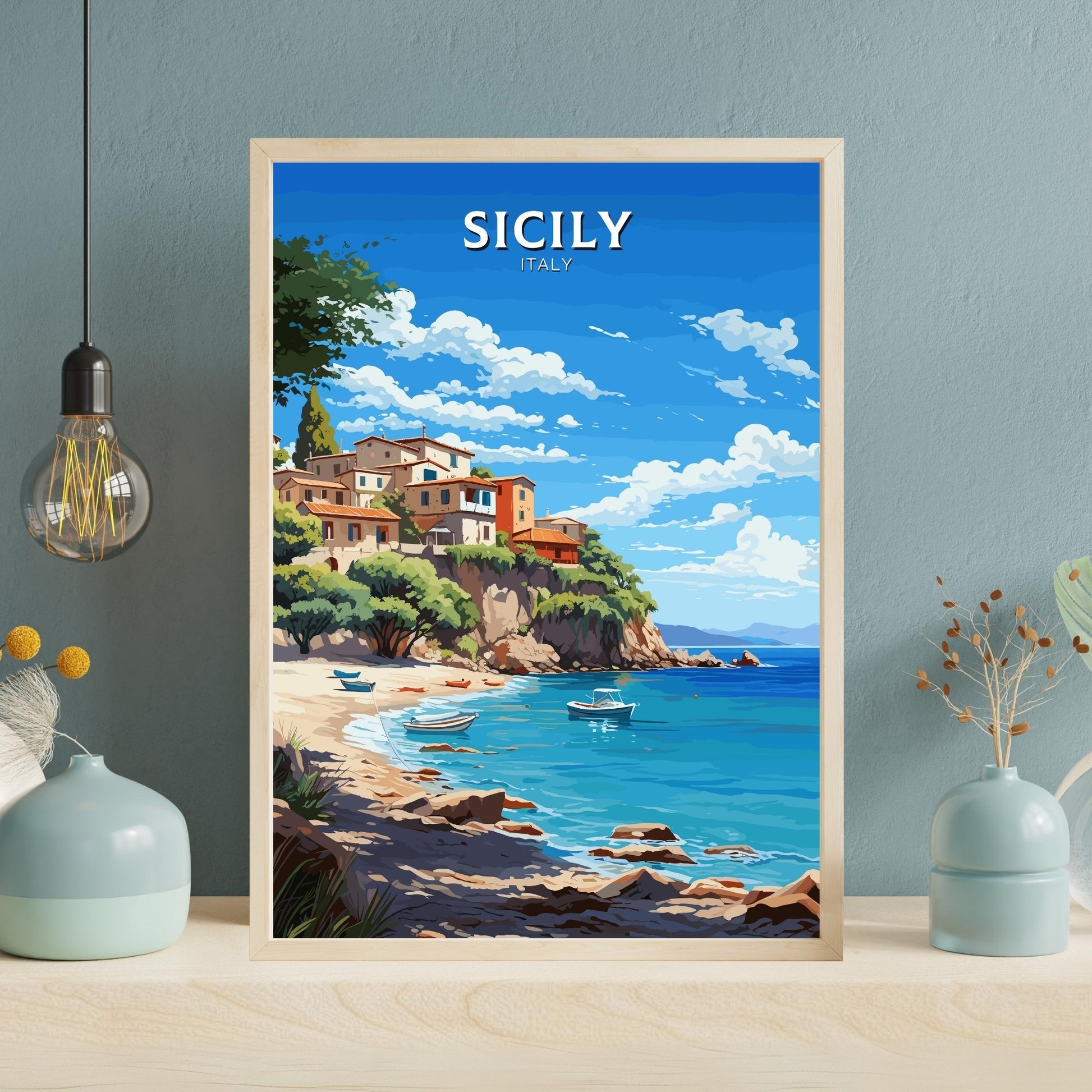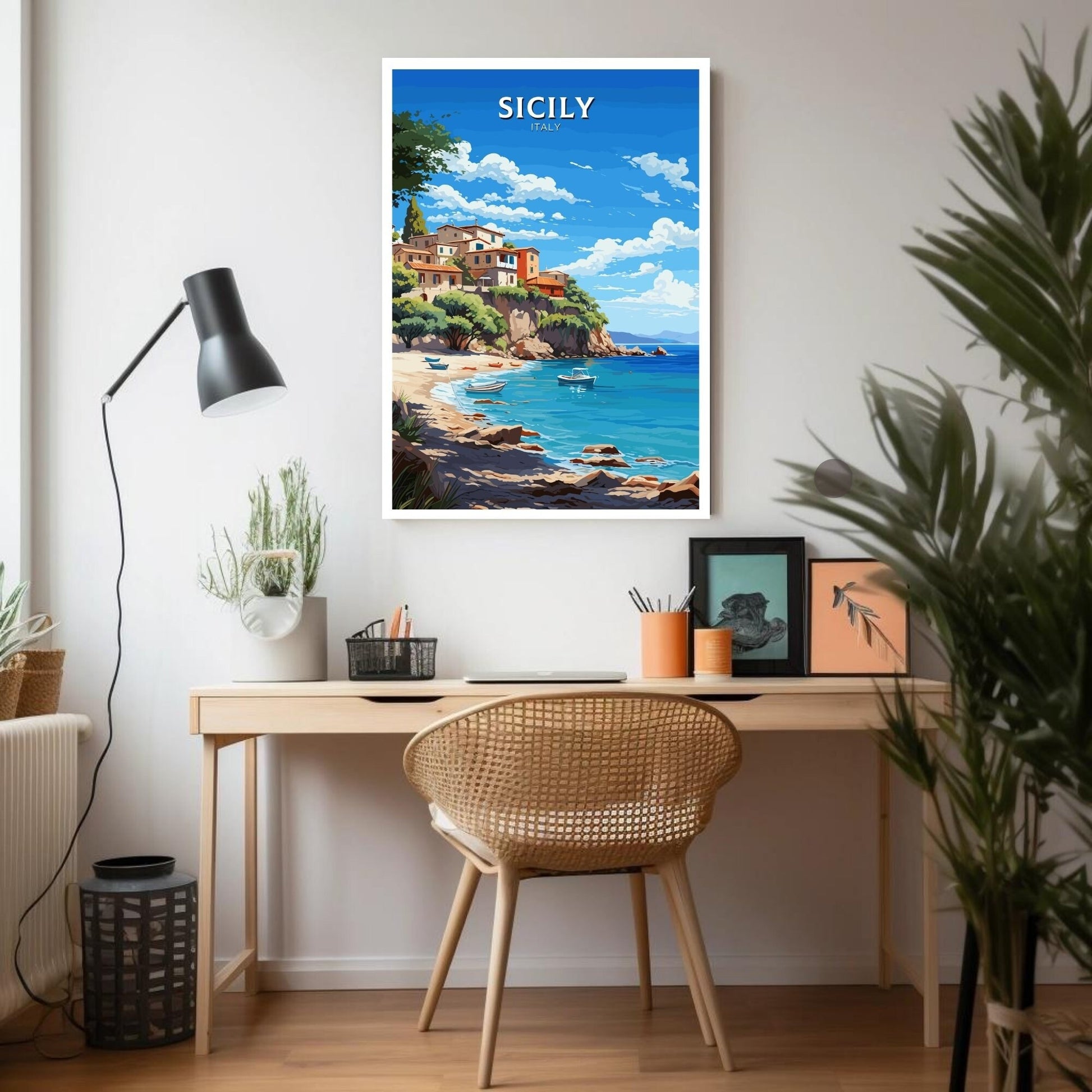 Découvrez la culture vibrante et les paysages époustouflants de la plus grande île d'Italie avec cette captivante affiche de voyage sur la Sicile . Mettant en valeur le littoral méditerranéen emblématique de la Sicile, ses ruines antiques et ses villages pittoresques, cette œuvre d'art italienne fait entrer la richesse historique et la beauté naturelle de la Sicile chez vous ou au bureau. Idéale pour les passionnés de voyages et les amoureux du patrimoine italien, cette affiche apporte une touche méditerranéenne authentique à tous les espaces.