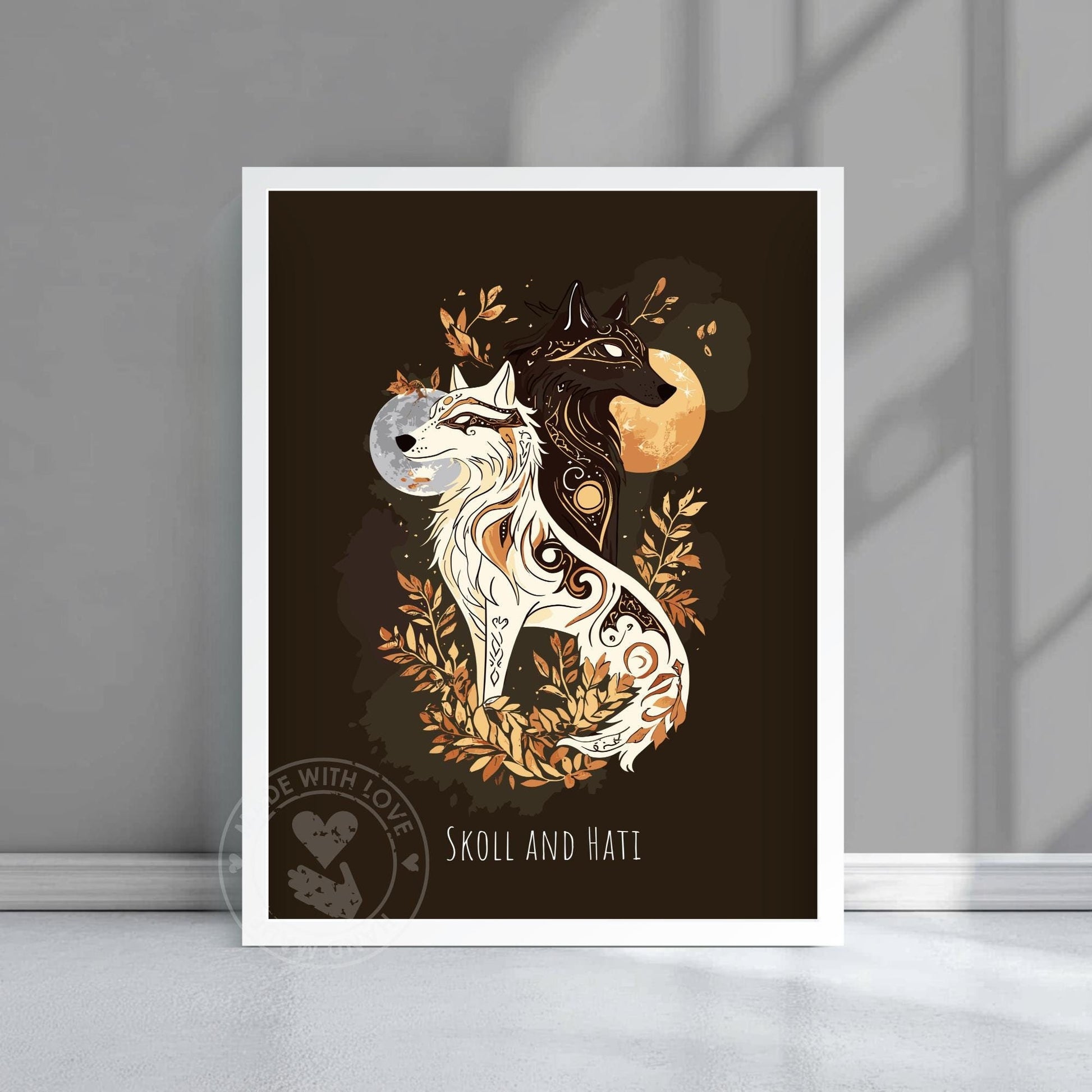Cette affiche de Skoll et Hati hurle avec les loups nordiques pourchassant le soleil et la lune, leurs mâchoires claquant dans la pénombre. Elle capture Skoll et Hati avec des regards féroces, liés aux récits d'éclipses des traditions nordiques.