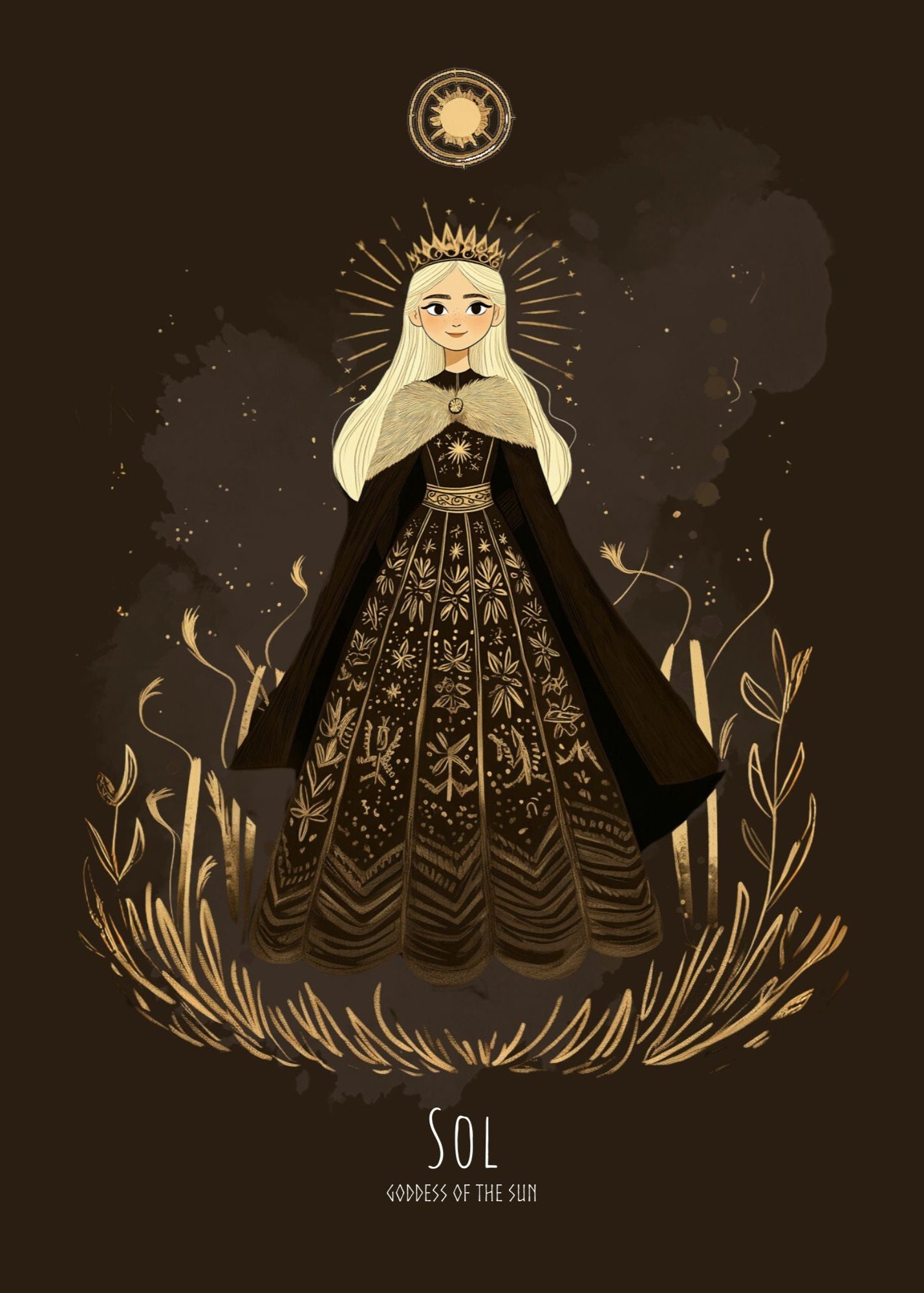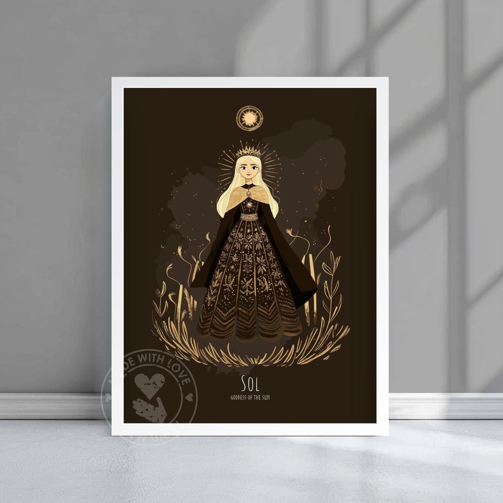 Cette affiche de la Déesse Sol représente la déesse nordique du soleil dans une pose radieuse, poursuivant l'aube avec une grâce ardente. Elle capture Sol dans une lueur flamboyante, tissée dans les fils lumineux du folklore nordique.