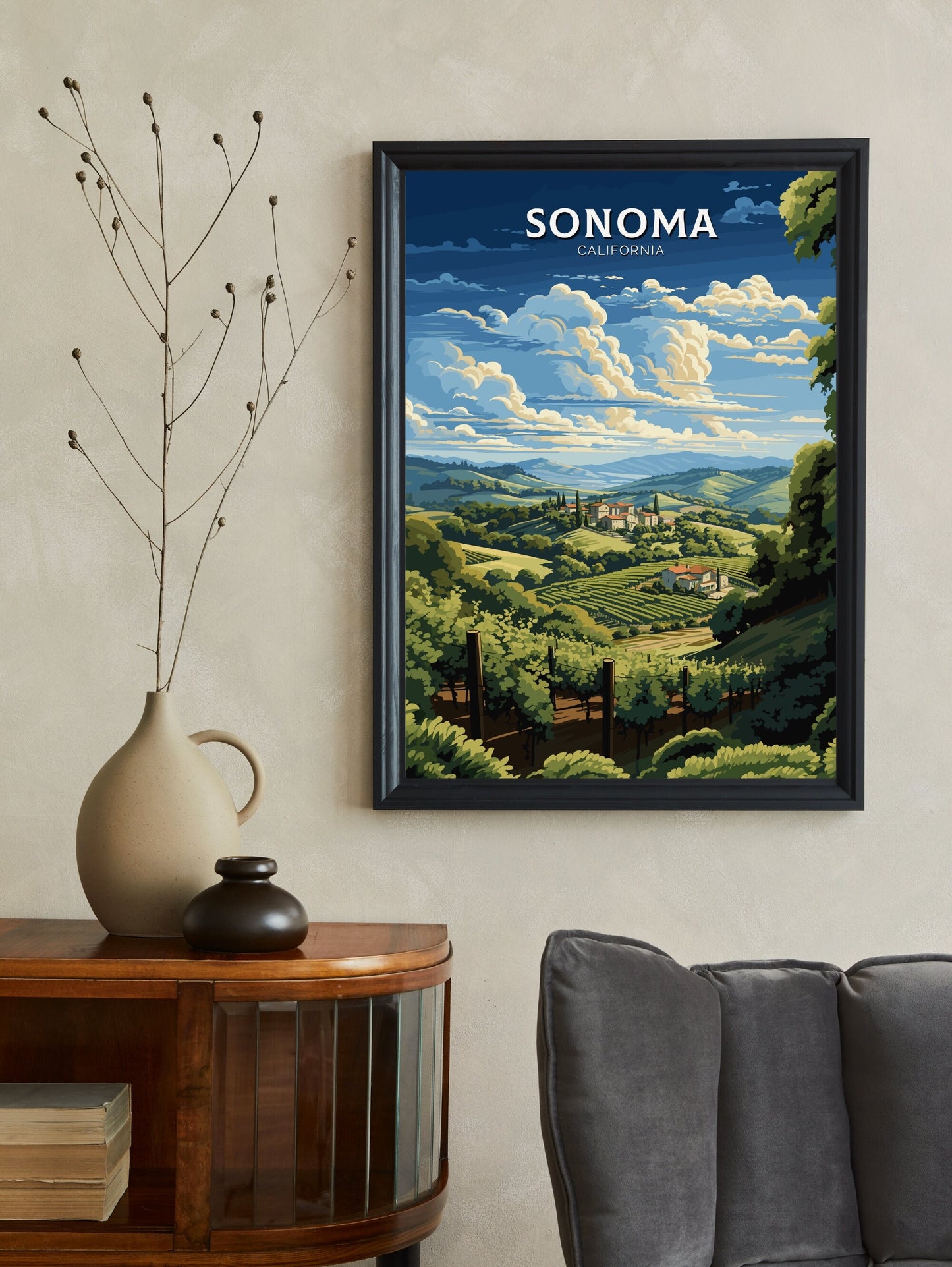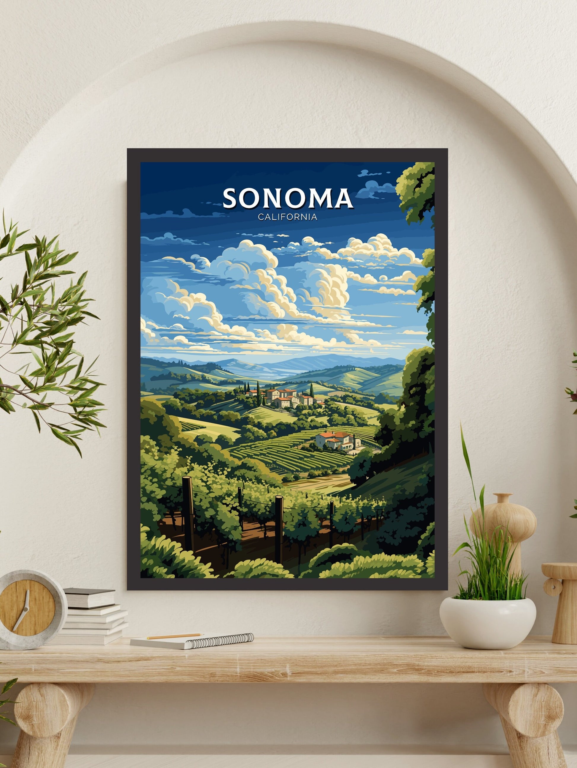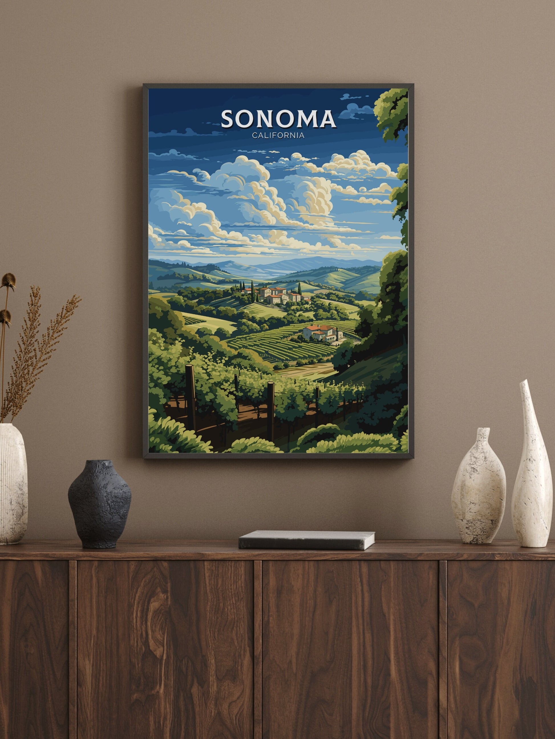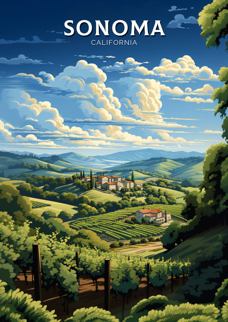 Célébrez la beauté pittoresque de la région viticole de Californie avec notre affiche de voyage de Sonoma – Illustration californienne . Cette superbe affiche capture les vignobles, les collines et les paysages enchanteurs de Sonoma, idéale pour les amoureux de voyages et d'art.