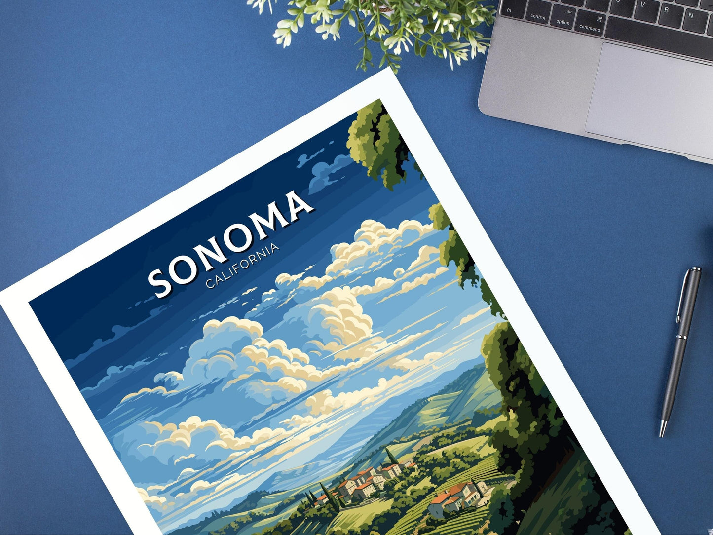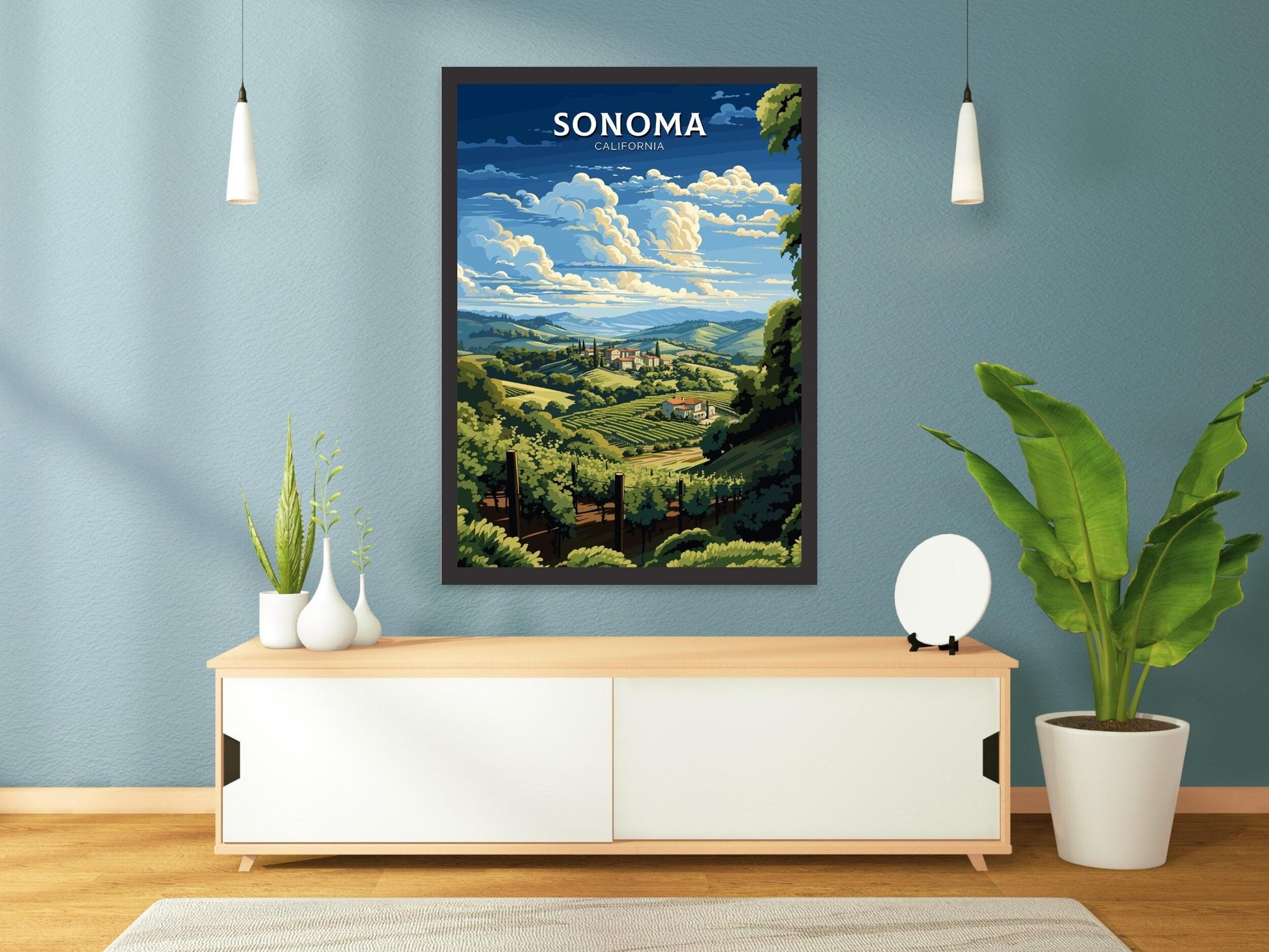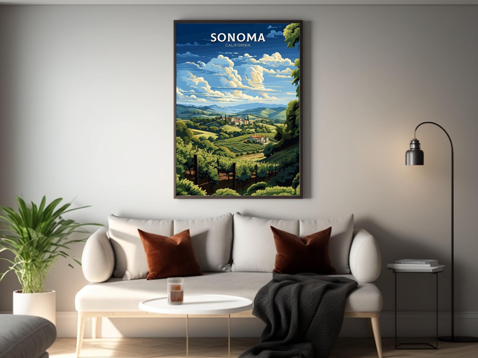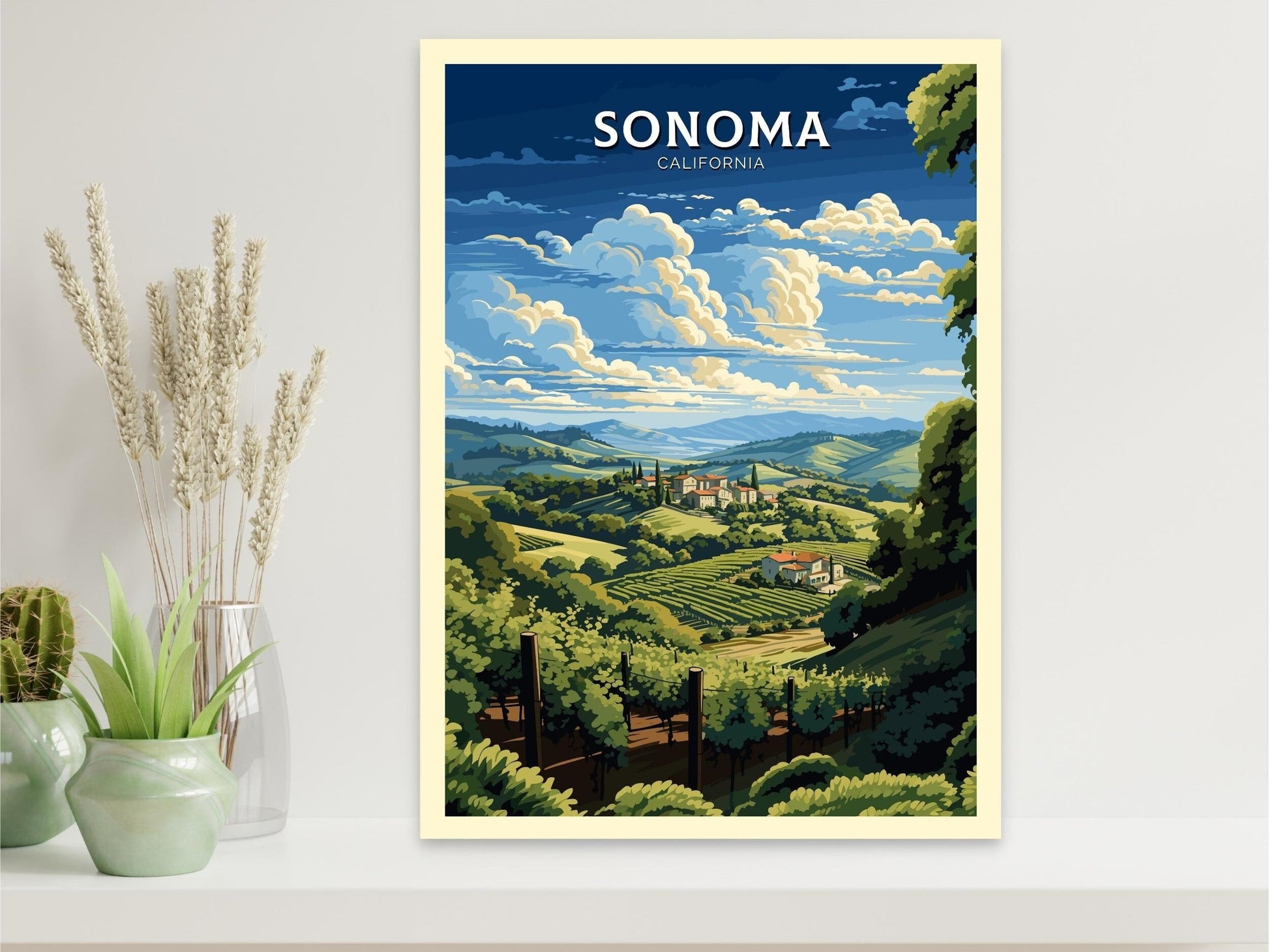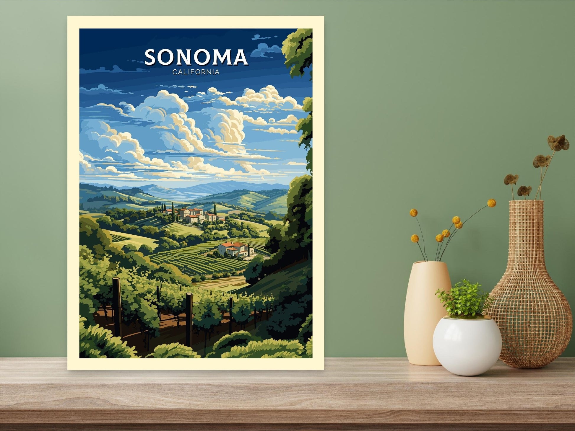 Disponible en téléchargement numérique et en impression physique premium , cette affiche de voyage de Sonoma est disponible dans une variété de tailles allant de la série A à 30x40 pouces, ce qui la rend idéale pour n'importe quel mur de pièce ou de bureau.