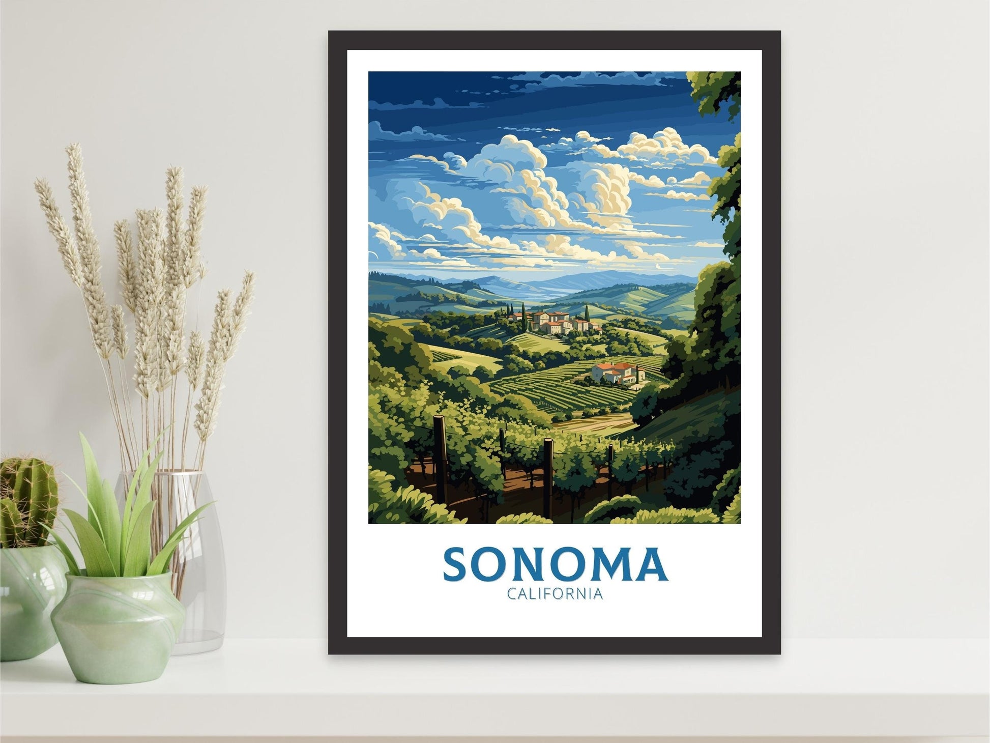 Inspirez-vous du charme de la région viticole de Californie avec notre affiche de voyage de Sonoma – Illustration californienne . Mettant en vedette les vignobles emblématiques de Sonoma, ses collines vallonnées et ses paysages pittoresques, cette affiche de voyage est idéale pour les collectionneurs et les amateurs d'art.