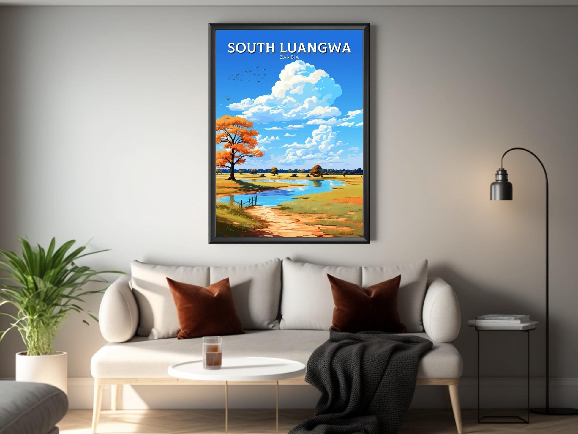 Notre affiche de voyage du Sud Luangwa – Art rétro de la Zambie – plonge votre intérieur au cœur sauvage du parc national du Sud Luangwa en Zambie avec son design nostalgique. Idéale pour les passionnés de voyages et les amateurs d'art rétro, elle capture la rivière Luangwa et les léopards errants dans un style intemporel. Que vous ayez exploré sa brousse ou rêvé de sa beauté, cette affiche rétro du Sud Luangwa sera un ajout magnifique à votre décoration.