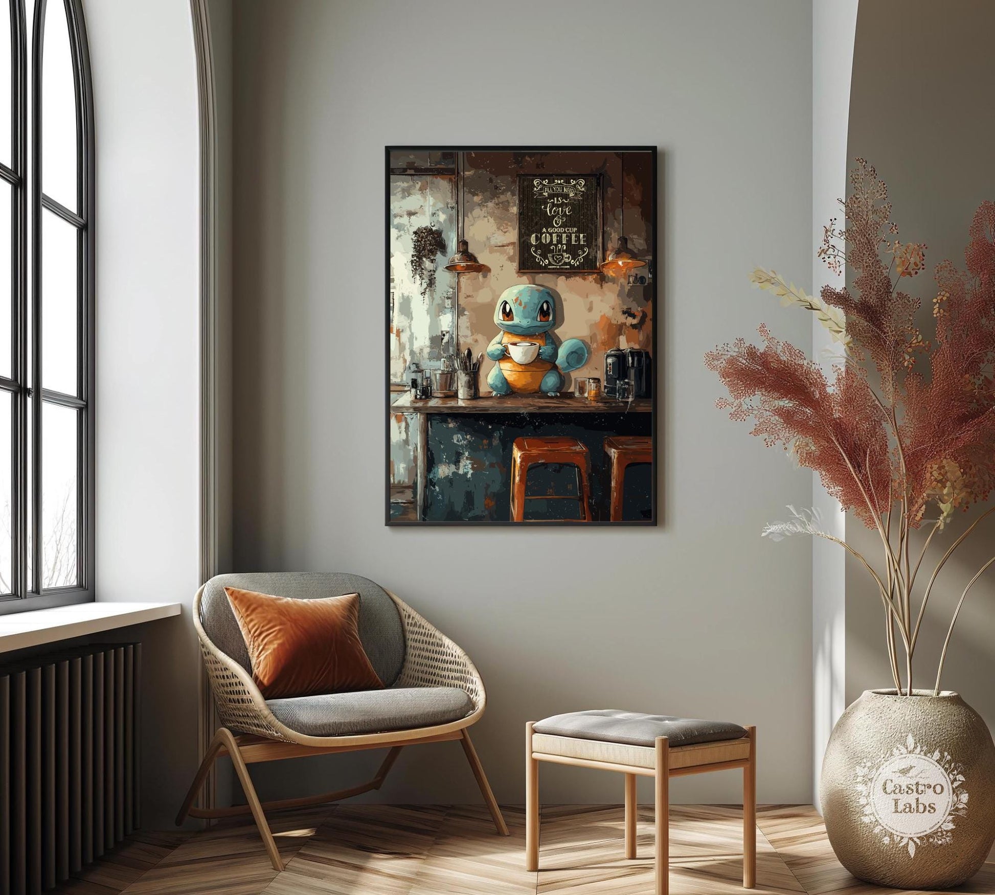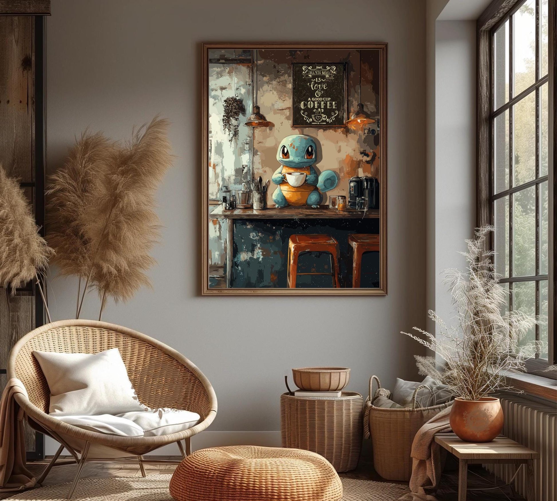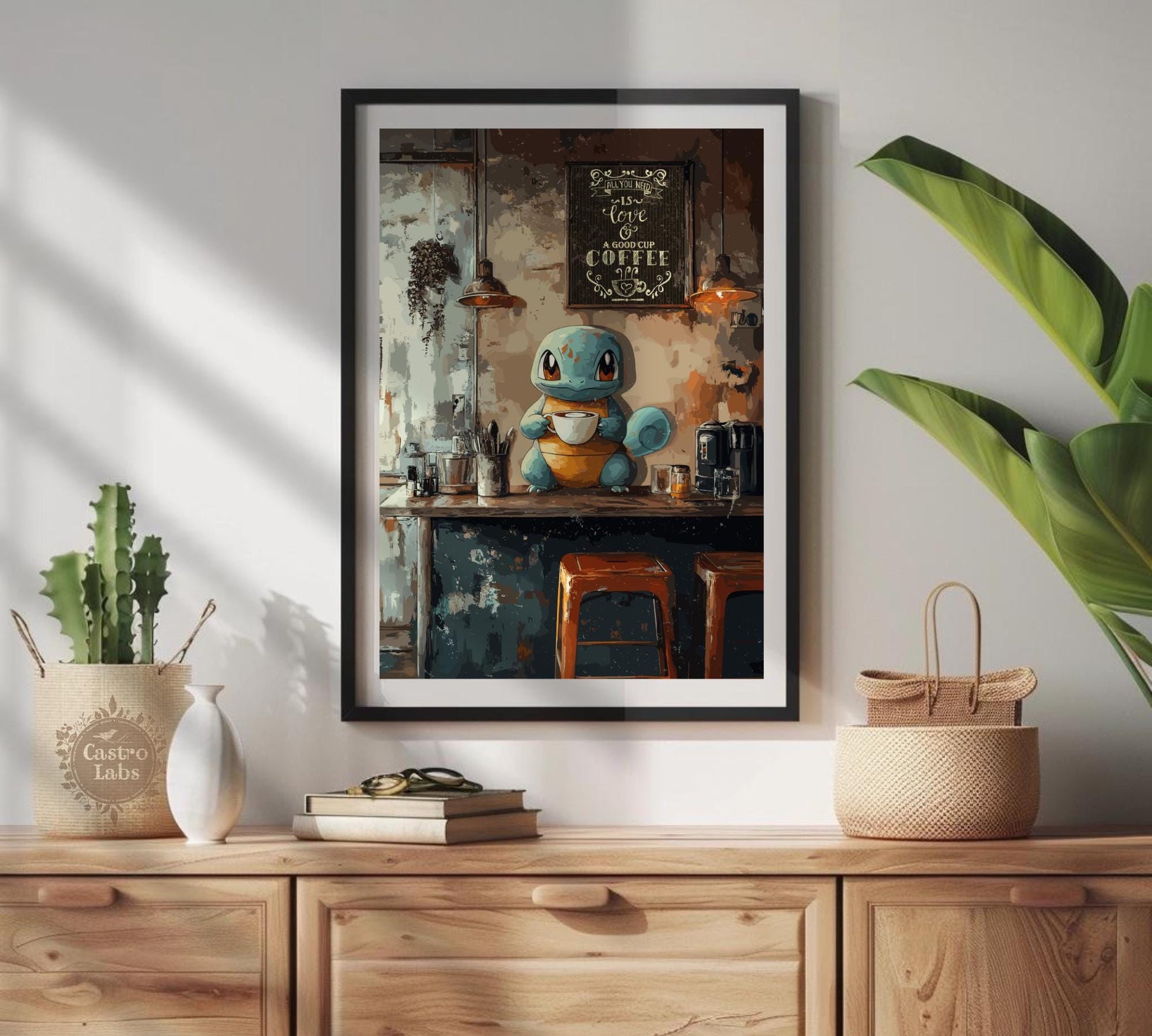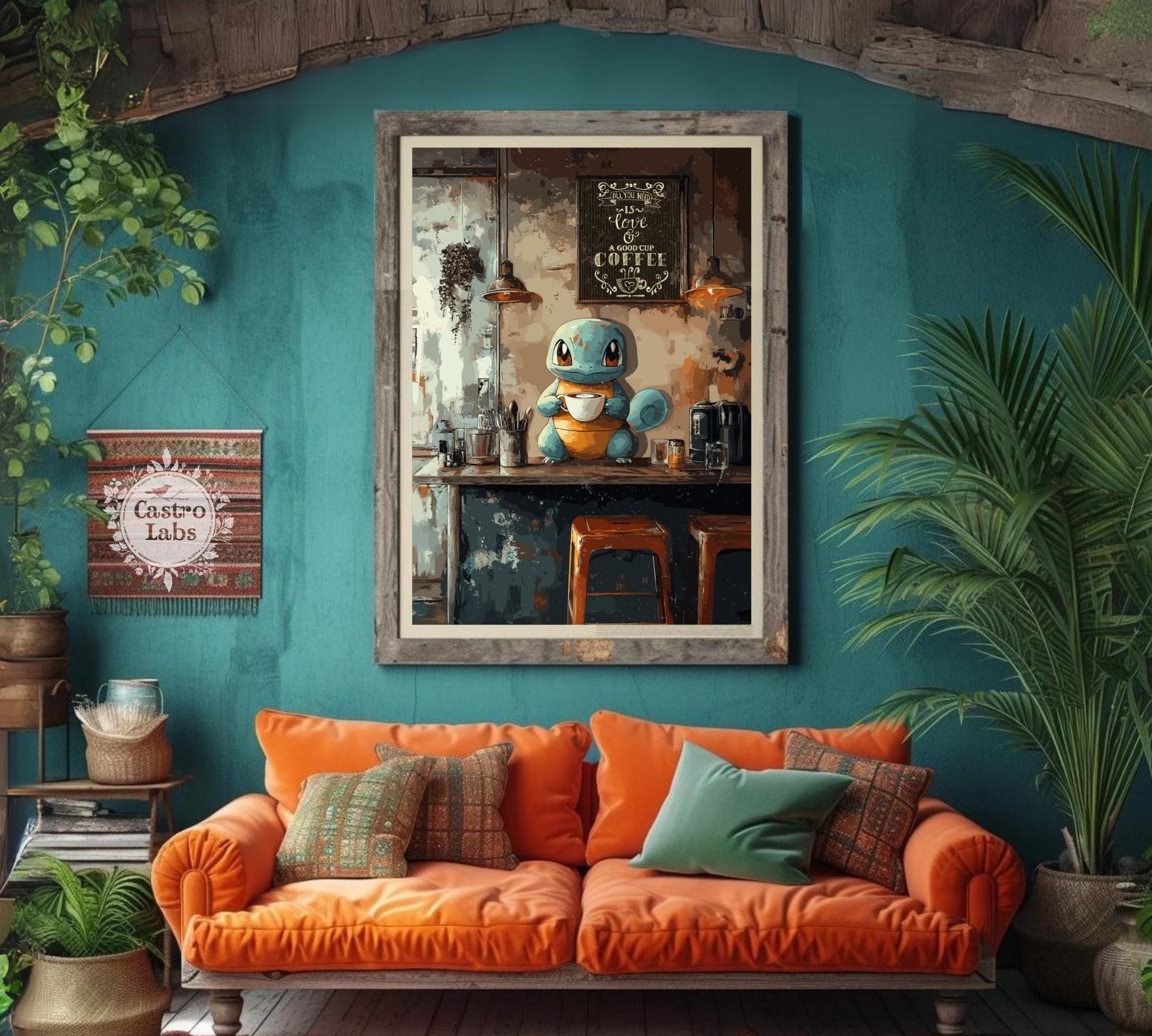 Idéale pour votre coin café, votre coin petit-déjeuner ou votre coin détente, cette œuvre d'art de Carapuce déborde de nuances douces et d'un léger bourdonnement. Un délice infusé, pas seulement une affiche. Accrochez cette décoration murale Pokémon pour égayer votre espace de douceur. Commandez dès maintenant et laissez Carapuce illuminer votre journée !