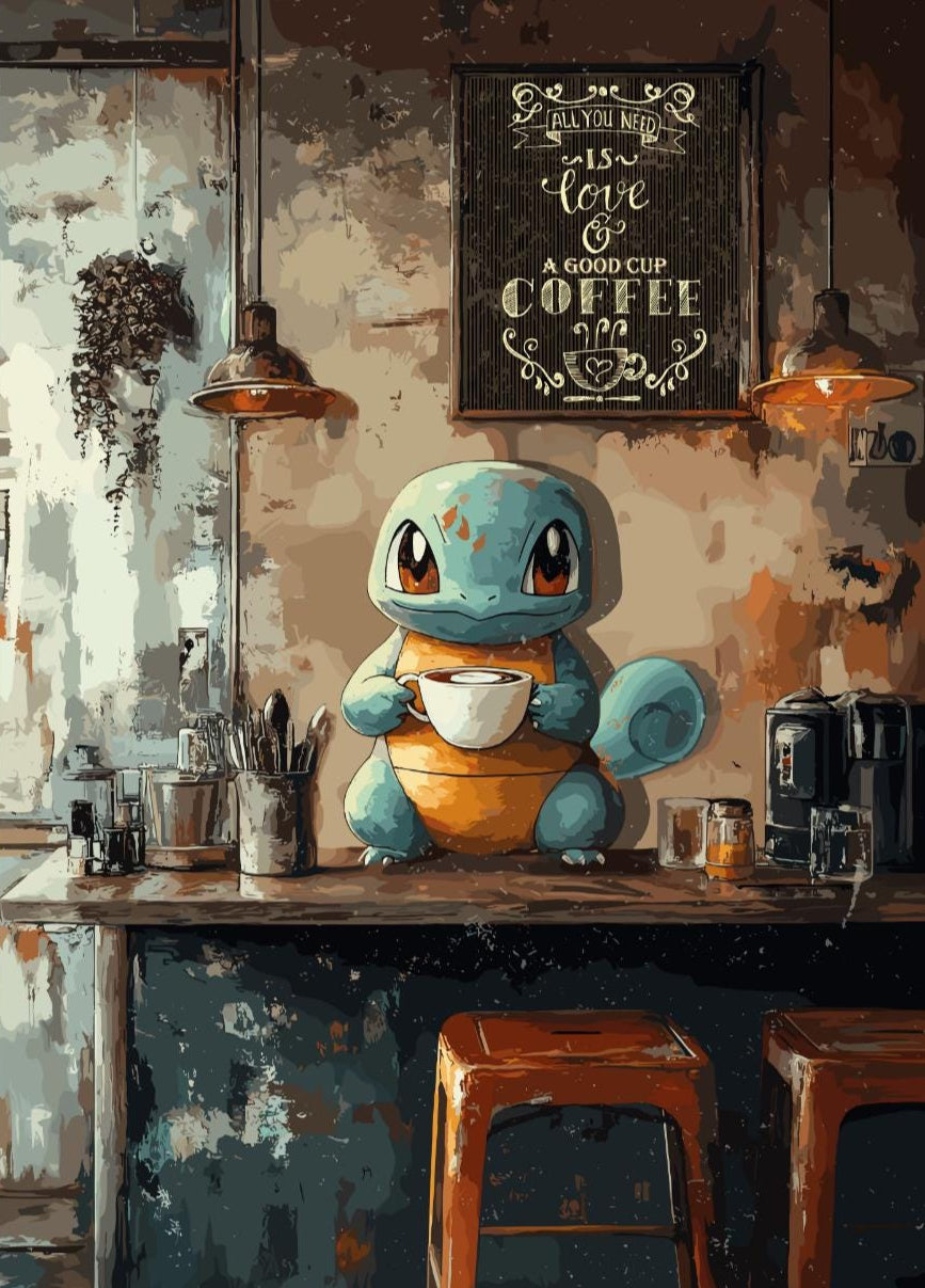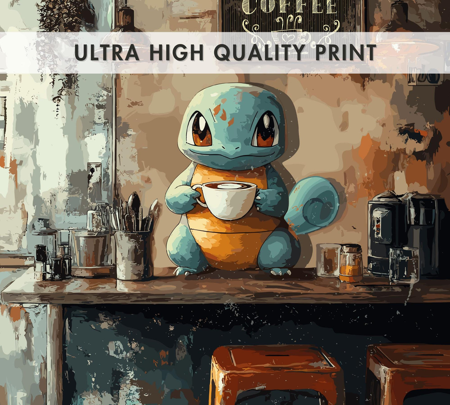 Imprimé sur du papier robuste et de haute qualité, ce fan art Pokémon exhale le charme de Carapuce avec une douce lueur de café, idéal pour les amateurs de café ou les fans de Pokémon après une petite gourmandise douillette. Un petit coup de pouce caféiné.