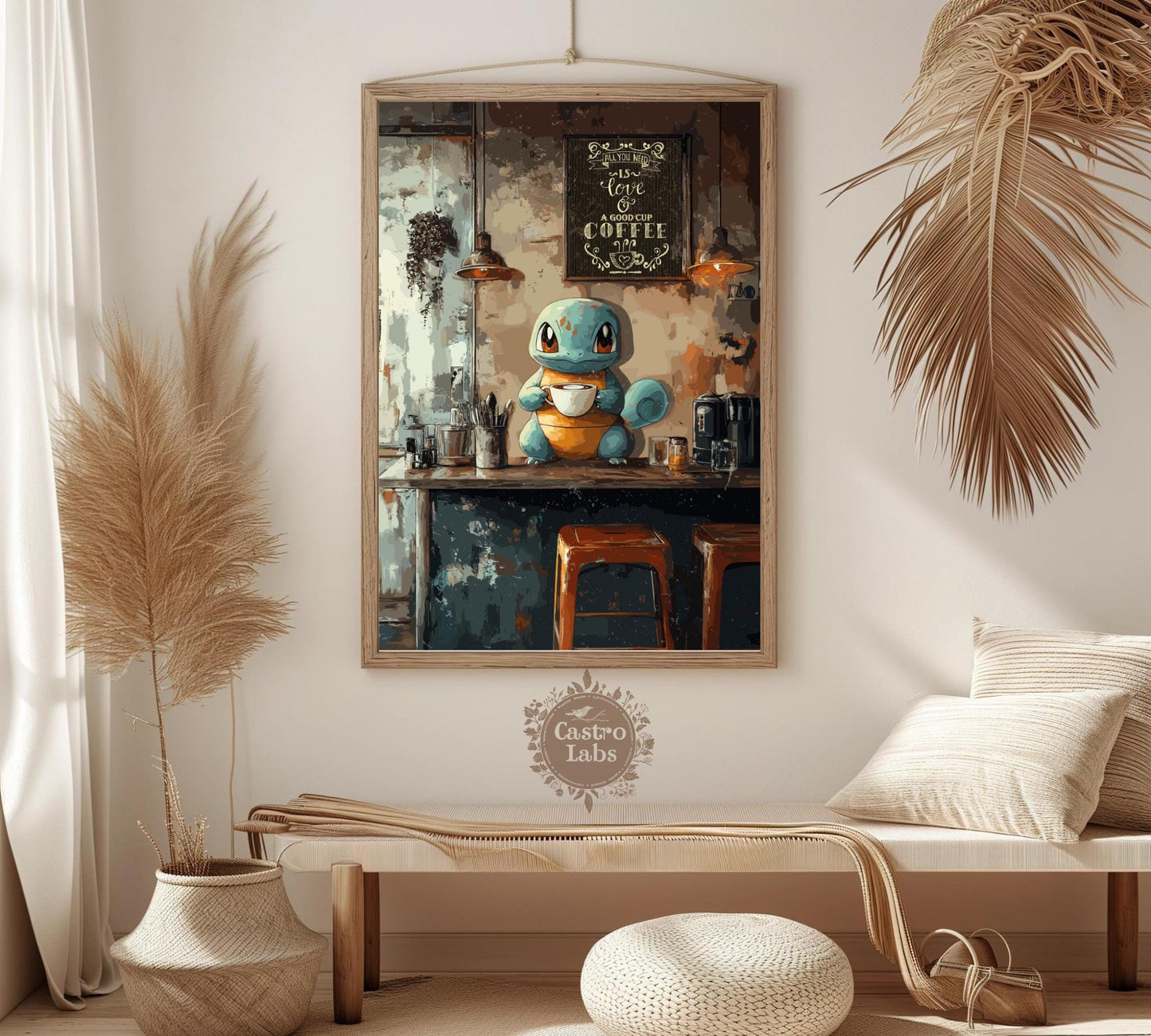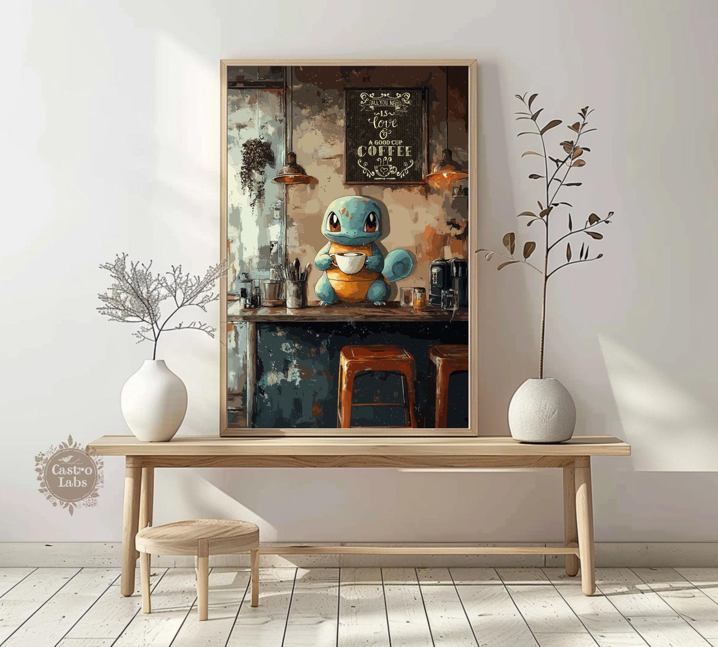 Cette affiche du Café Carapuce met en scène un petit Carapuce sirotant un café dans une scène créée par un fan. On y voit ce Pokémon aquatique perché à une table, une tasse à la main, débordant de douceur et de douceur.