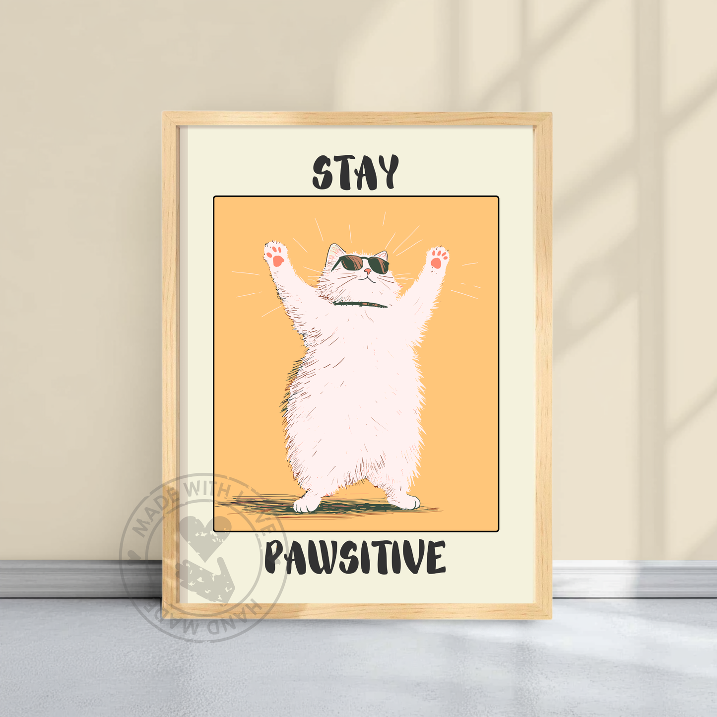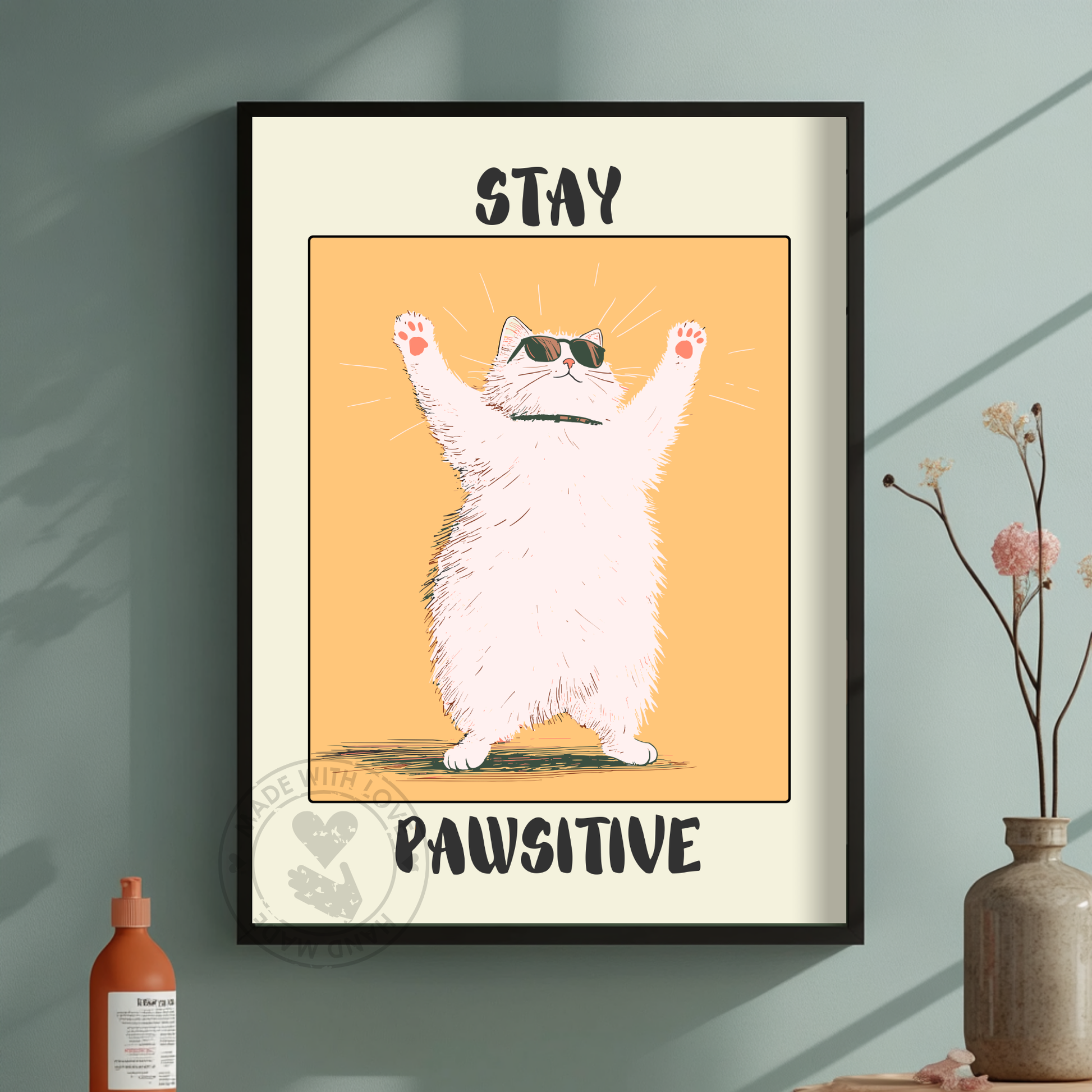 Cette affiche « Stay Pawsitive » met en scène un chat blanc sur fond jaune soleil, les pattes levées. Elle représente un félin tout doux baignant de joie, rayonnant d'une énergie pure et positive.