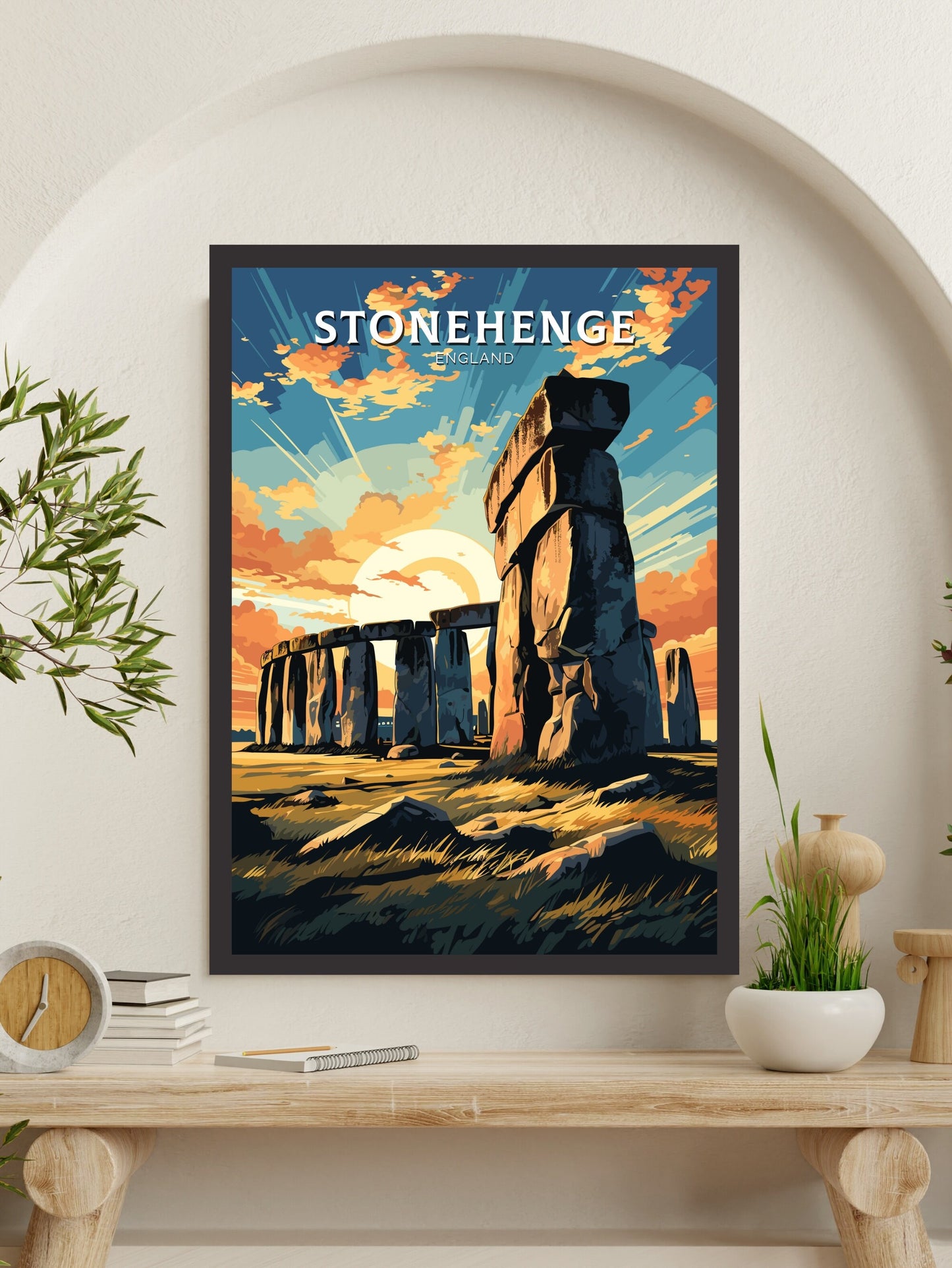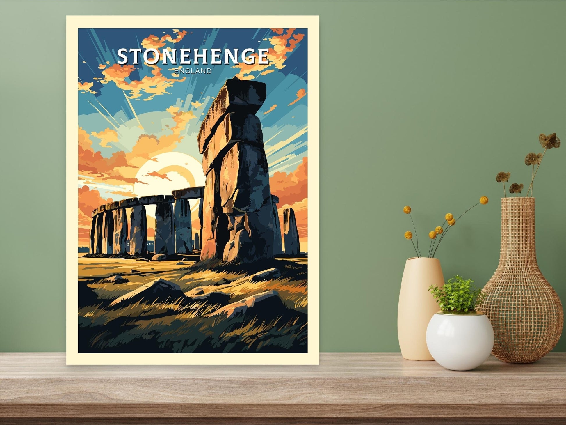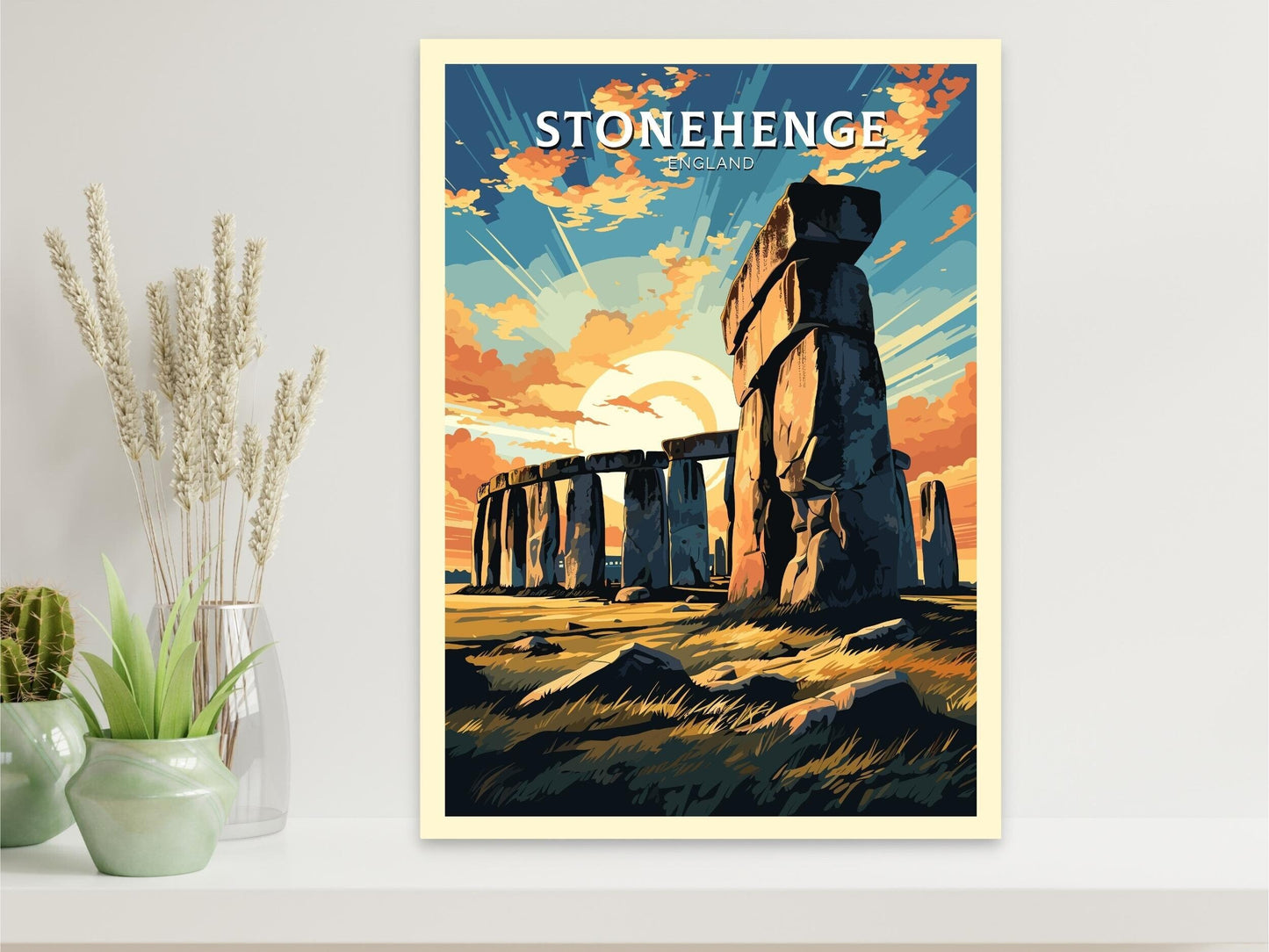 Imprimée sur un papier de qualité supérieure aux couleurs vives et aux détails raffinés, l' affiche de voyage Stonehenge apporte un peu du patrimoine préhistorique anglais chez vous. Que vous souhaitiez commémorer une visite, créer une galerie murale de souvenirs de voyage ou offrir un cadeau à un amateur de merveilles antiques, cette œuvre d'art est une pièce forte et pleine de sens.