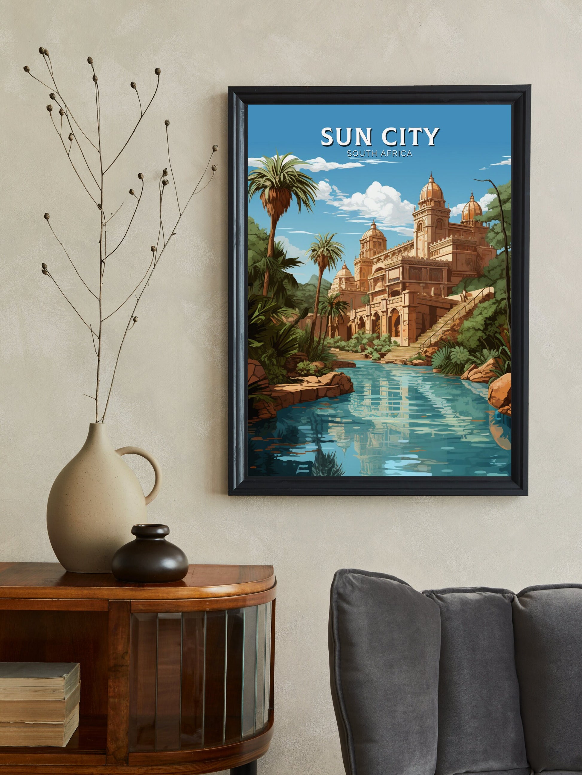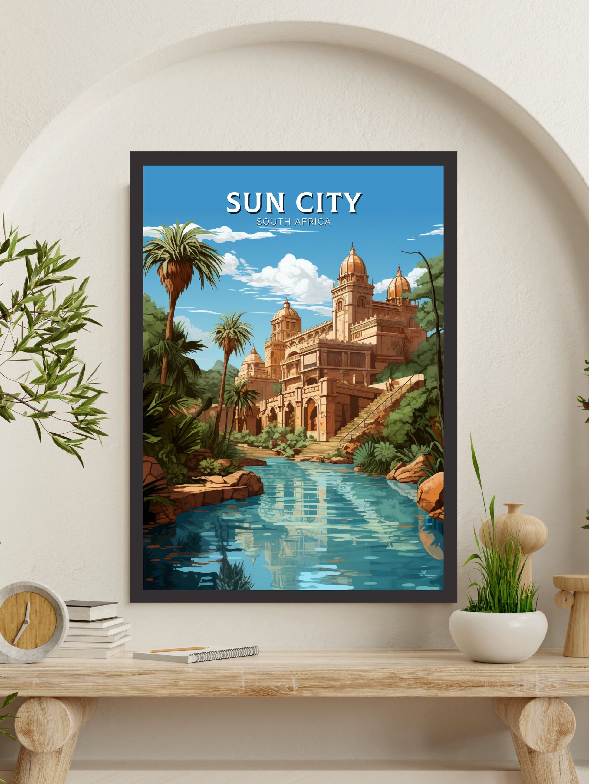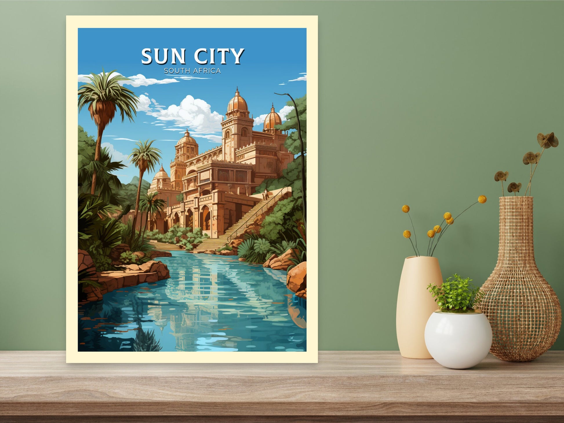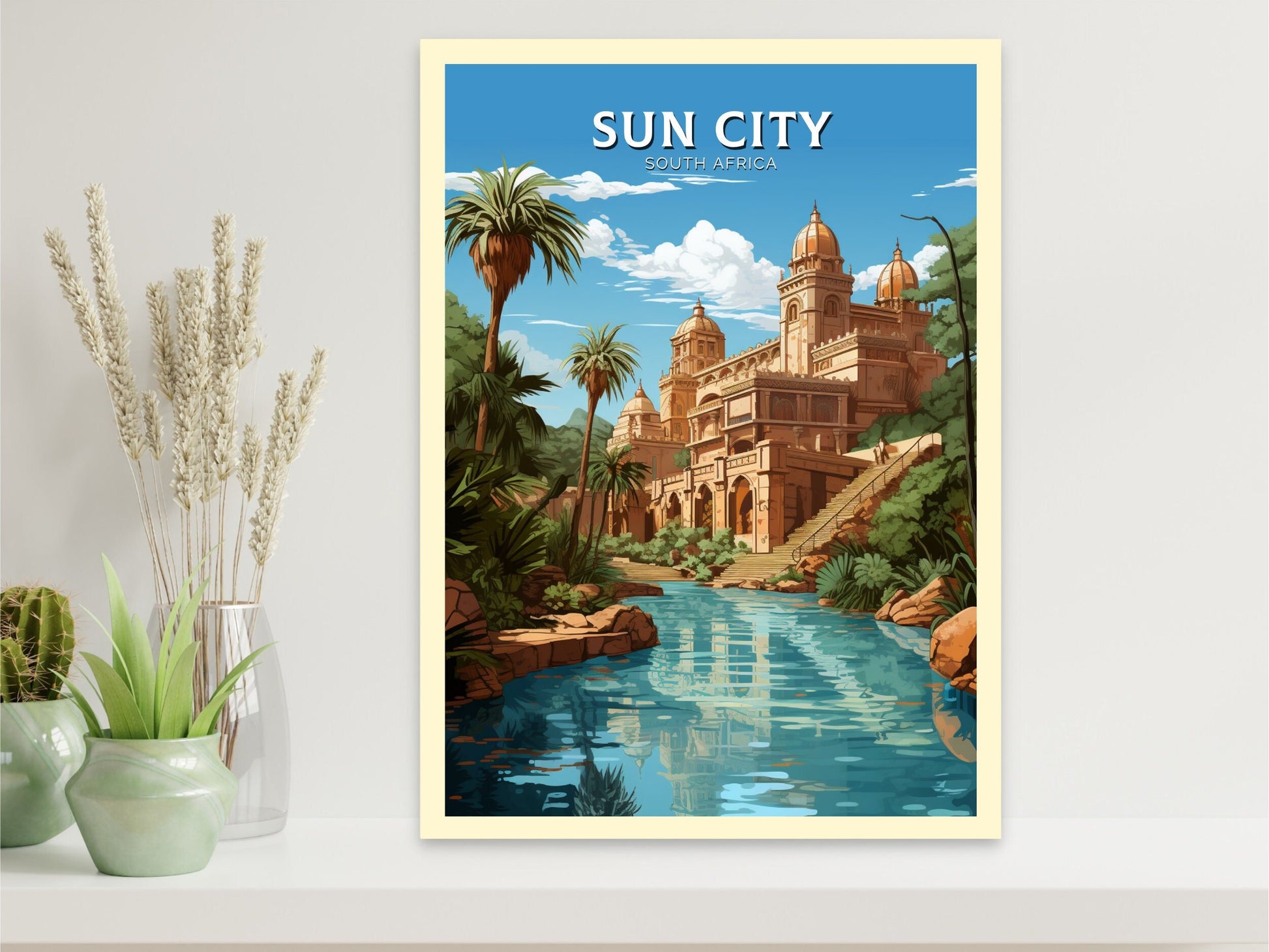 Notre affiche vintage Sun City plonge votre intérieur dans le charme glamour de Sun City, en Afrique du Sud, grâce à son design nostalgique. Idéale pour les passionnés de voyages et d'art rétro, elle capture le somptueux complexe hôtelier et l'emblématique Palais de la Cité Perdue dans un style intemporel. Que vous ayez visité sa splendeur ou rêvé de son charme, cette affiche vintage Sun City sera un atout déco exceptionnel.