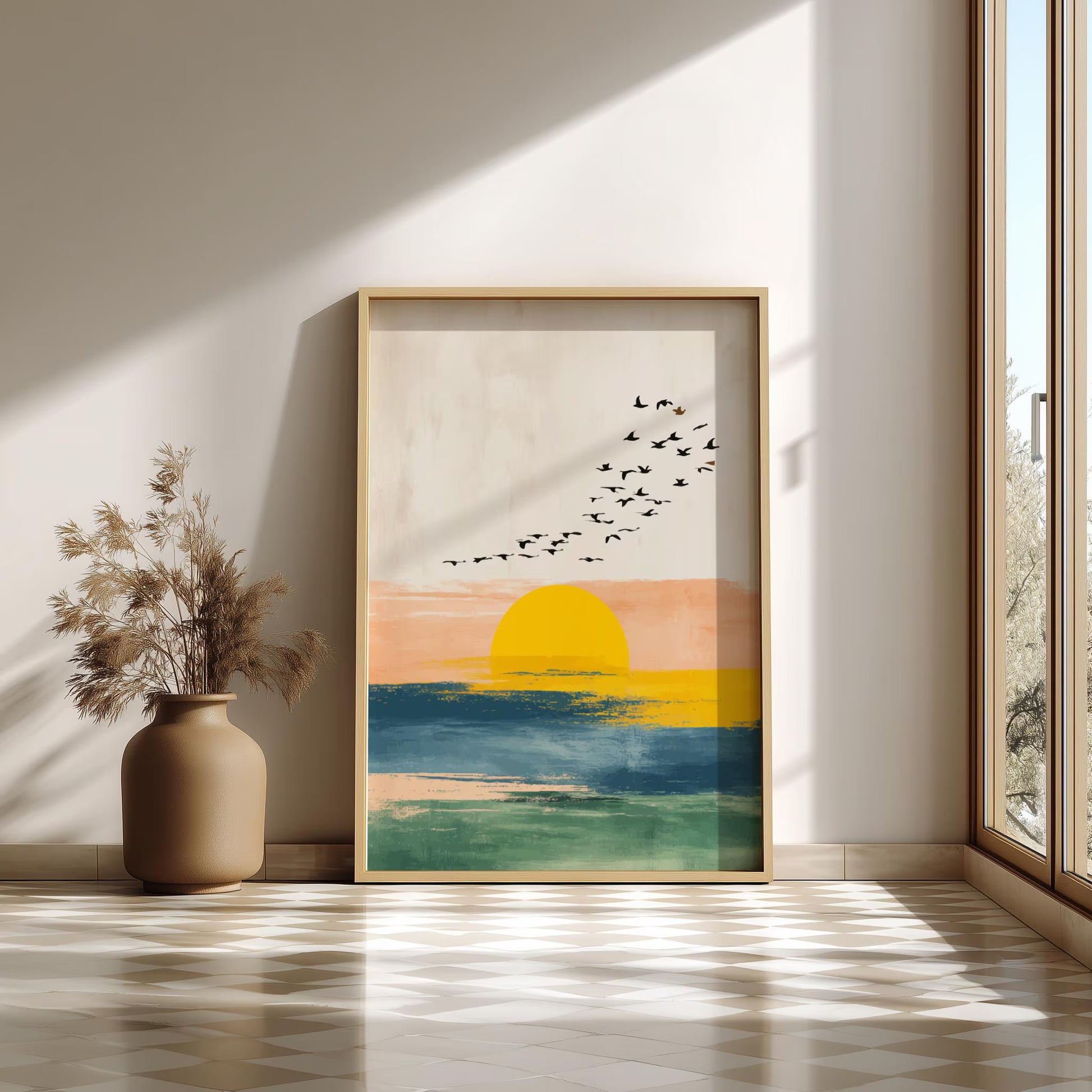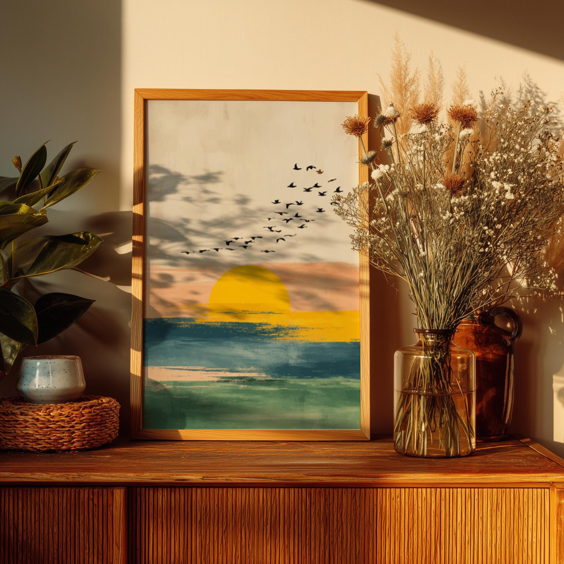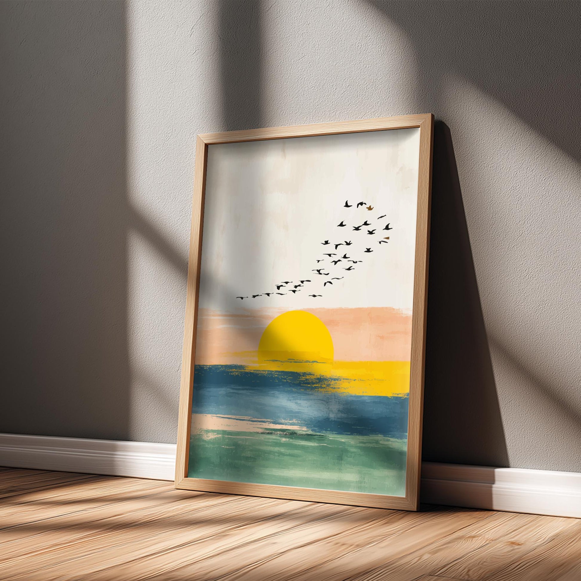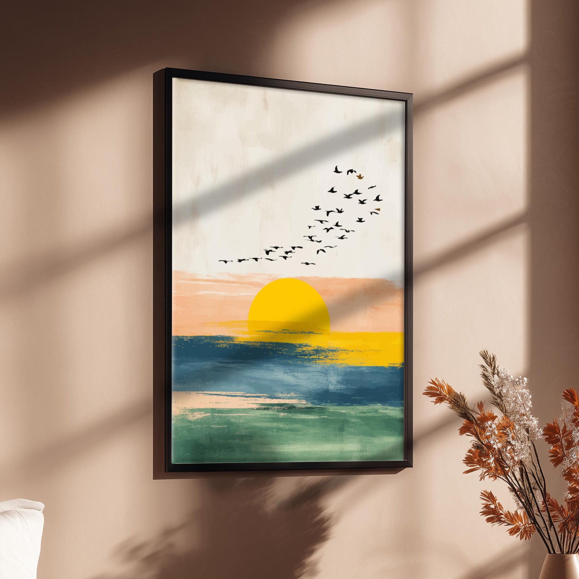 Inspirez votre intérieur du calme côtier avec cette magnifique œuvre d'art bohème Sunset Flock . Un soleil doré et éclatant se fond dans les vagues océaniques, tandis qu'une volée d'oiseaux se profile sur un ciel pastel doux. Cette œuvre mêle textures abstraites et éléments naturels pour évoquer une sensation de paix, de mouvement et de ciel ouvert.