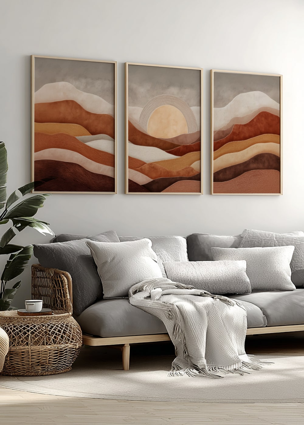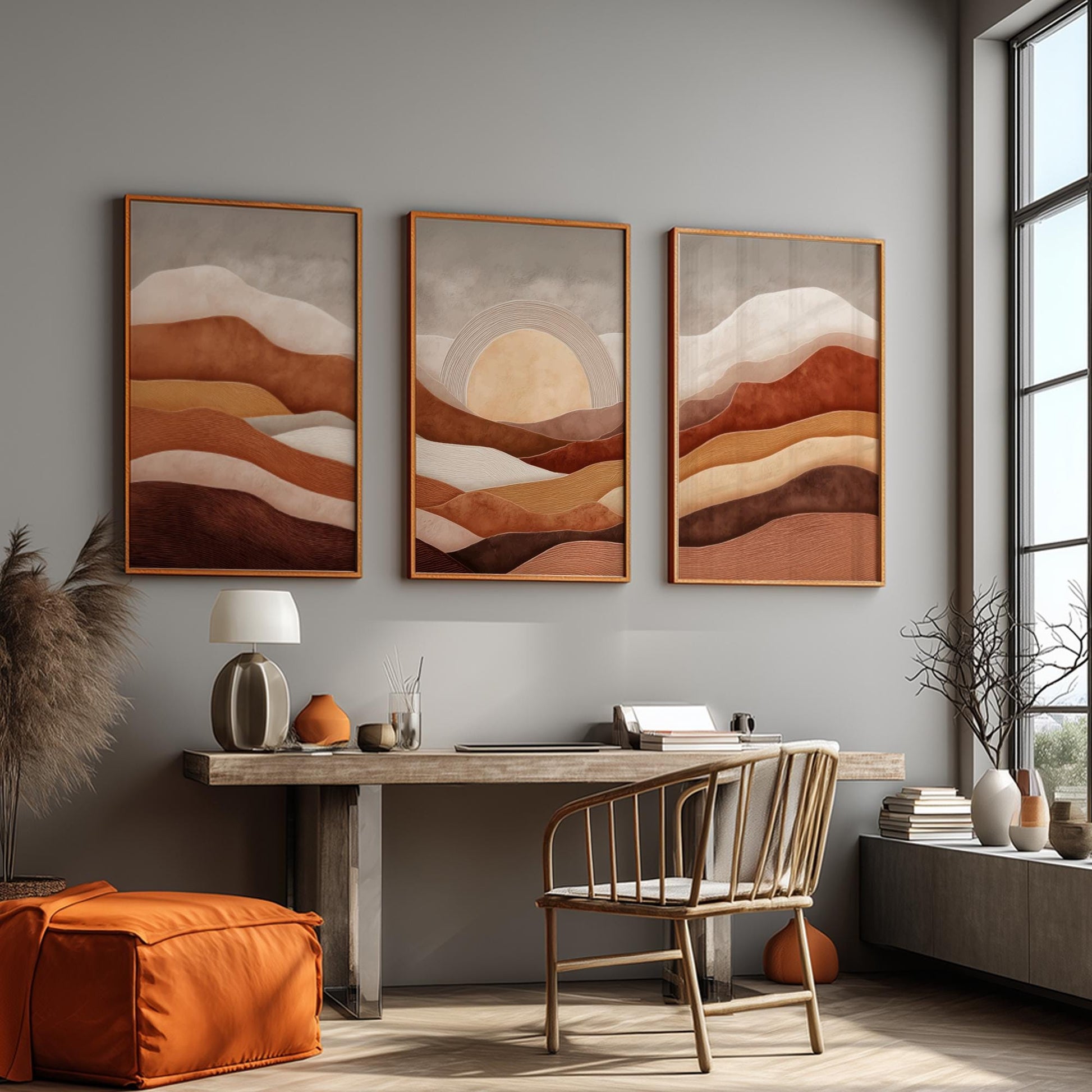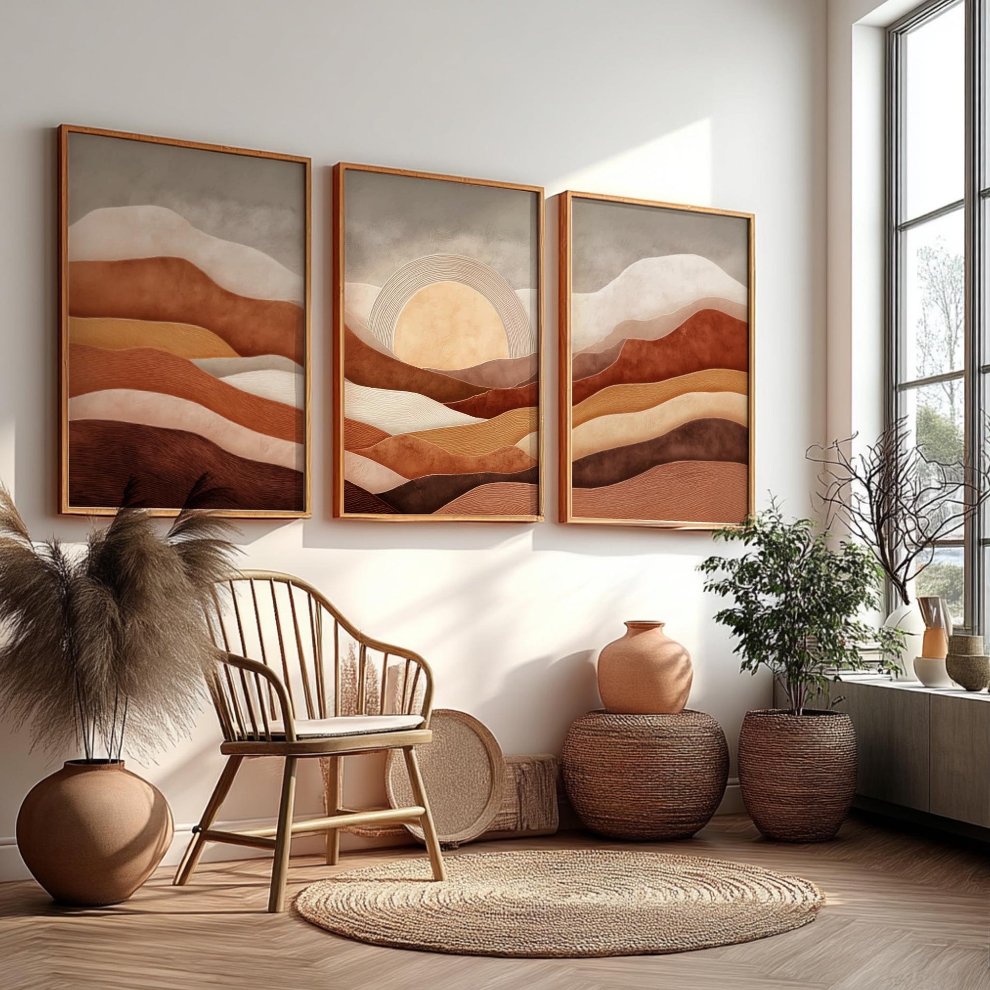 Apportez chaleur et équilibre à votre intérieur avec le lot de 3 impressions « Coucher de soleil sur les montagnes » – Paysage bohème aux tons terreux, décoration murale minimaliste . Avec ses dégradés doux, ses pics abstraits et ses teintes naturelles douces, cette œuvre évoque la beauté sereine d'un coucher de soleil sur les montagnes. Parfait pour les amateurs de décoration murale bohème , d'affiches de paysages minimalistes et d'intérieurs aux tons terreux , cet ensemble transforme n'importe quelle pièce en un havre de paix chaleureux et élégant.
