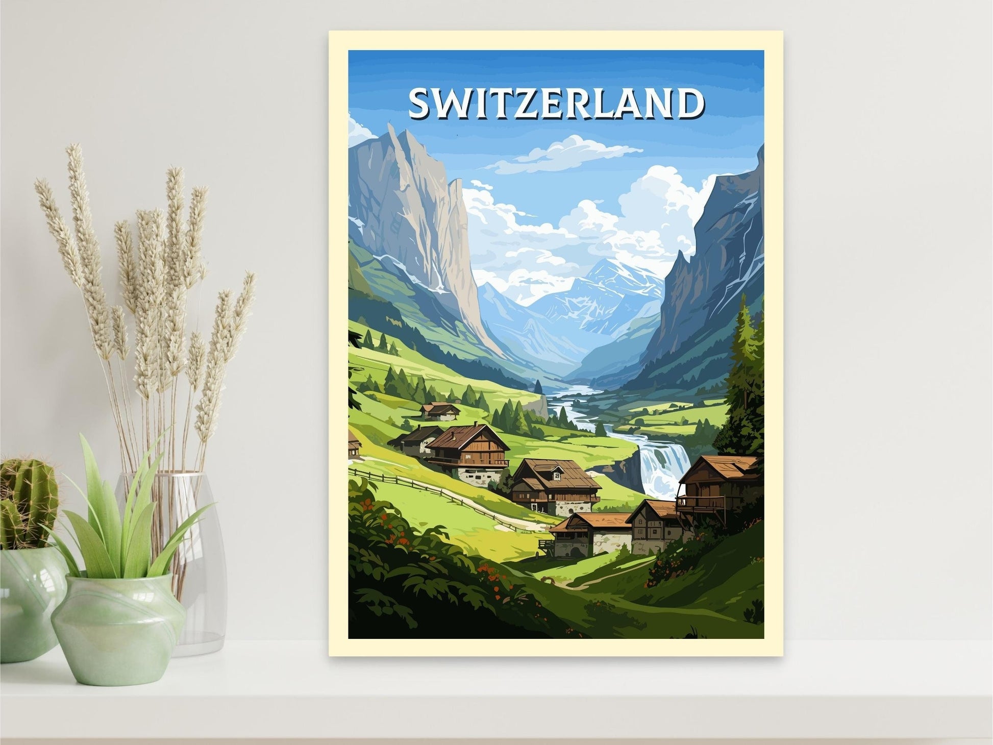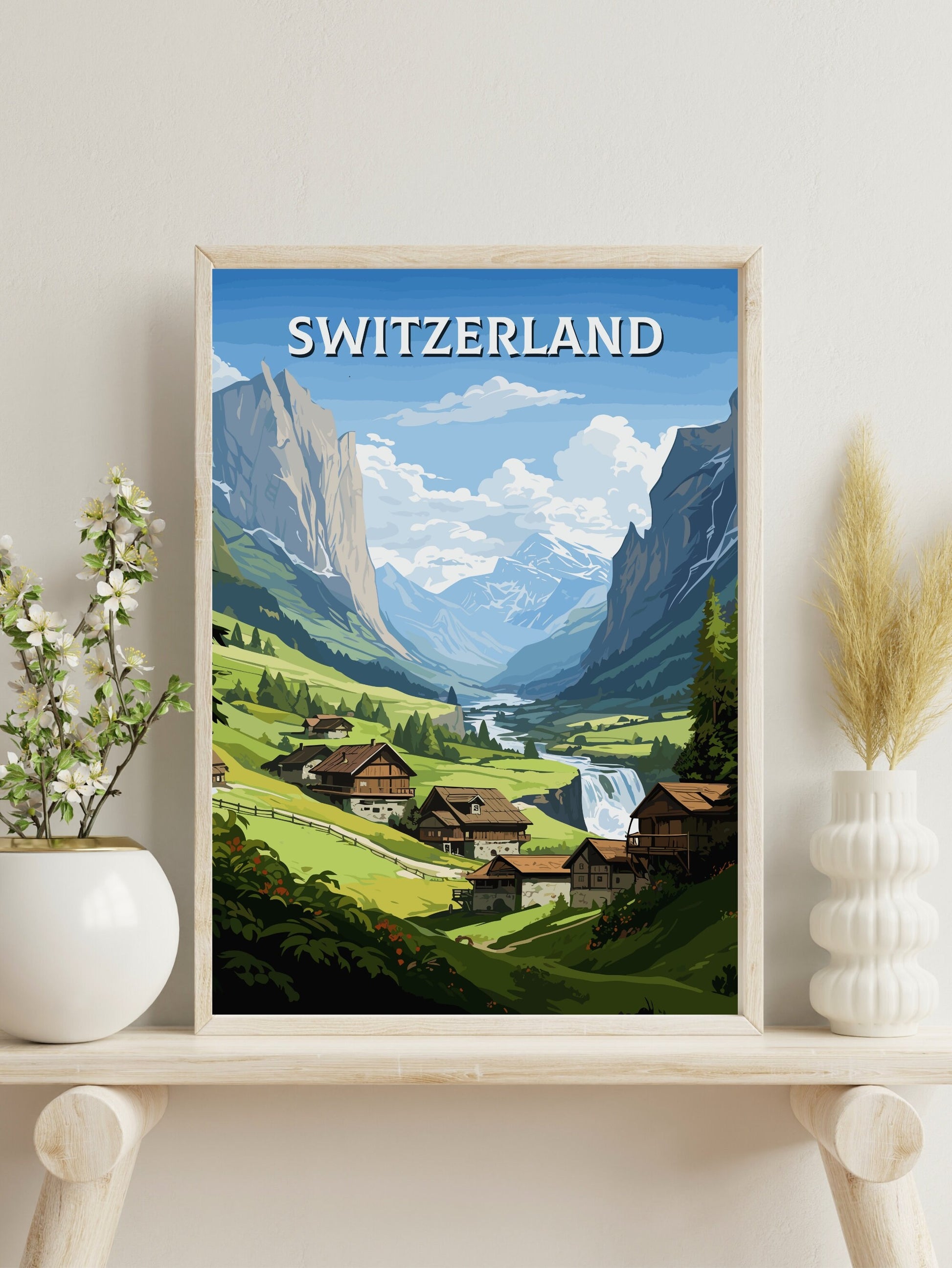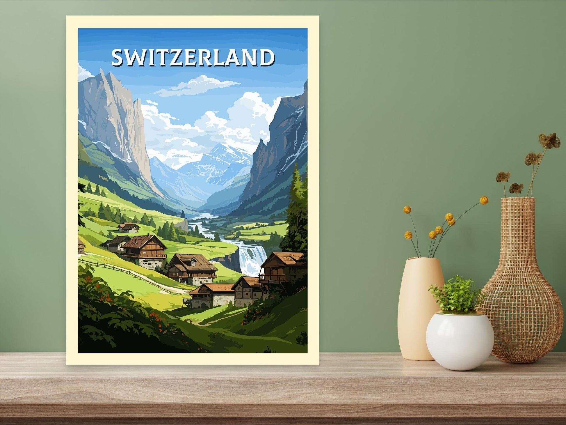 Imprimée sur du papier de qualité supérieure, avec des couleurs vives et des illustrations détaillées, cette affiche de voyage en Suisse apportera une touche d'élégance à votre maison, votre bureau ou votre mur de galeries sur le thème du voyage. Souvenir de vos aventures alpines ou élément de décoration élégant, cette affiche des Alpes suisses célèbre la beauté intemporelle de l'une des destinations les plus impressionnantes d'Europe.