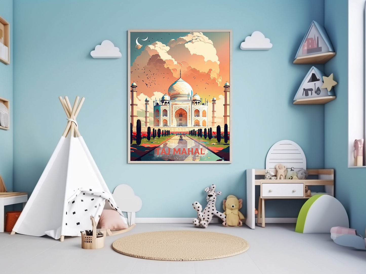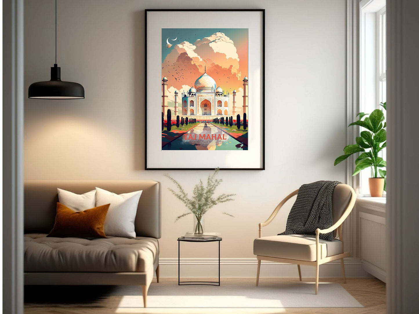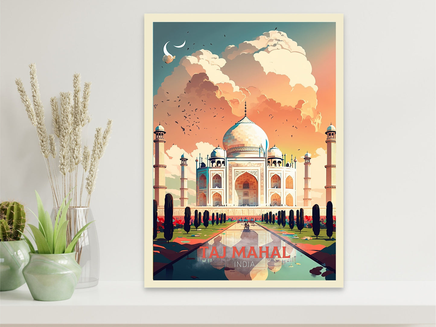 Transformez votre intérieur en un lieu enchanteur grâce à cette œuvre captivante. Idéale pour le salon, la chambre ou tout espace inspiré du voyage, elle s'harmonise parfaitement avec d'autres œuvres d'art rétro. Plus qu'un simple objet de décoration, cette affiche de voyage rétro est un voyage au cœur du joyau architectural de l'Inde.