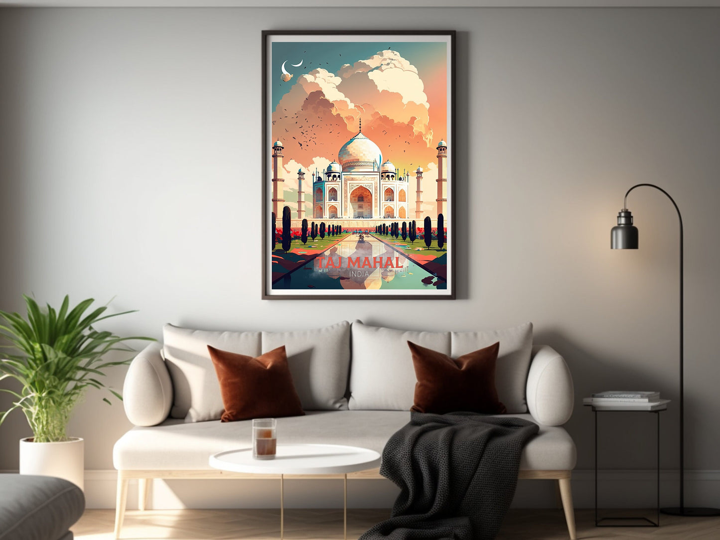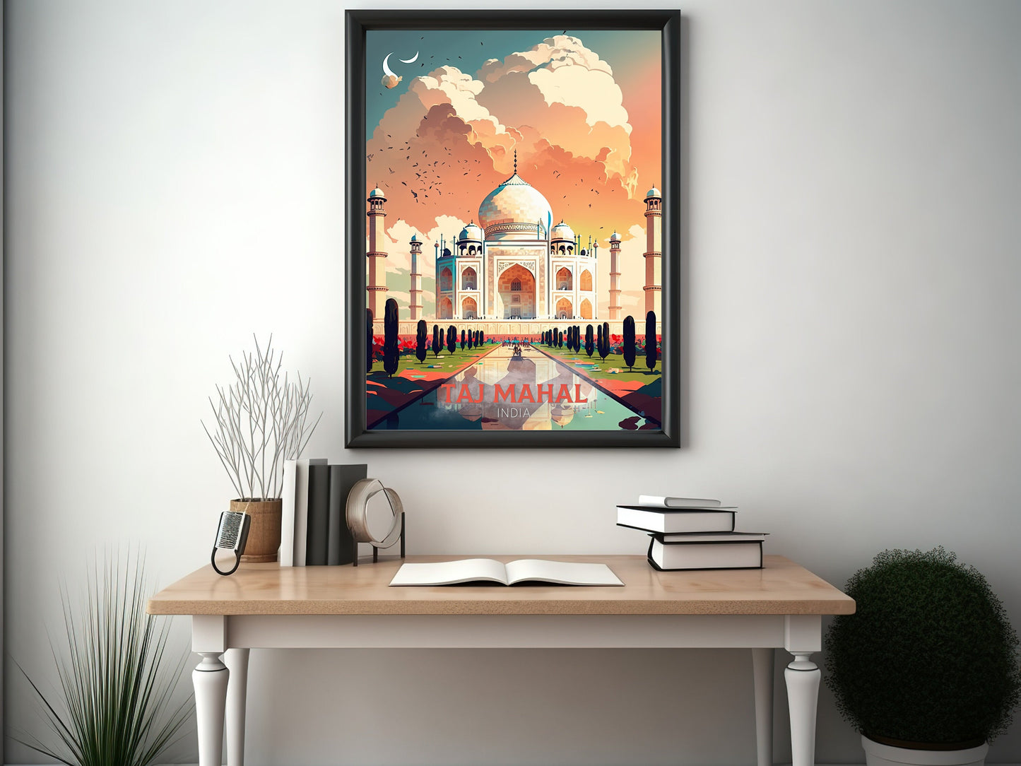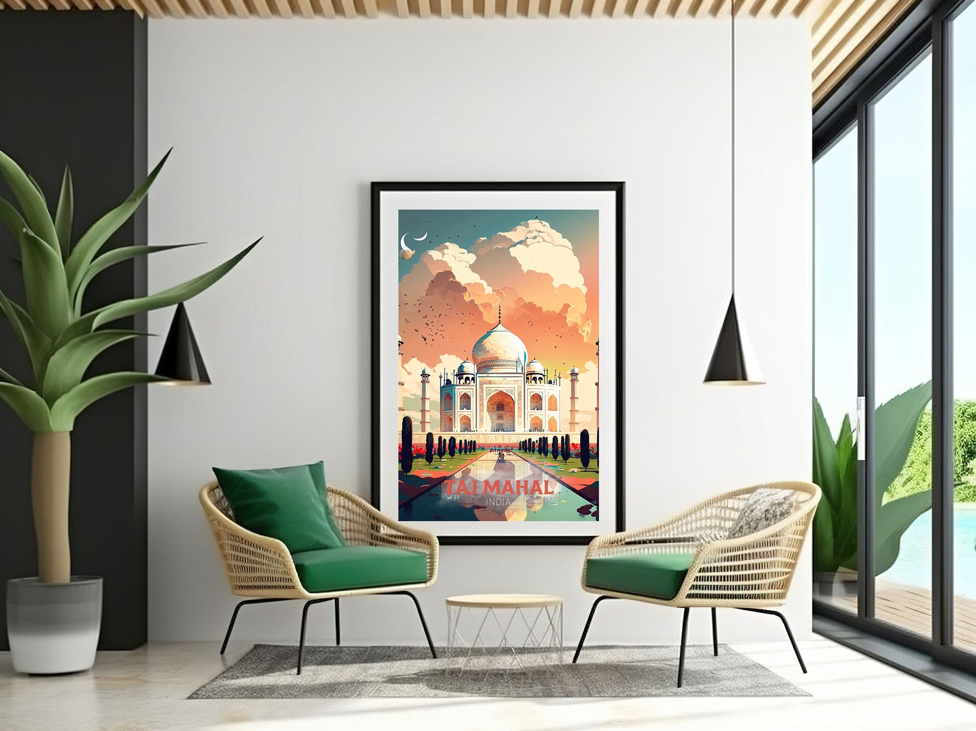 Transformez votre intérieur en un lieu enchanteur grâce à cette œuvre captivante. Idéale pour le salon, la chambre ou tout espace inspiré du voyage, elle s'harmonise parfaitement avec d'autres œuvres d'art rétro. Plus qu'un simple objet de décoration, cette affiche de voyage rétro est un voyage au cœur du joyau architectural de l'Inde.
