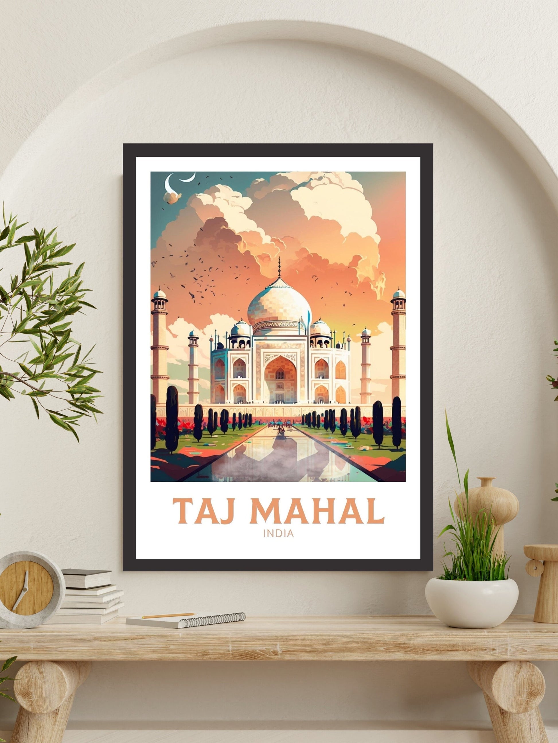 Cette œuvre mêle des blancs immaculés et des ors doux à l'essence majestueuse du Taj Mahal, mettant en valeur sa splendeur architecturale dans un style vibrant. Imprimée sur un papier de qualité supérieure, elle offre un éclat durable et une finition lisse, ce qui en fait un cadeau idéal pour les aventuriers ou les collectionneurs d'art. Cette affiche du Taj Mahal apporte une touche d'élégance indienne à tous vos murs.