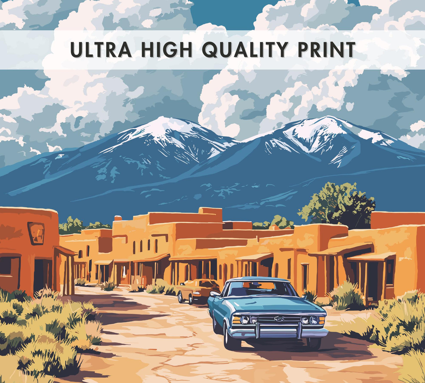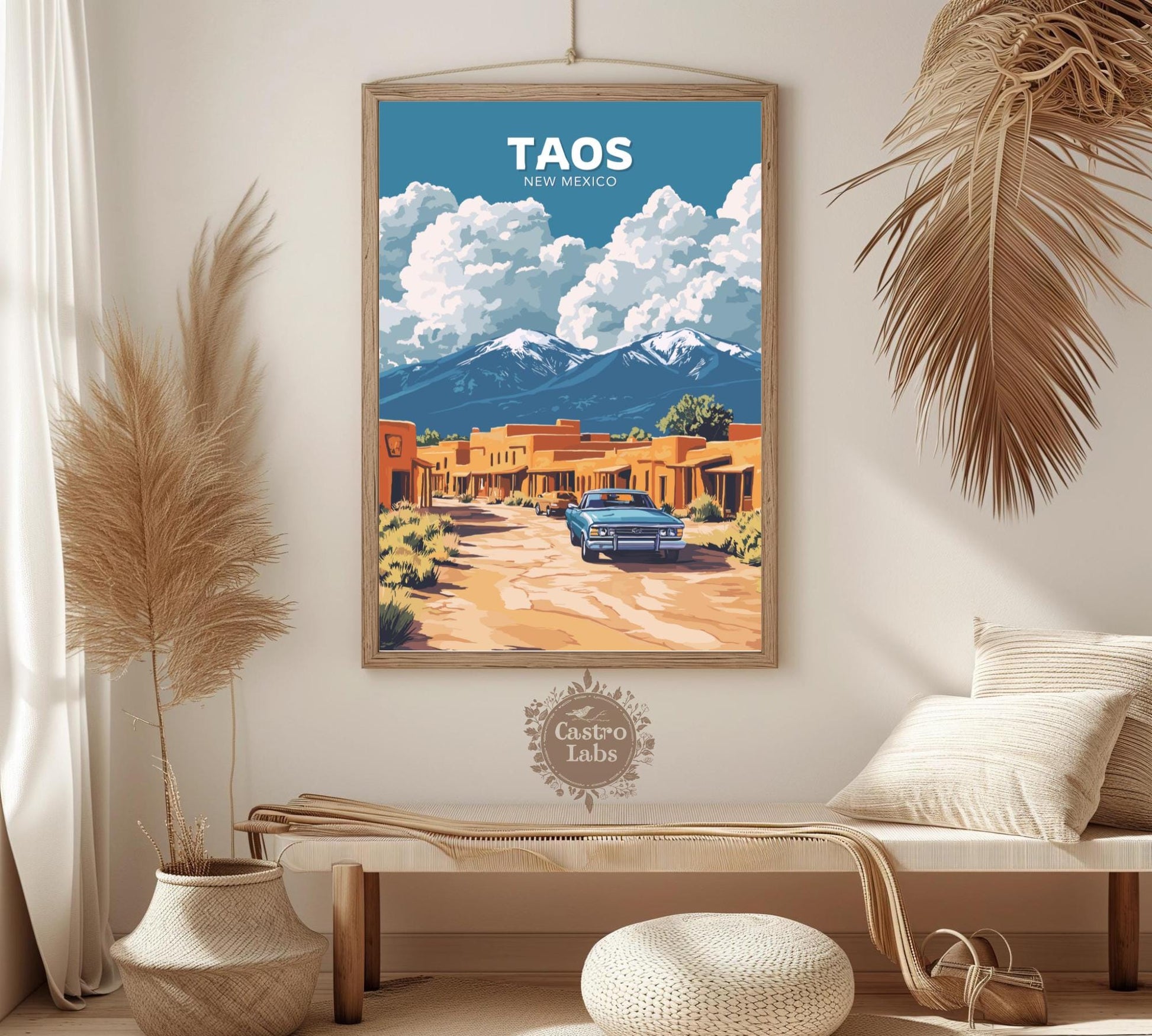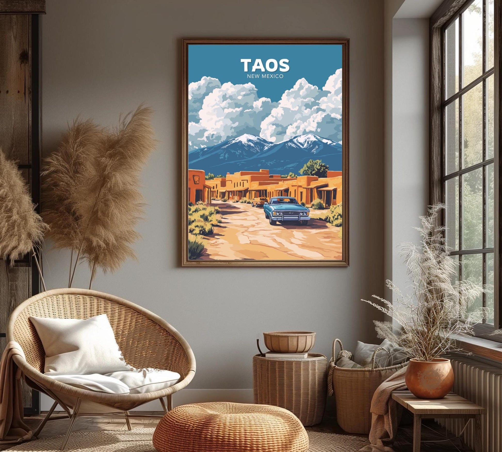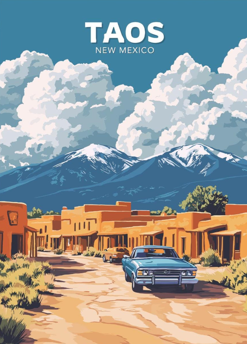 Notre affiche Taos vous transporte dans les déserts enchanteurs du Nouveau-Mexique grâce à son design captivant. Parfaite pour les amoureux du charme du Sud-Ouest, elle met en valeur l'architecture en adobe de Taos, ses montagnes majestueuses et son âme artistique vibrante. Que vous ayez exploré ses rues historiques ou admiré la beauté du désert, cette affiche Taos, au Nouveau-Mexique, est une façon magnifique de ramener chez vous ce pays enchanteur.