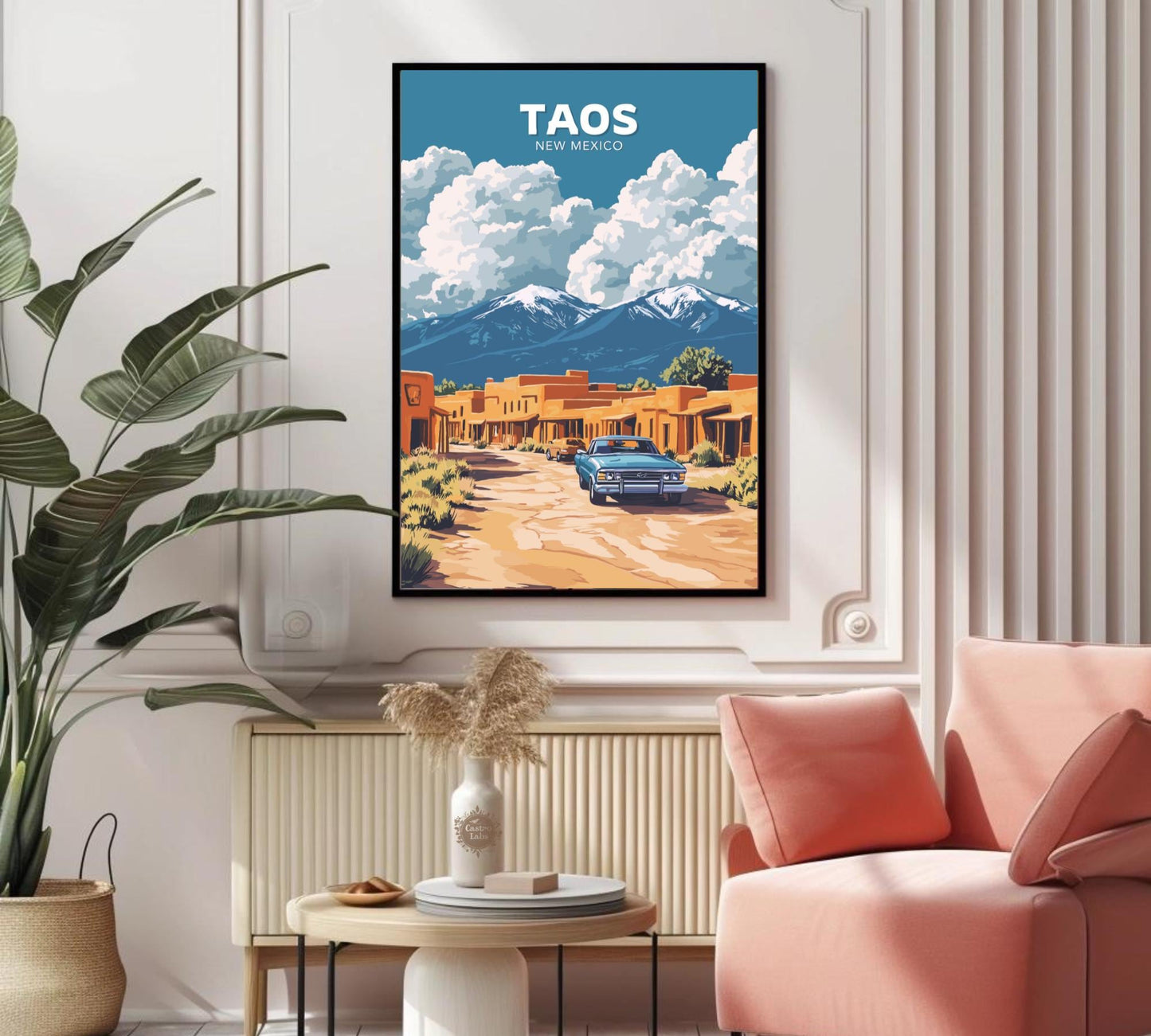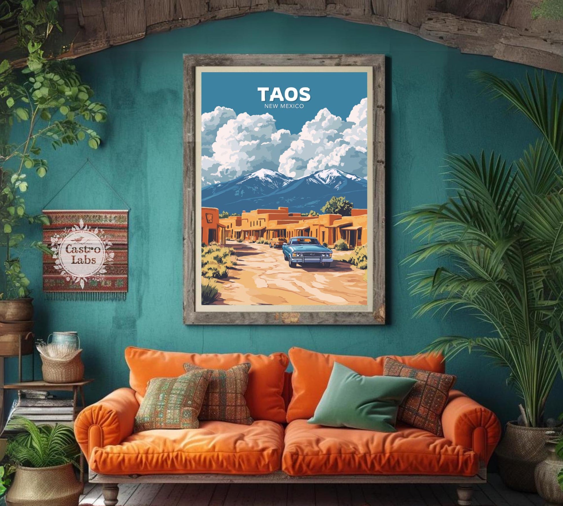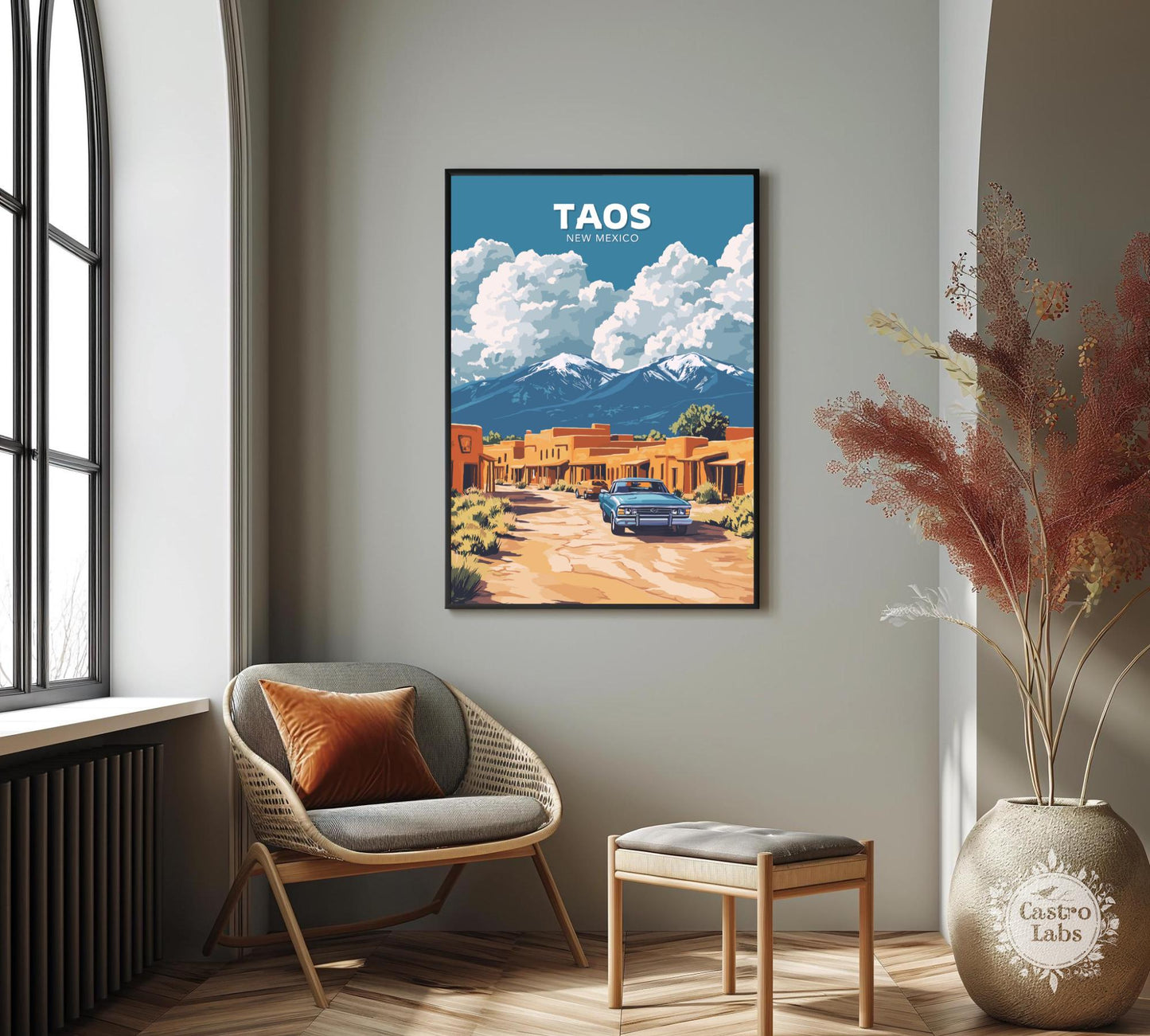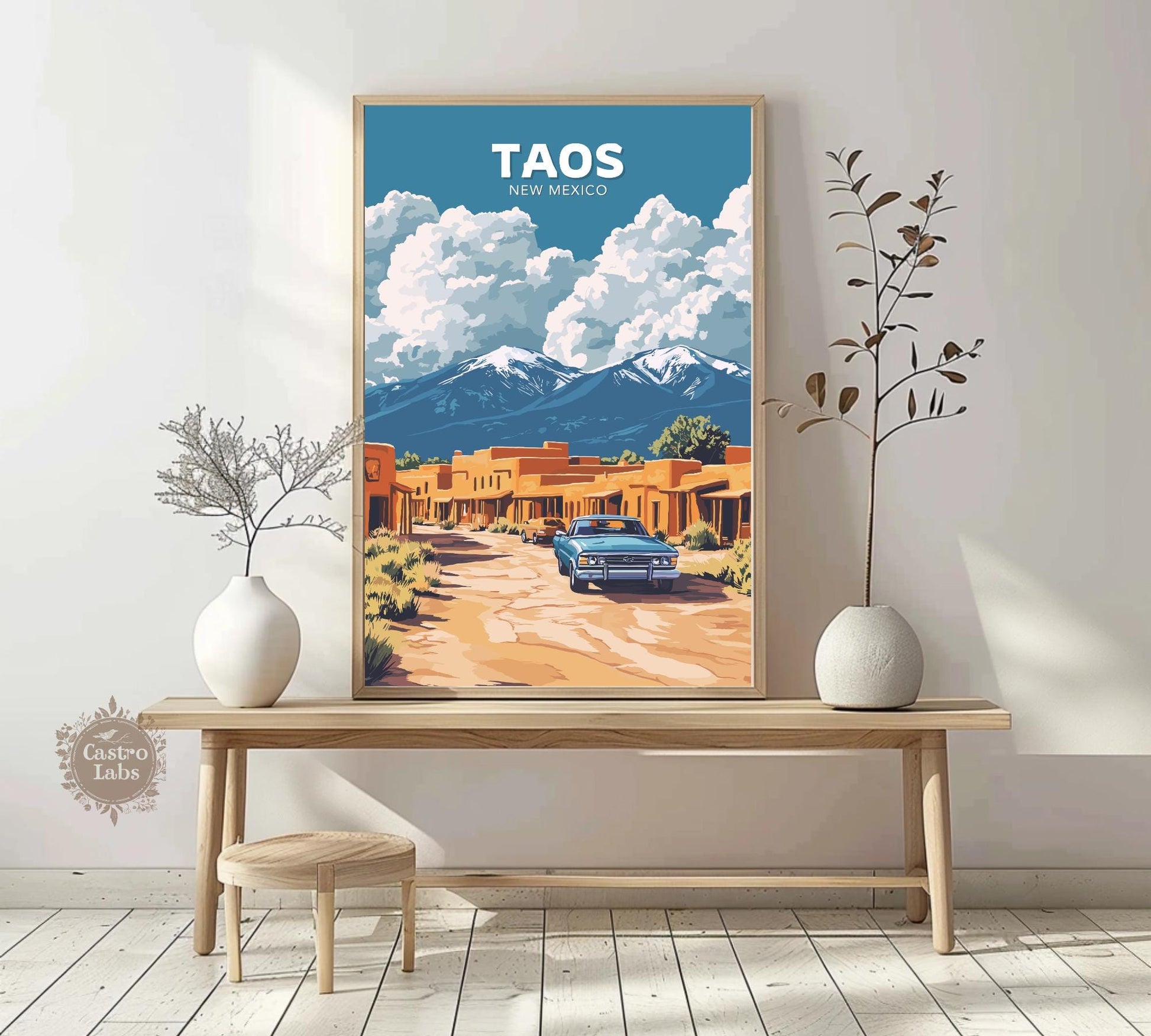 Notre affiche Taos vous transporte dans les déserts enchanteurs du Nouveau-Mexique grâce à son design captivant. Parfaite pour les amoureux du charme du Sud-Ouest, elle met en valeur l'architecture en adobe de Taos, ses montagnes majestueuses et son âme artistique vibrante. Que vous ayez exploré ses rues historiques ou admiré la beauté du désert, cette affiche Taos, au Nouveau-Mexique, est une façon magnifique de ramener chez vous ce pays enchanteur.