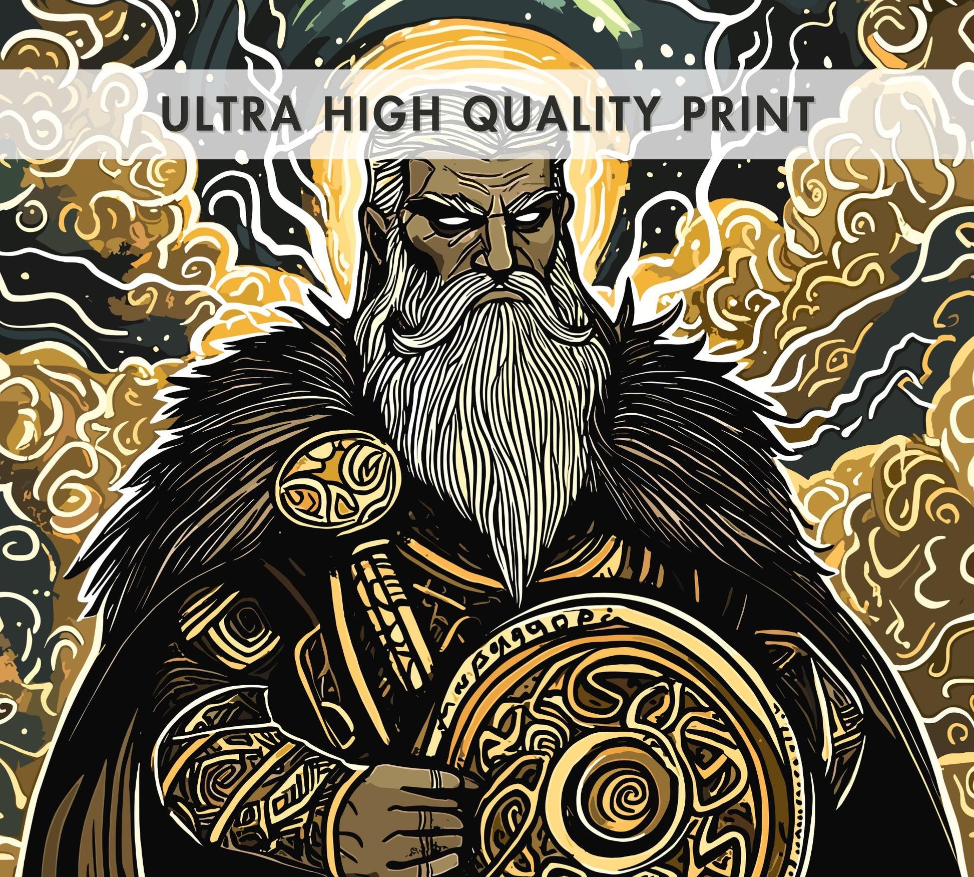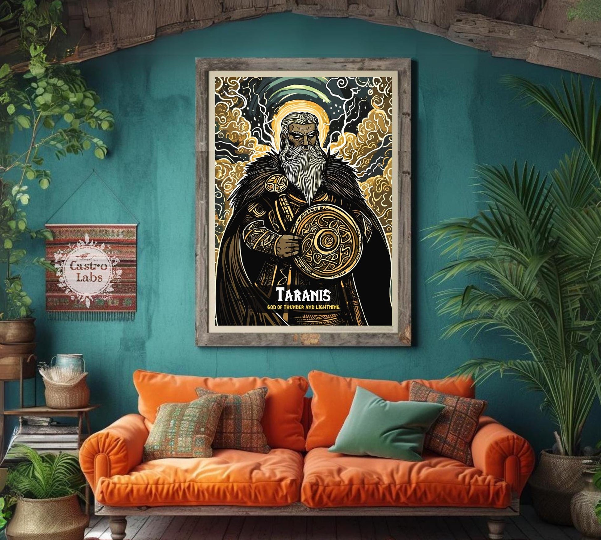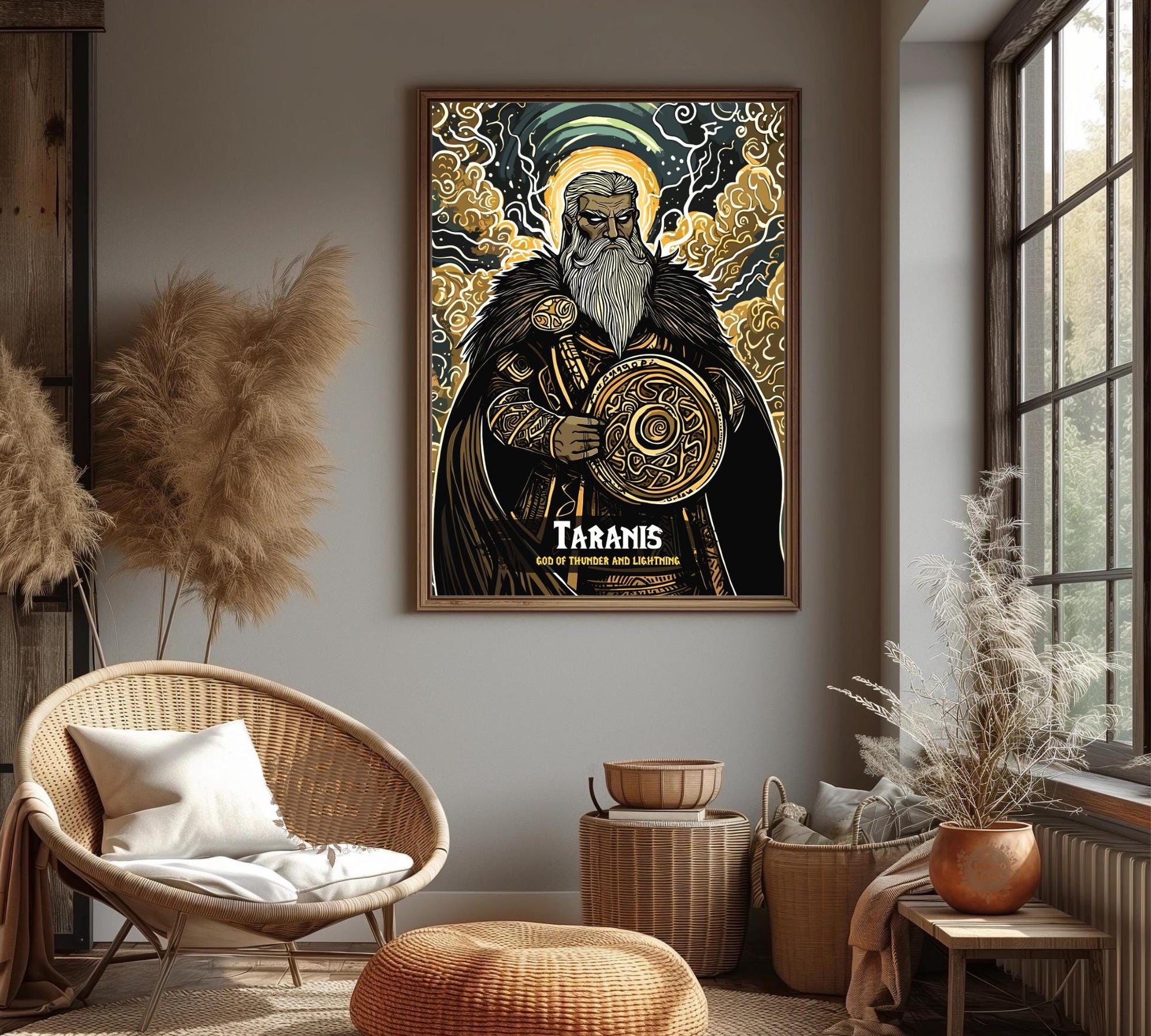 Le tonnerre gronde tandis que cette estampe du dieu Taranis électrise vos murs, le dieu celtique de la tempête saisissant sa roue du destin. Tiré des cieux tempétueux de la tradition celtique, il se dresse avec une aura crépitante, maître de la foudre et du chaos.