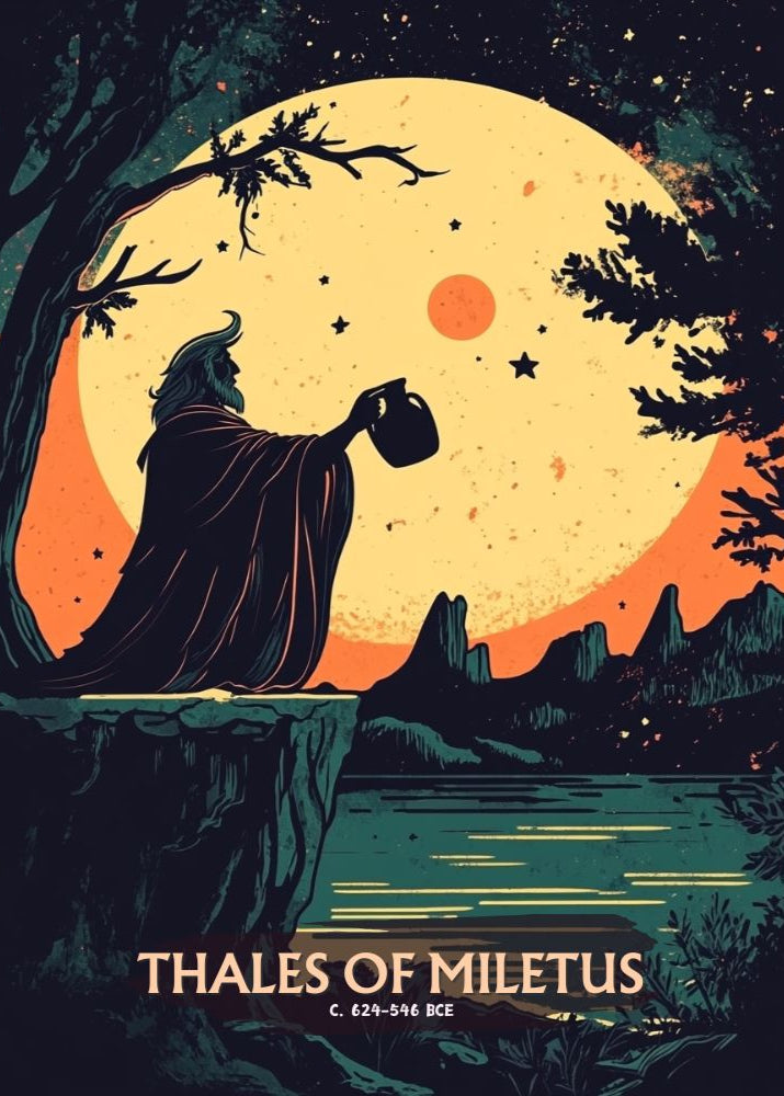 Cette affiche de Thalès de Milet représente le penseur grec dans une pose calme, le regard fixé sur les racines de la nature. Elle présente Thalès avec un regard serein, lié à sa quête précoce de connaissance.