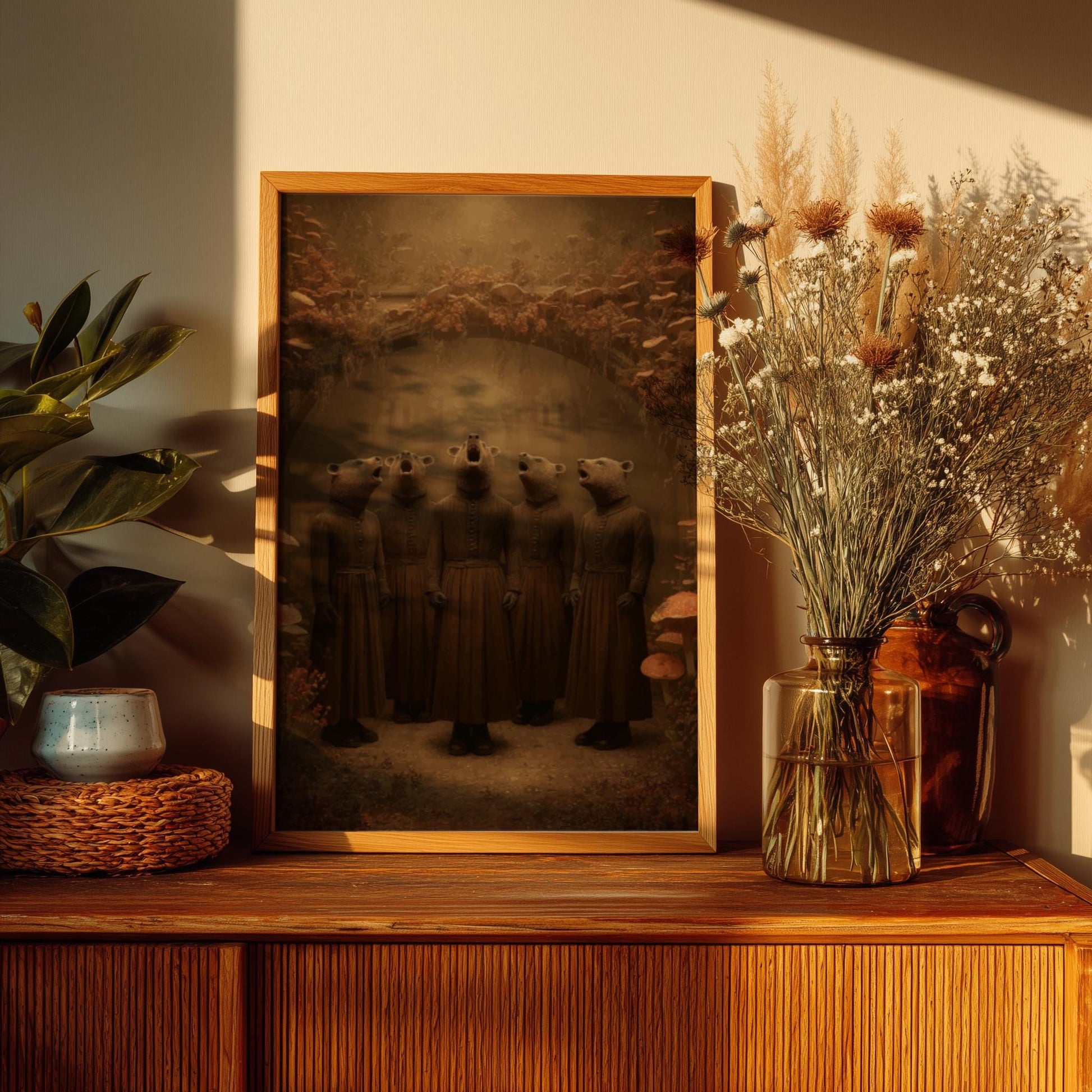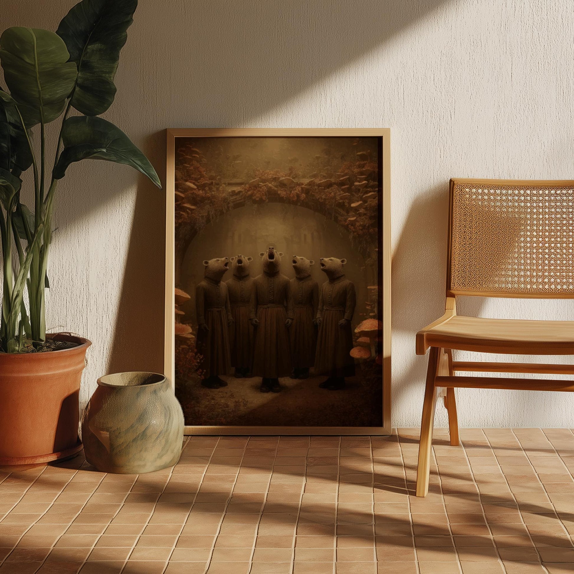 Plongez dans un monde d'harmonie inquiétante avec « Le Chœur des Ours » – Affiche d'art victorienne représentant un chœur animalier . Cette affiche gothique surréaliste représente un groupe d'ours anthropomorphes vêtus de costumes victoriens, réunis dans un décor boisé envoûtant, comme s'ils exécutaient un sombre rituel choral. Parfaite pour les amateurs d'art mural gothique, d'affiches animalières surréalistes et de décorations inspirées des bois, cette œuvre allie élégance, mystère et une touche de macabre.
