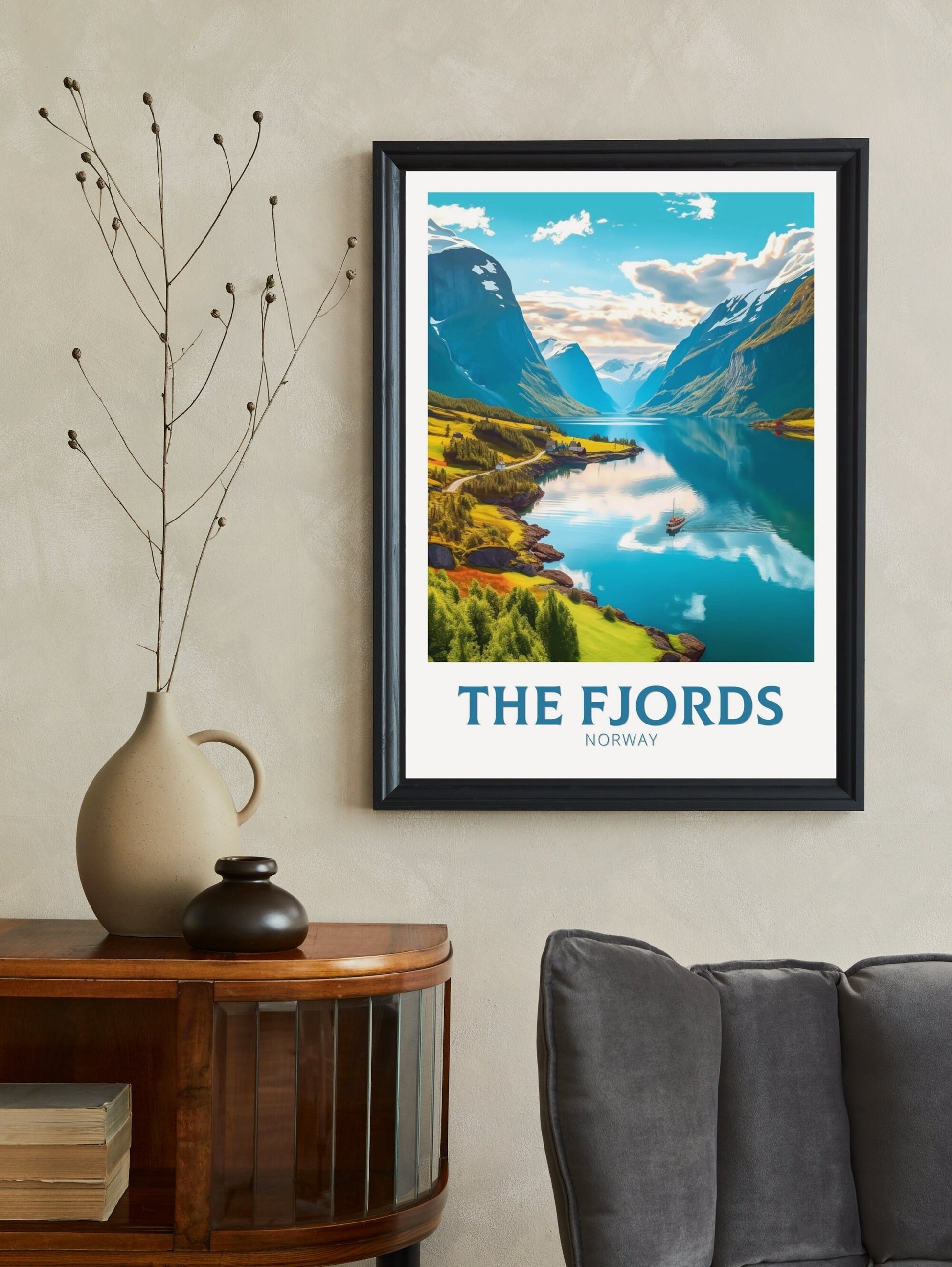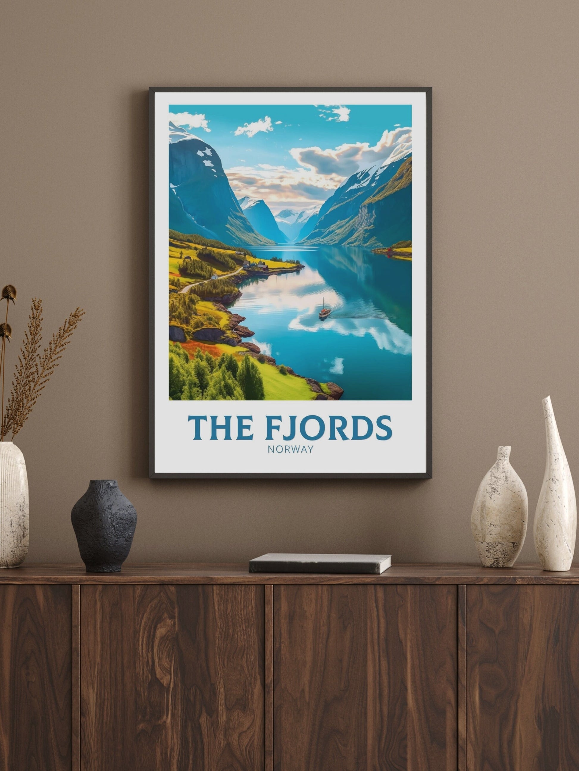 Imprimée sur un papier de qualité supérieure aux couleurs vives et aux détails précis, l'affiche de voyage « Les Fjords » est un ajout remarquable à votre maison, votre bureau ou votre mur de galerie. Souvenir de voyage ou magnifique objet de décoration, cette œuvre célèbre la grandeur intemporelle de la région des fjords norvégiens.