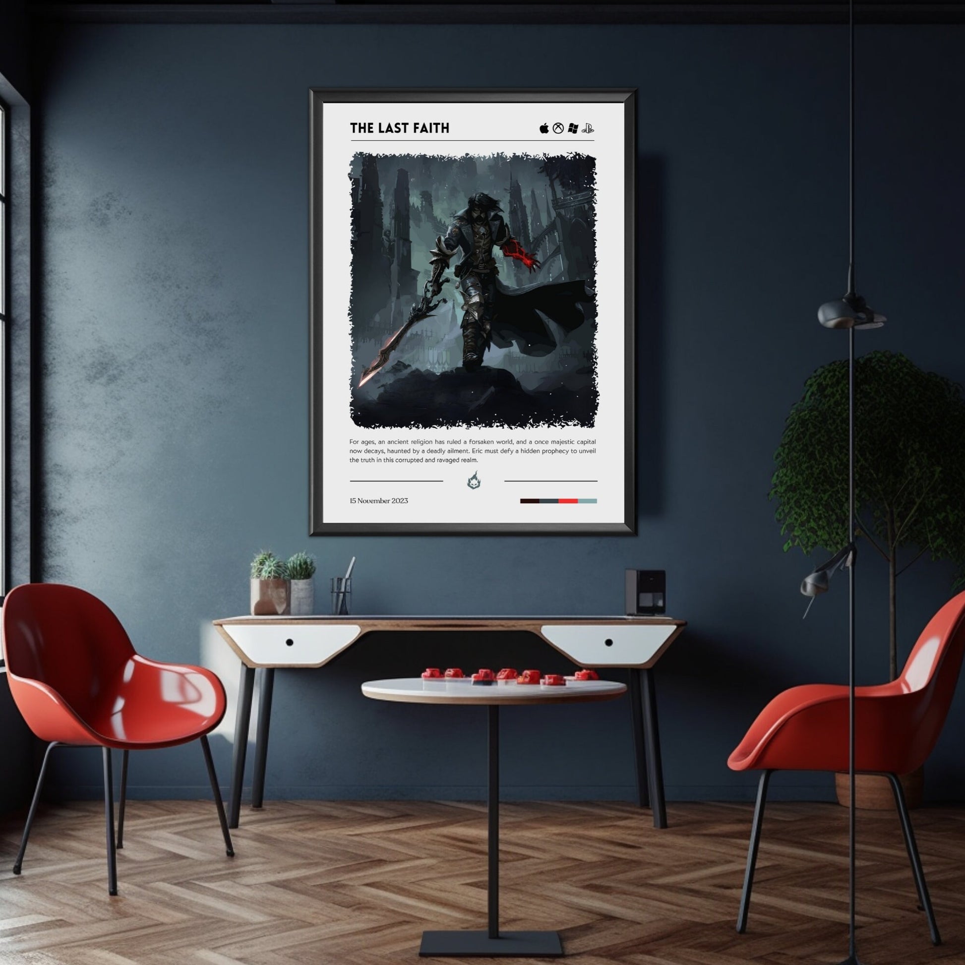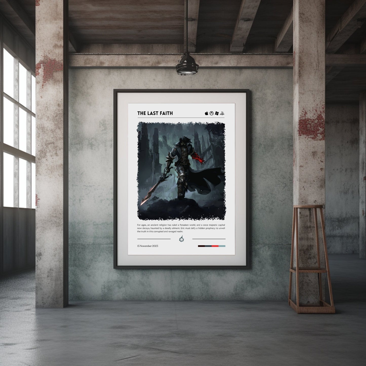 L'affiche The Last Faith est l'affiche gothique ultime inspirée des souls-like pour les fans de dark fantasy, de jeux de rôle d'action et d'œuvres d'art inspirées des jeux vidéo. Cette affiche dark fantasy de haute qualité capture l'esthétique envoûtante et magnifique des paysages étranges, des héros menaçants et de l'architecture gothique, ce qui en fait un objet de collection incontournable pour les joueurs, les amateurs de jeux de rôle sur table et les amateurs d'art fantastique. Idéale pour décorer une chambre, une salle de jeux ou un bureau, cette affiche inspirée des souls-like apporte une ambiance gothique immersive à n'importe quel espace, attirant les fans de jeux de rôle, de fantasy médiévale et d'œuvres d'art macabres.