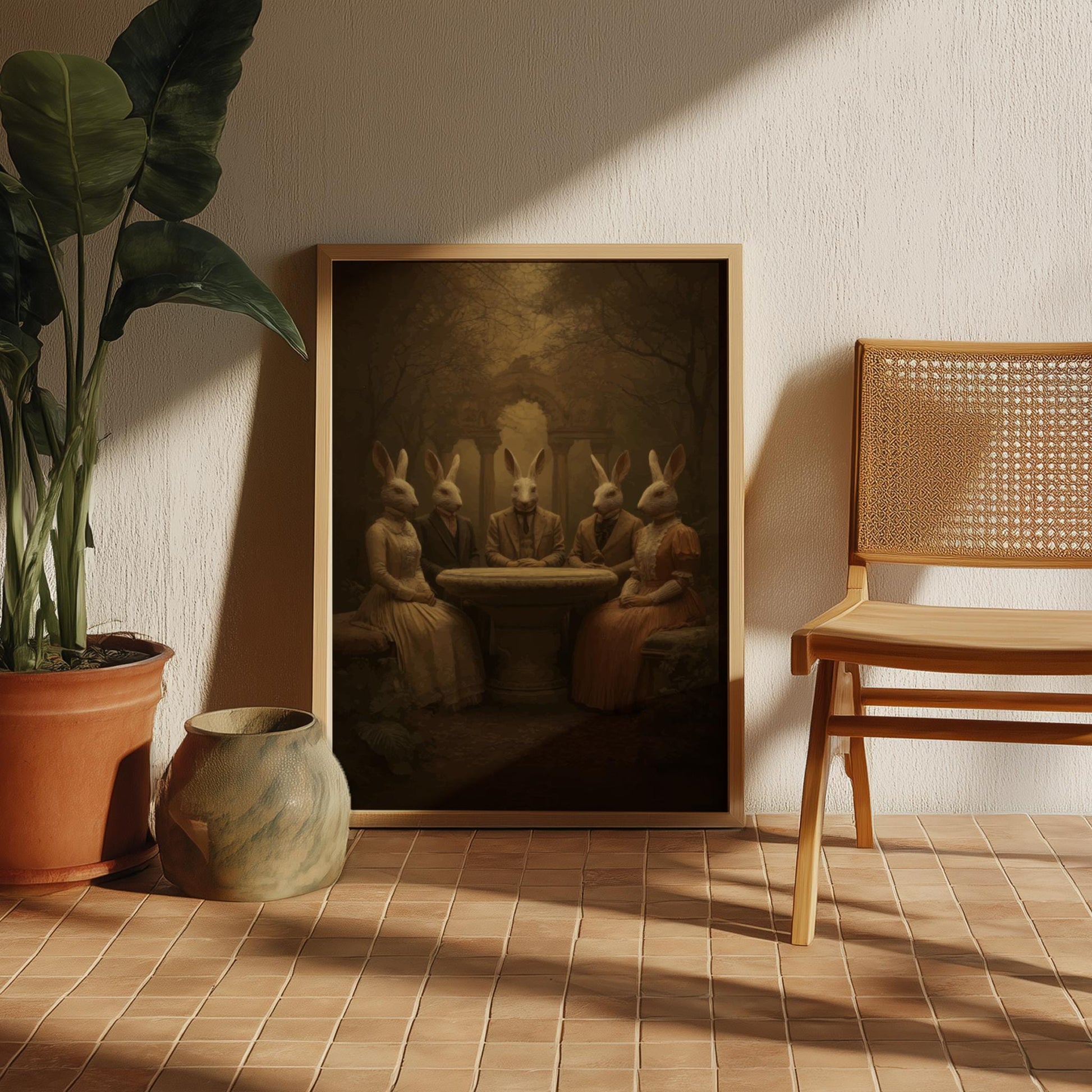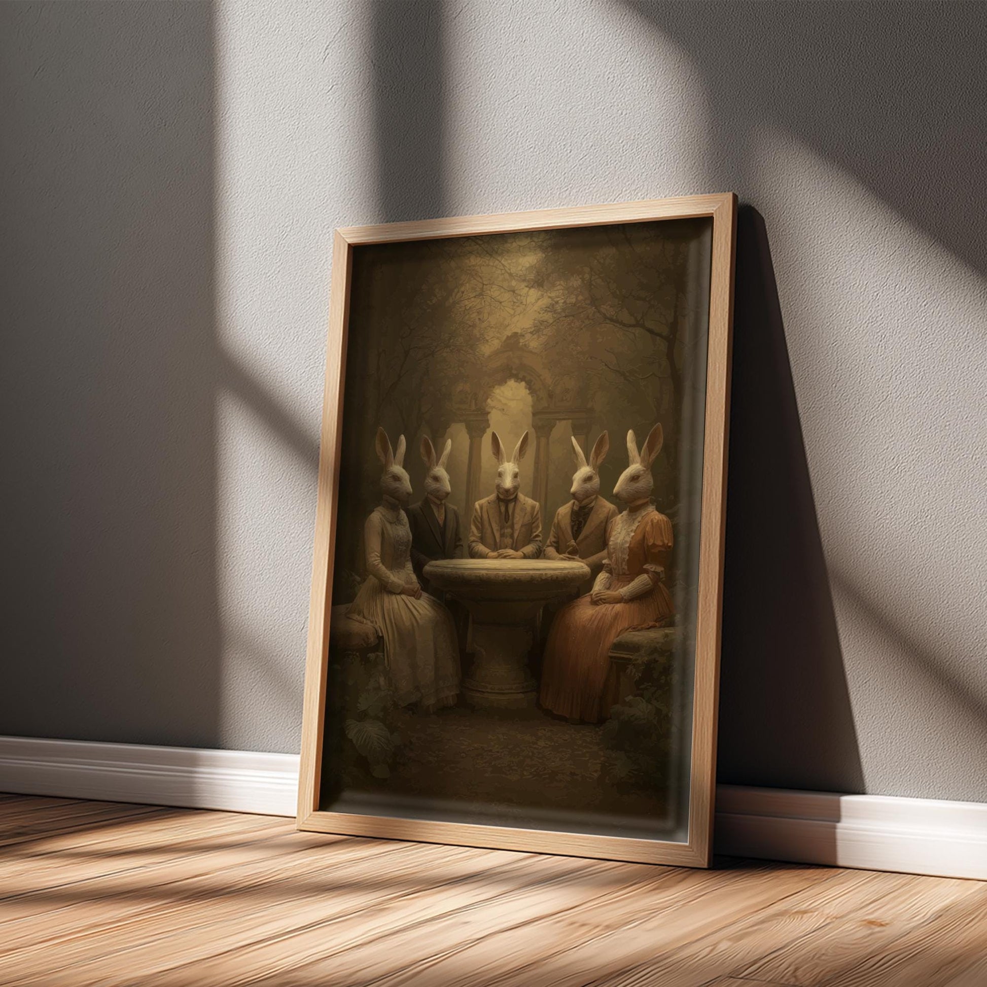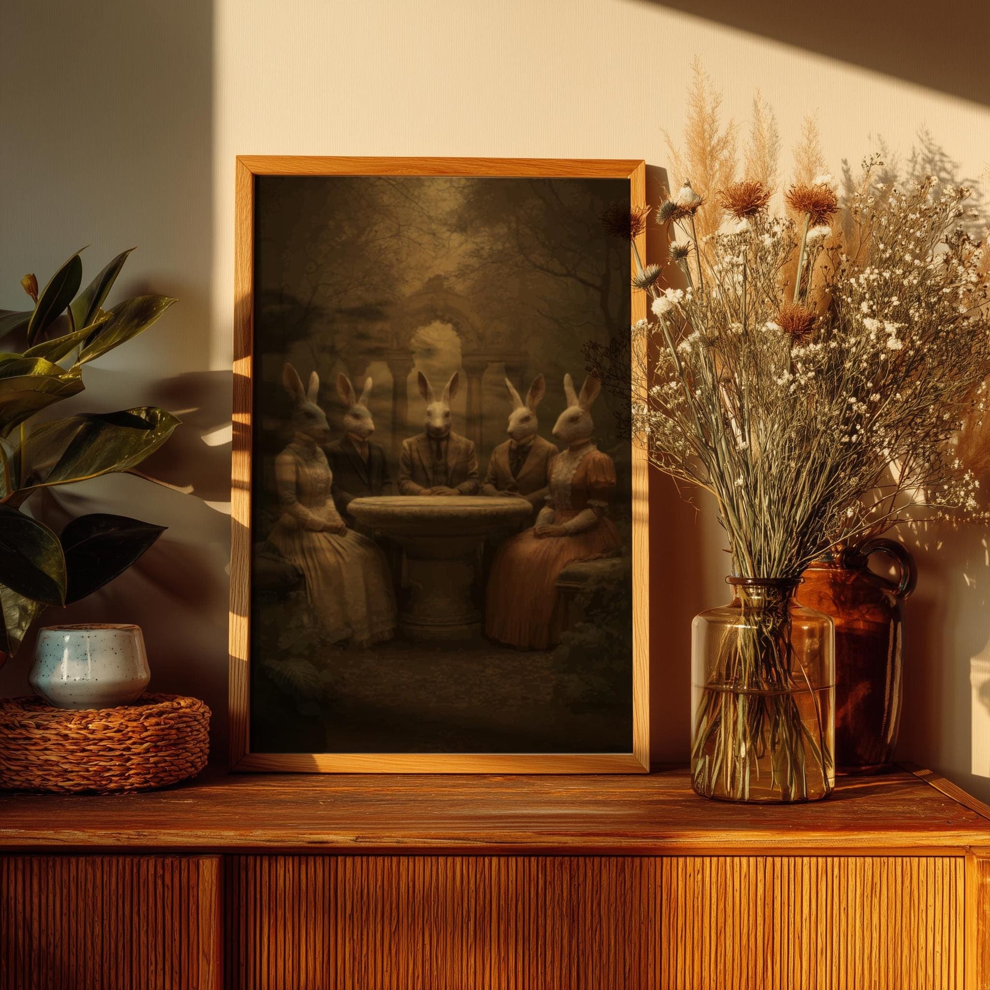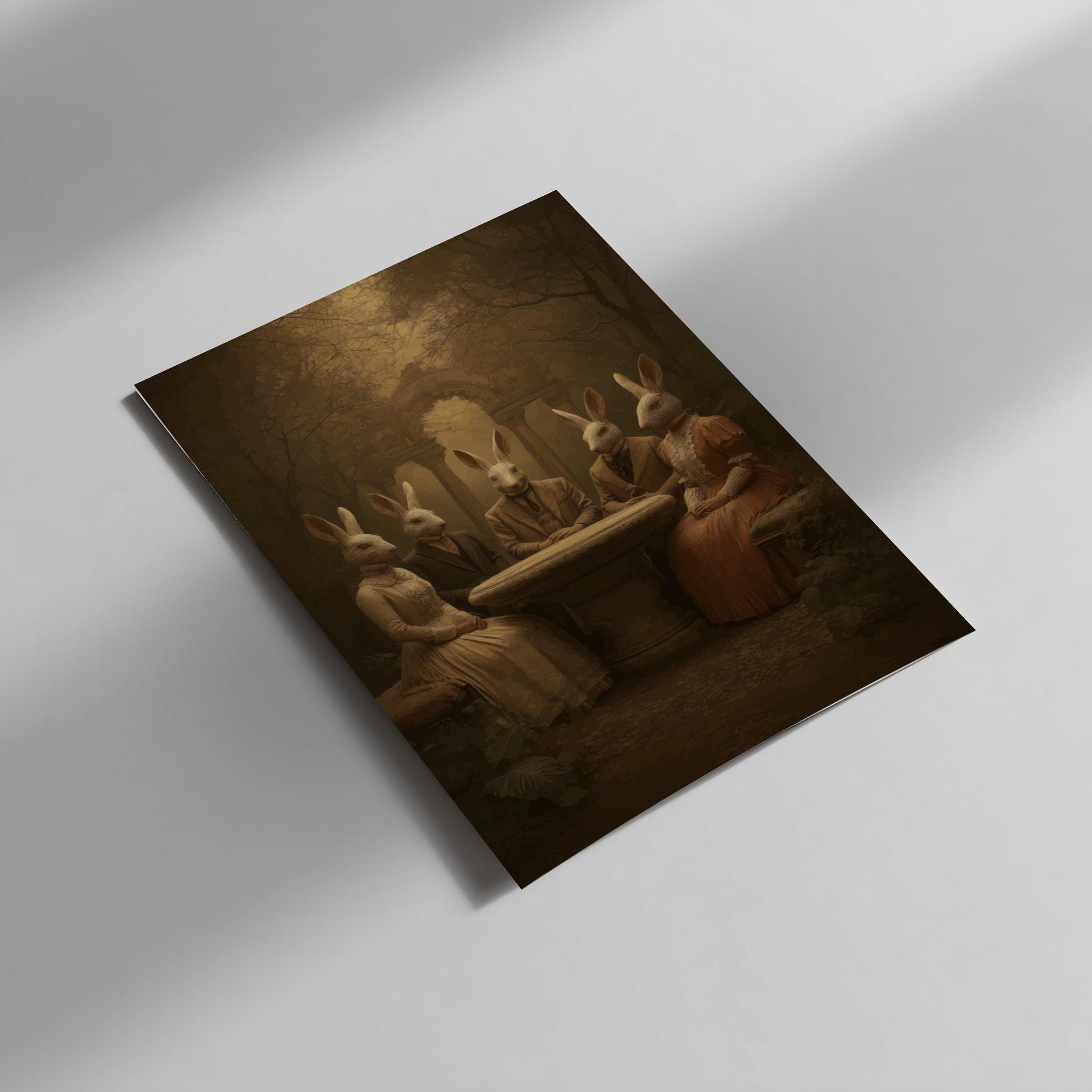 Plongez dans un monde de gouvernance inquiétante avec « Le Conseil des Lapins » – Impression Forêt Gothique Surréaliste . Cette œuvre envoûtante représente un rassemblement de lapins anthropomorphes dans une forêt sombre, mêlant atmosphère gothique et récits inspirés du folklore. Parfaite pour les amateurs d' art animalier surréaliste , de décoration murale gothique et d'impressions inspirées de la forêt sombre, elle ajoute mystère et intrigue à tout espace.