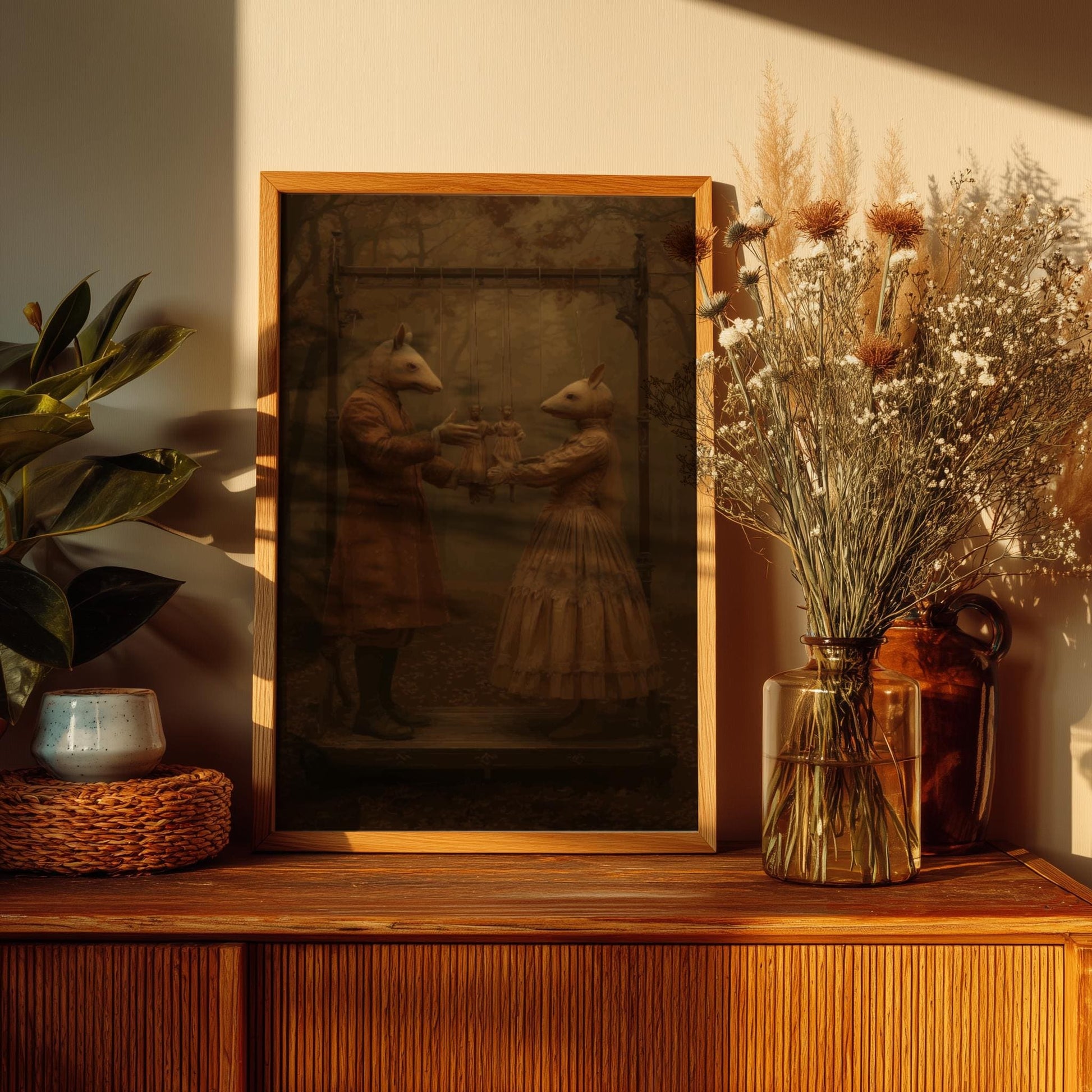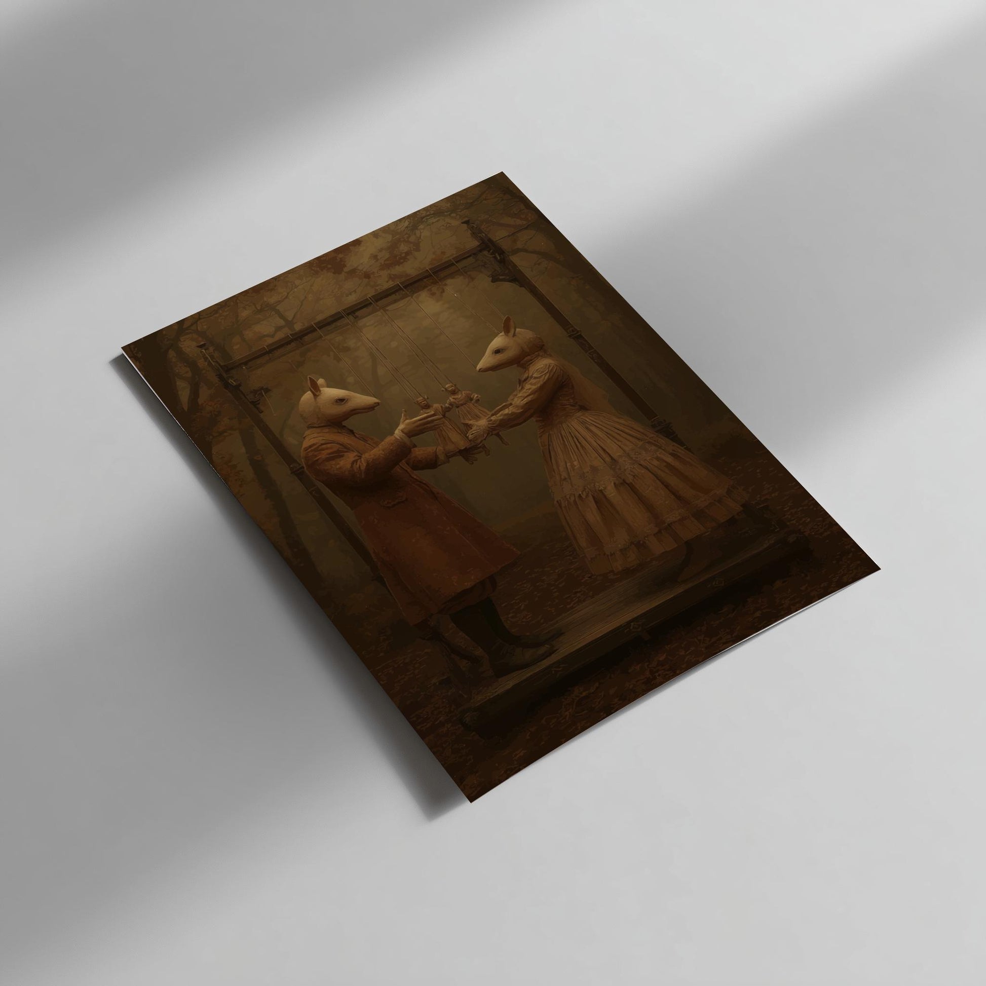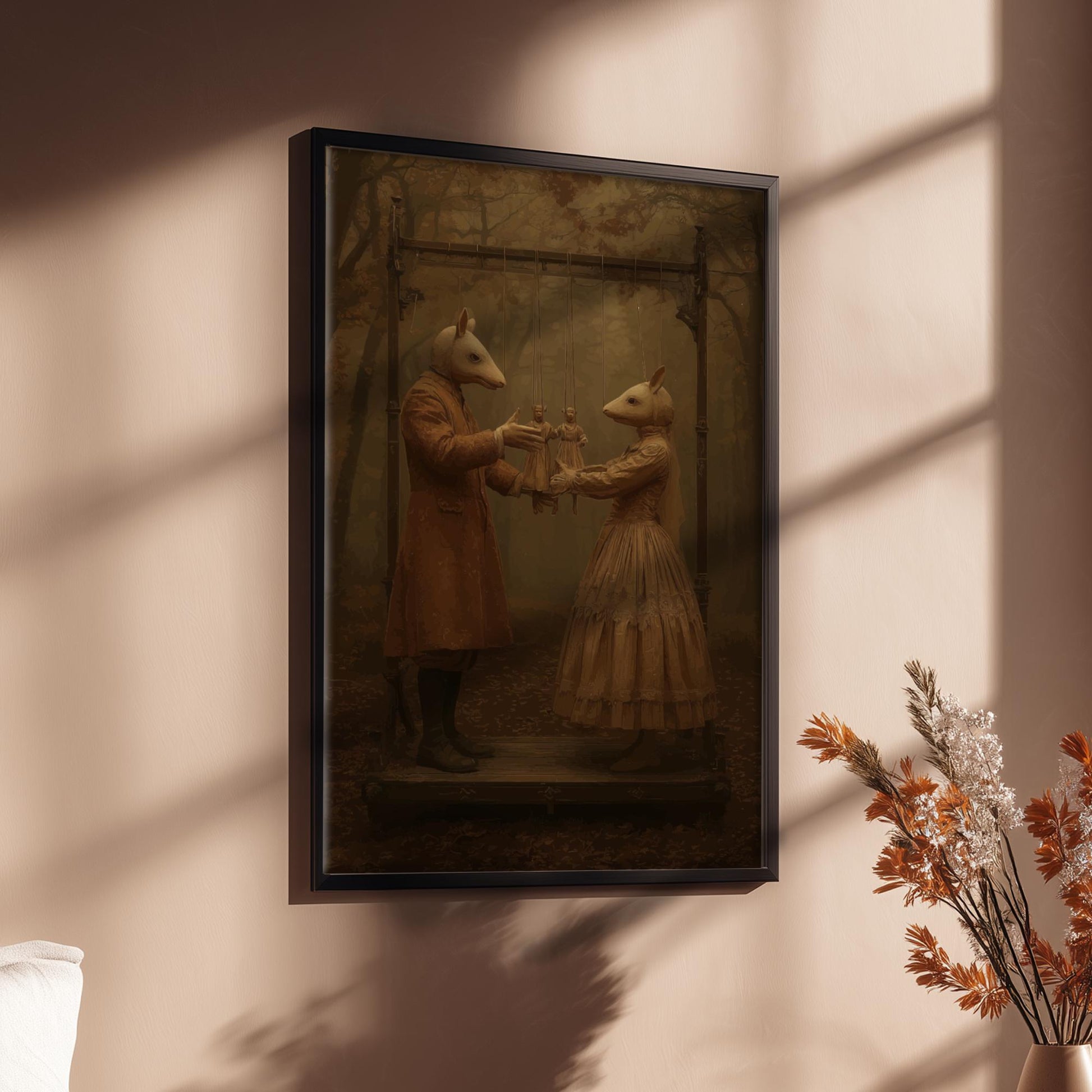 Découvrez un monde de spectacles étranges avec l'affiche « Les Marionnettistes Belettes » – Maître Marionnettiste Surréaliste . Cette affiche gothique envoûtante de théâtre forestier représente des belettes anthropomorphes en maîtres marionnettistes sinistres, mêlant fantaisie surréaliste et scénographie gothique. Parfaite pour les collectionneurs d'art animalier surréaliste, les amateurs de décoration gothique et les amateurs d'imagerie théâtrale sombre, elle capture la beauté étrange et captivante des spectacles en forêt.