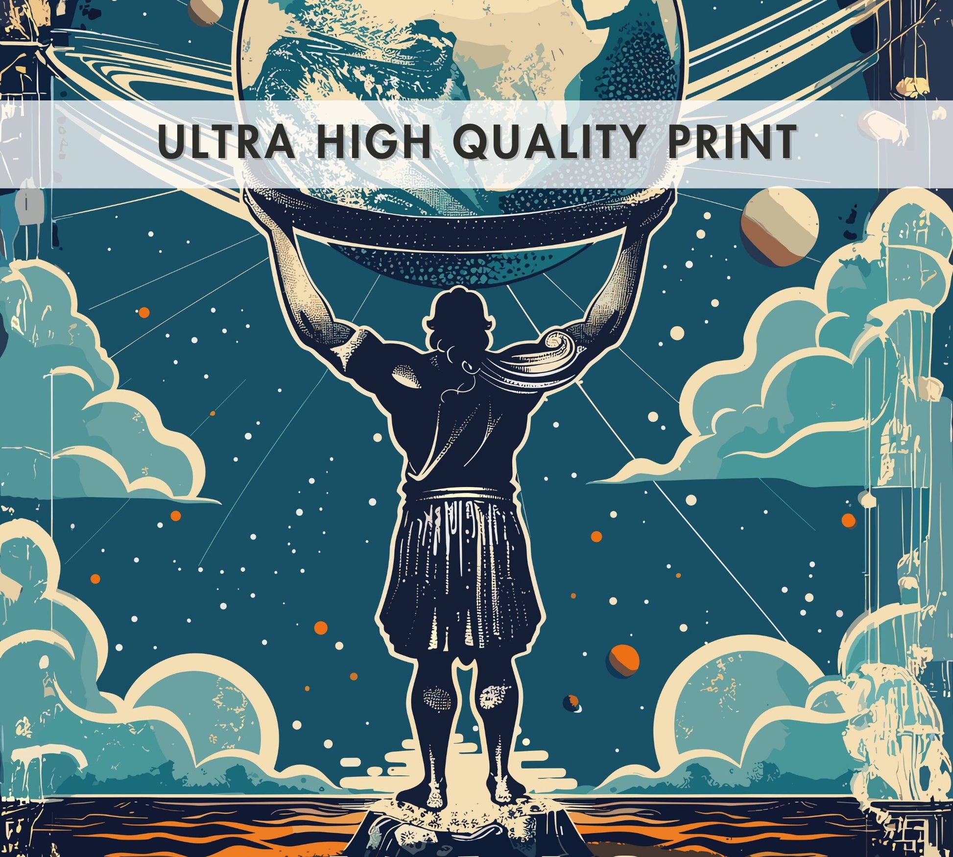 Notre affiche Titan Atlas – Œuvre d'art mythologique grecque – apportera une présence majestueuse à votre intérieur grâce à son design épique. Parfaite pour les amateurs de mythologie et de force, elle représente Atlas, le Titan condamné à dominer les cieux, gravé dans une endurance inébranlable. Que vous vénériez son histoire ou que vous aimiez l'art audacieux, cette affiche mythologique d'Atlas sera un ajout puissant à votre décoration.
