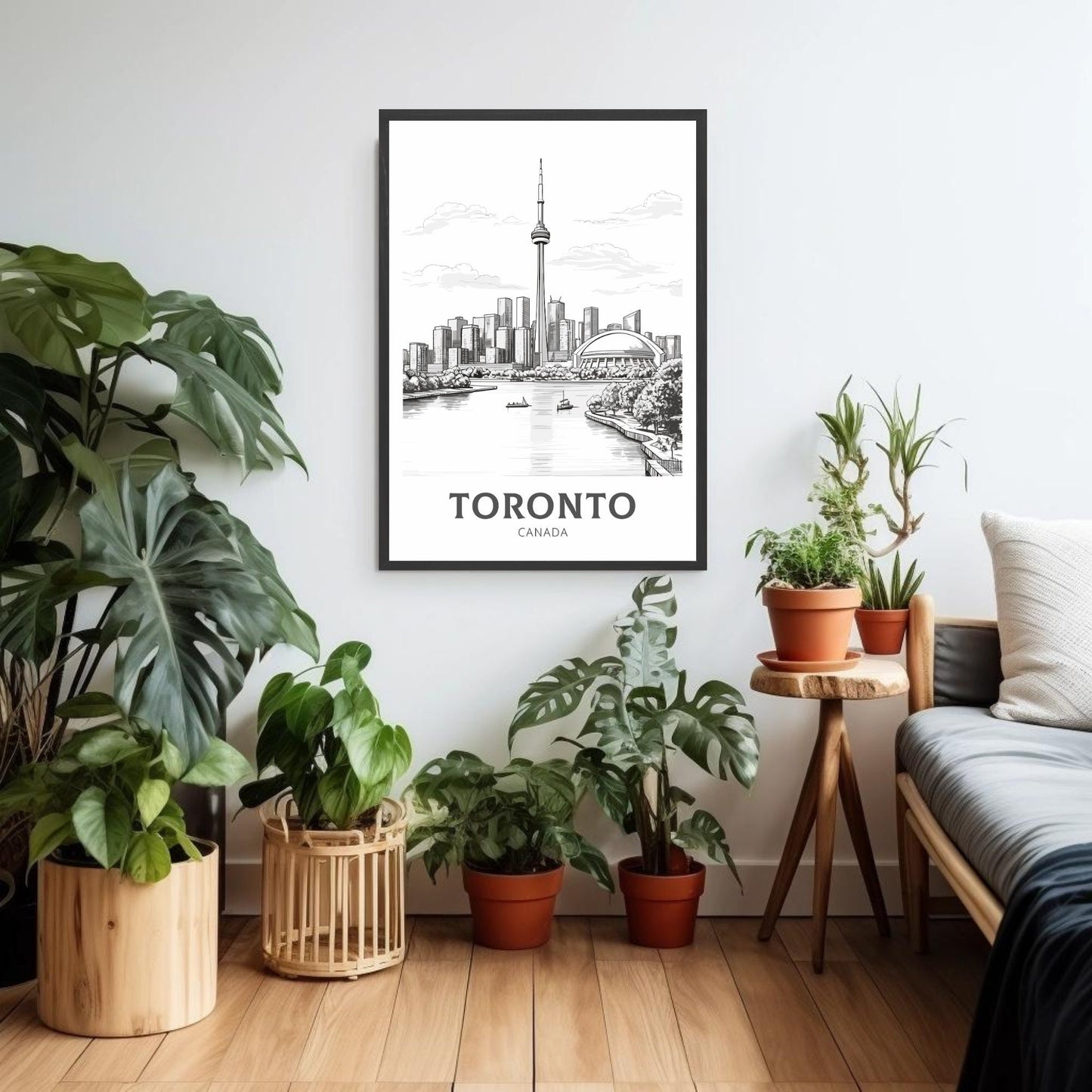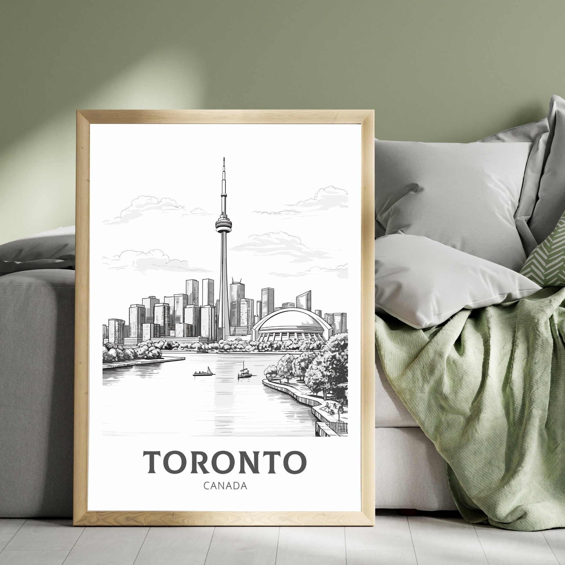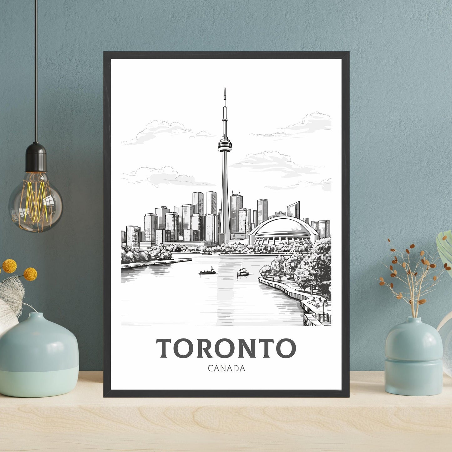 Capturez l'élégance moderne de Toronto avec cette affiche de voyage en noir et blanc . Mettant en vedette l'emblématique skyline de la ville et la Tour CN, cette œuvre monochrome allie sophistication urbaine et style minimaliste.